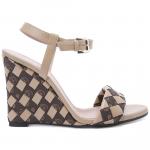 Босоножки из плетёной бежевой кожи из летней коллекции итальянского бренда Pollini. Модель на танкетке высотой 110 мм. Подошва и стелька с фирменным логотипом выполнены из натуральной кожи.