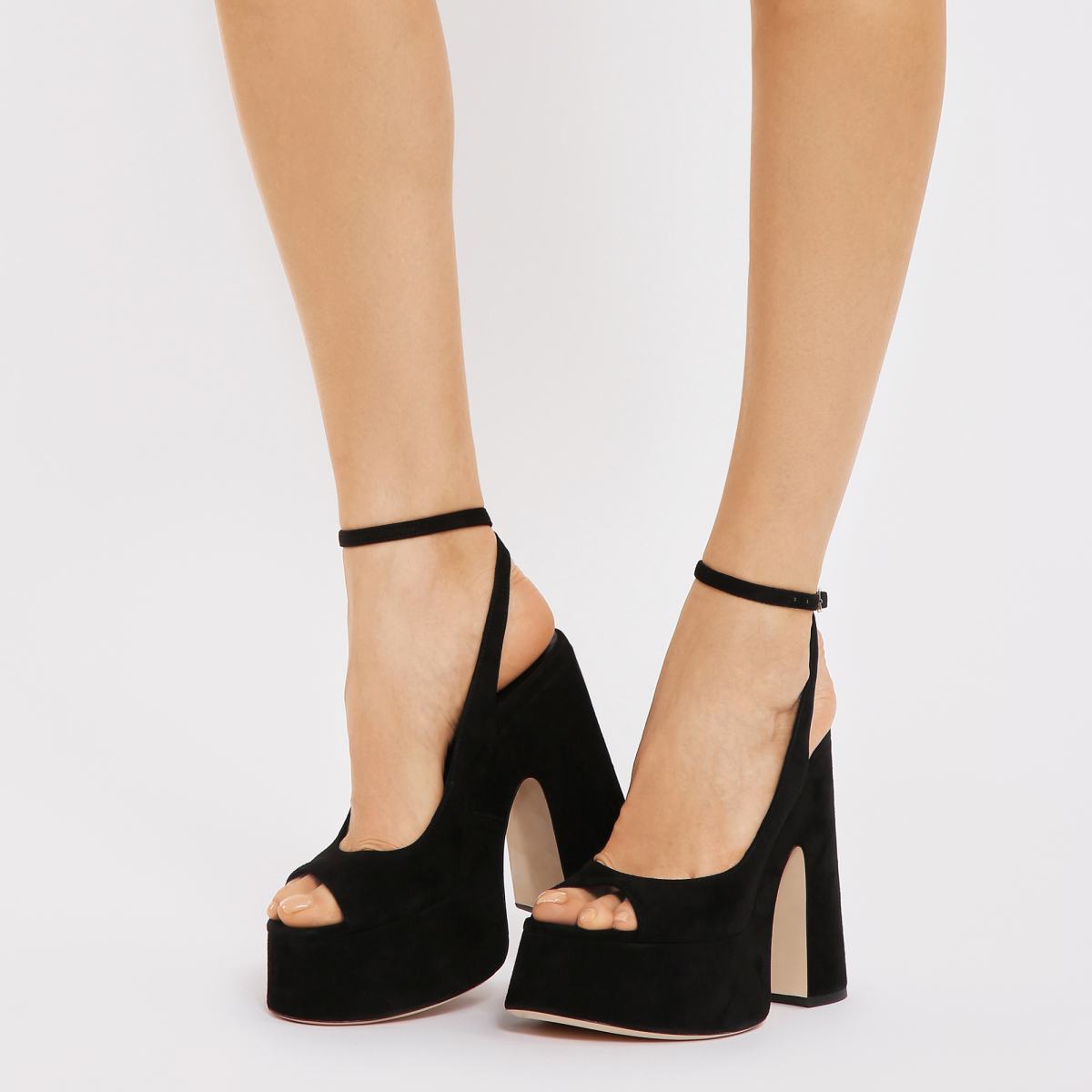 Босоножки на платформе от VIC MATIE'. Стильная модель выполнена из чёрной мягкой замши, с тонким ремешком вокруг щиколотки. Эффектный блочный каблук дополняет сверхлёгкая платформа, обтянутая замшей в цвет. Подошва и стелька выполнены из натуральной кожи.