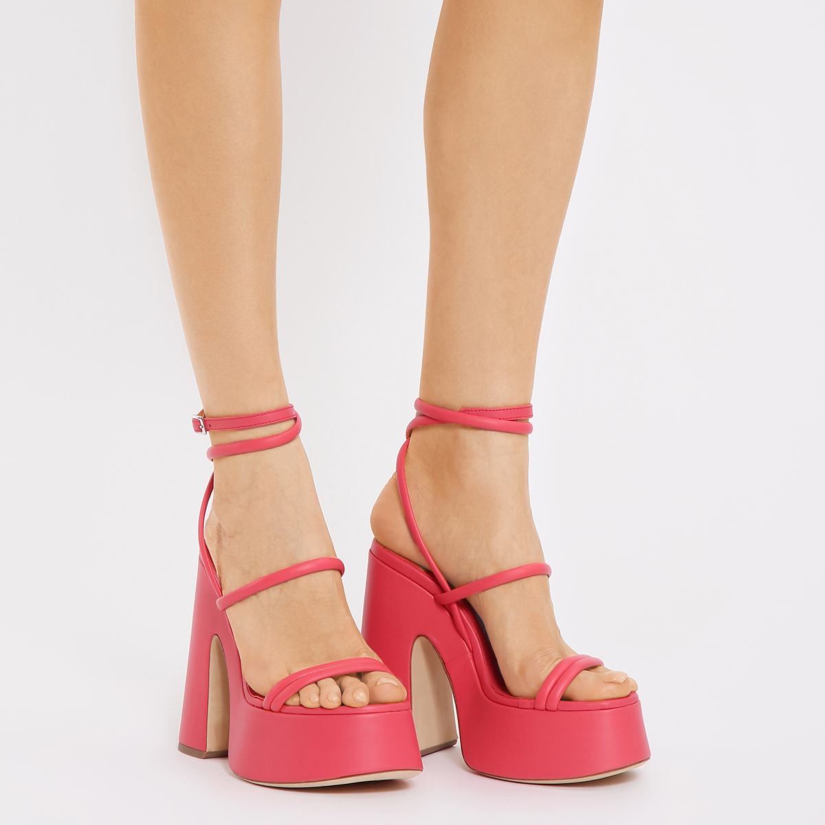 Босоножки из натуральной кожи в ярко-розовом цвете от VIC MATIE'. Пара выполнена из мягкой кожи наппа. Кожаная подошва и стелька, а так же зауженная платформа, обтянутая кожей в цвет, создают единый образ. Стильные босоножки идеально подойдут к летнему платью или широким светлым брюкам. Высота каблука - 150 мм.