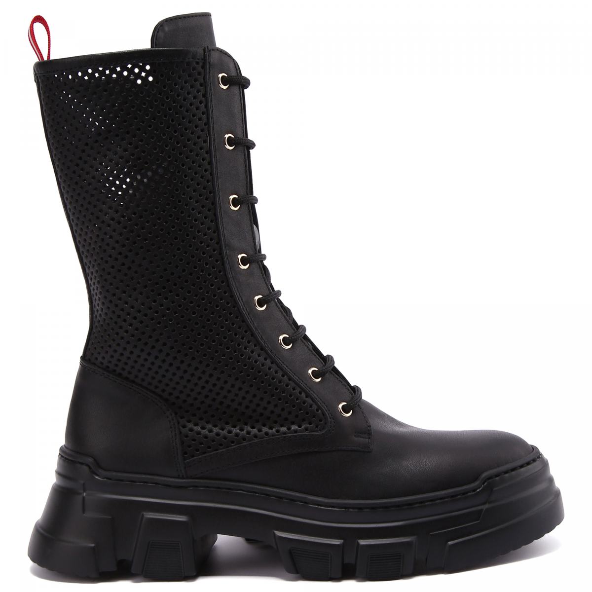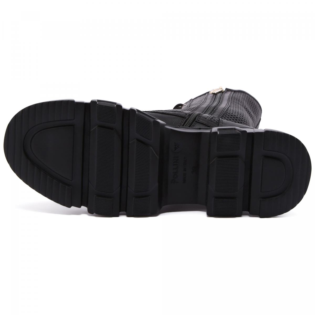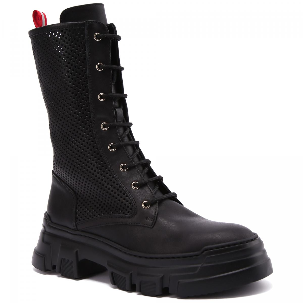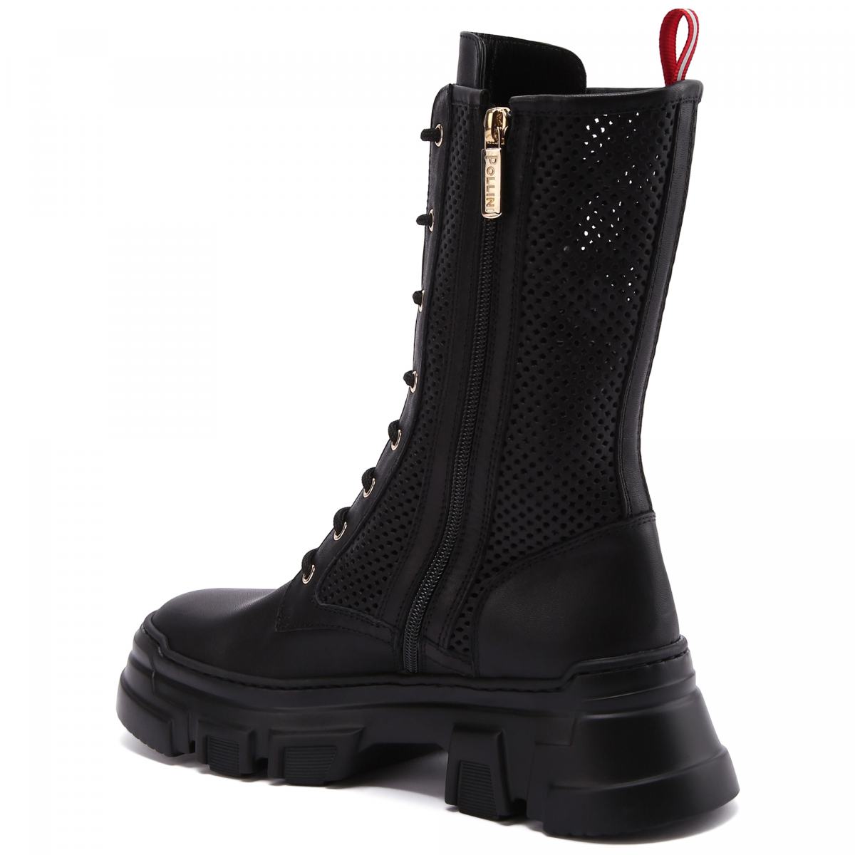 Высокие ботинки из мягкой кожи от Pollini. Армейские ботинки, созданные специально для новой коллекции весна-лето итальянскими дизайнерами, отличаются сквозной перфорацией. Модель дополнена текстильной шнуровкой в цвет и удобной застёжкой-молнией сбоку, благодаря которой их быстро и удобно надевать. Высокая подошва с фигурными вставками и протектором выполнена из резины. Подкладка и стелька - из мягкой натуральной кожи.