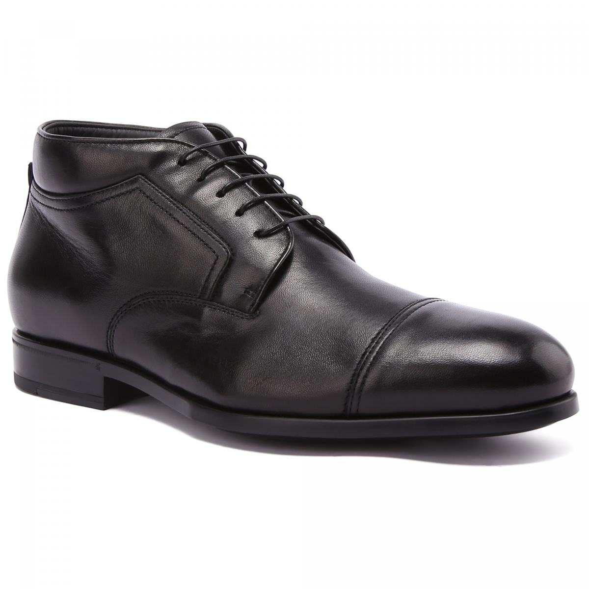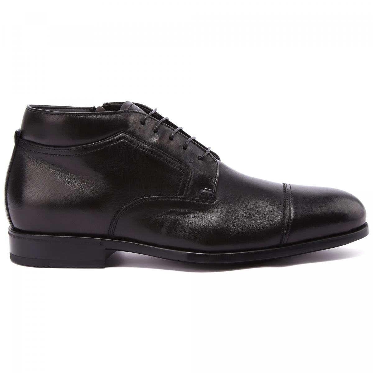 Ботинки из натуральной кожи в строгом дизайне - обязательный must have офисного осеннего стиля. Модель выполнена из гладкой чёрной кожи, с классическим отрезным носком и шнуровкой на пять отверстий. Эта модель прекрасно подойдёт к деловому образу с брюками и пиджаком. Гибкая подошва выполнена из резины, подкладка и стелька - из натурального меха.