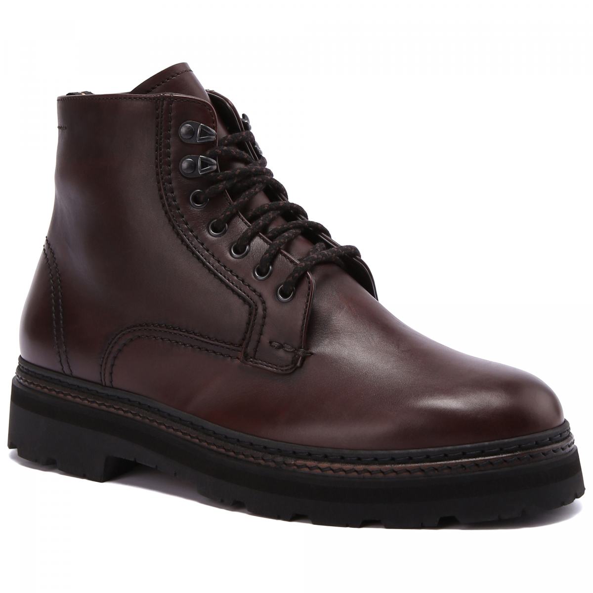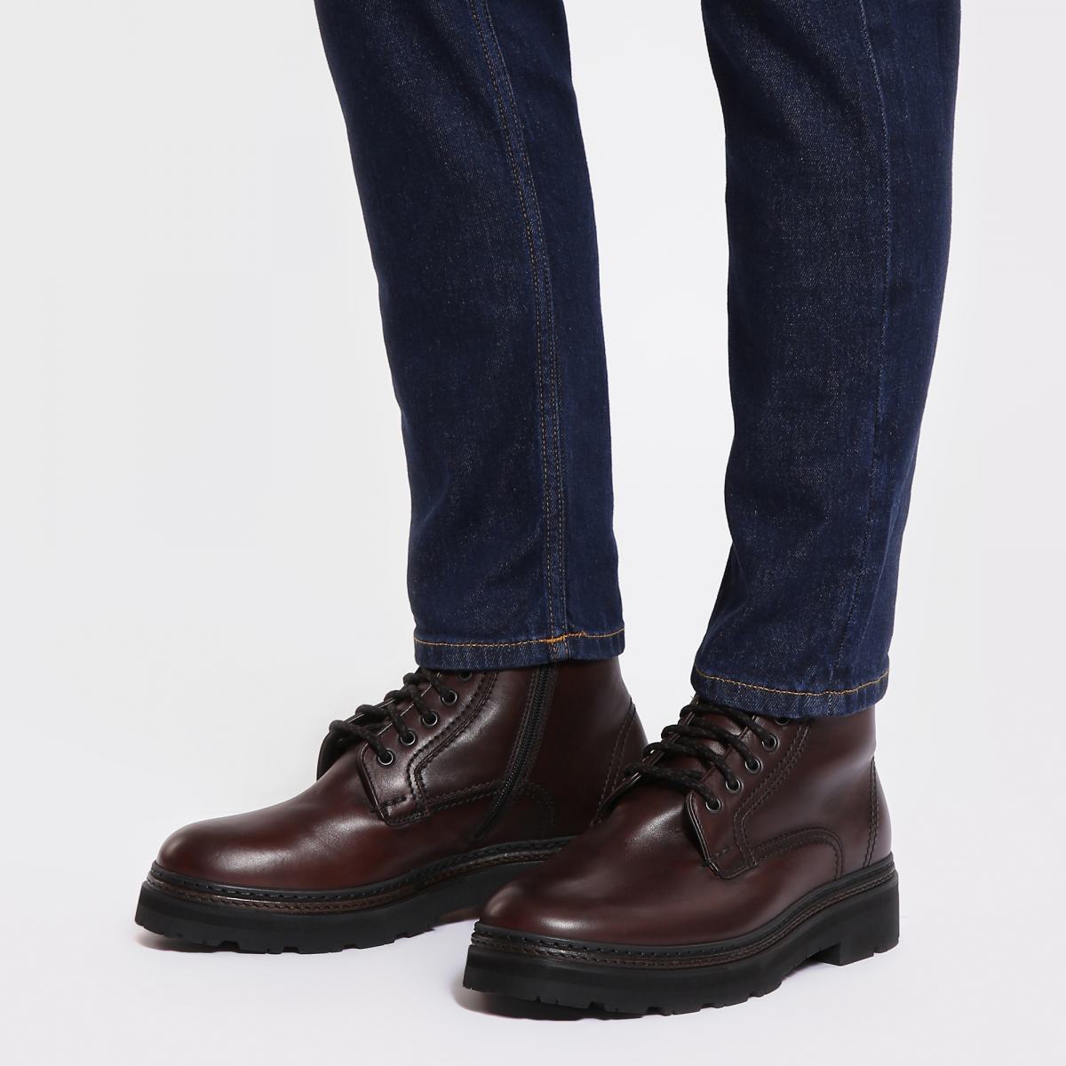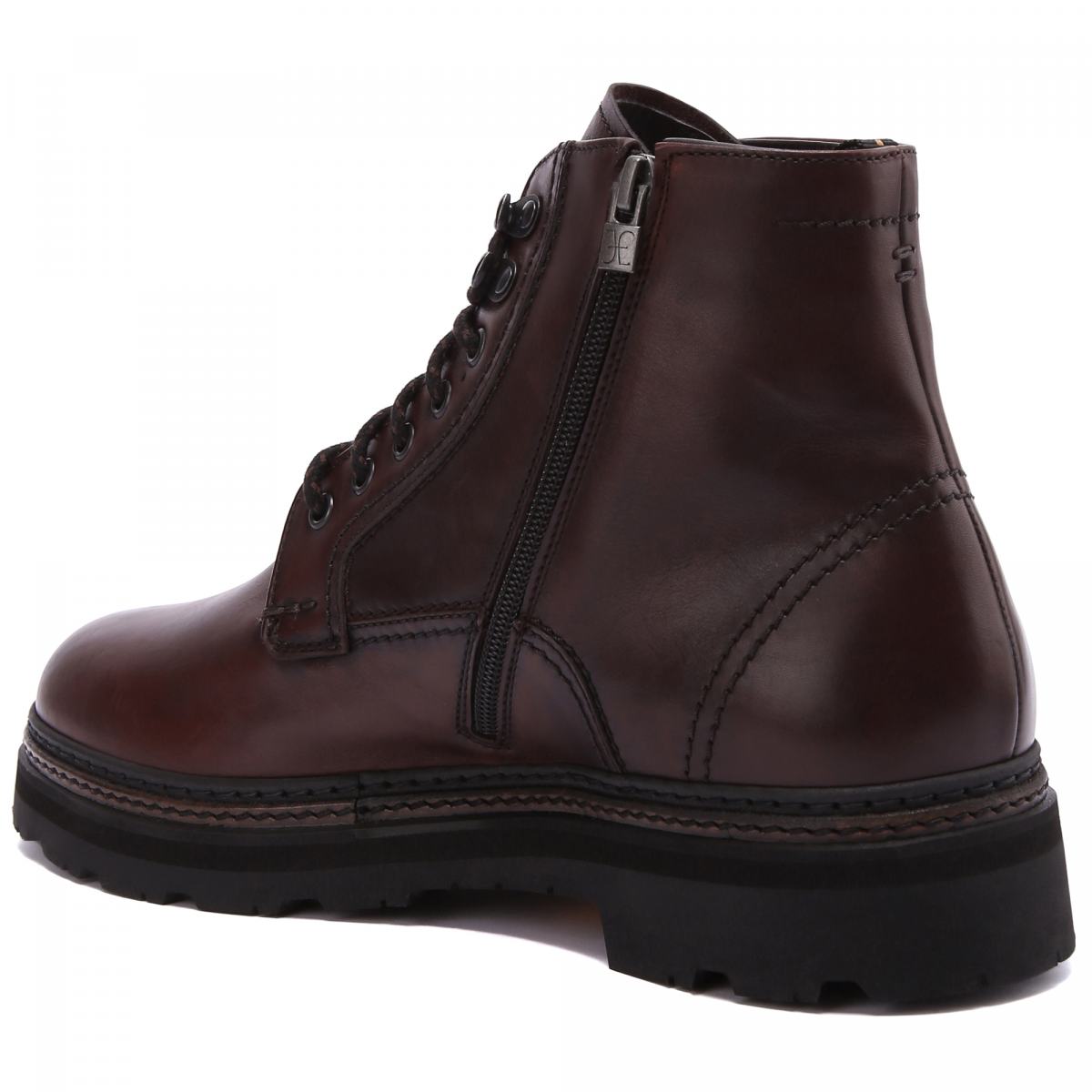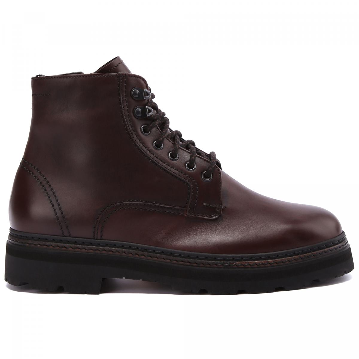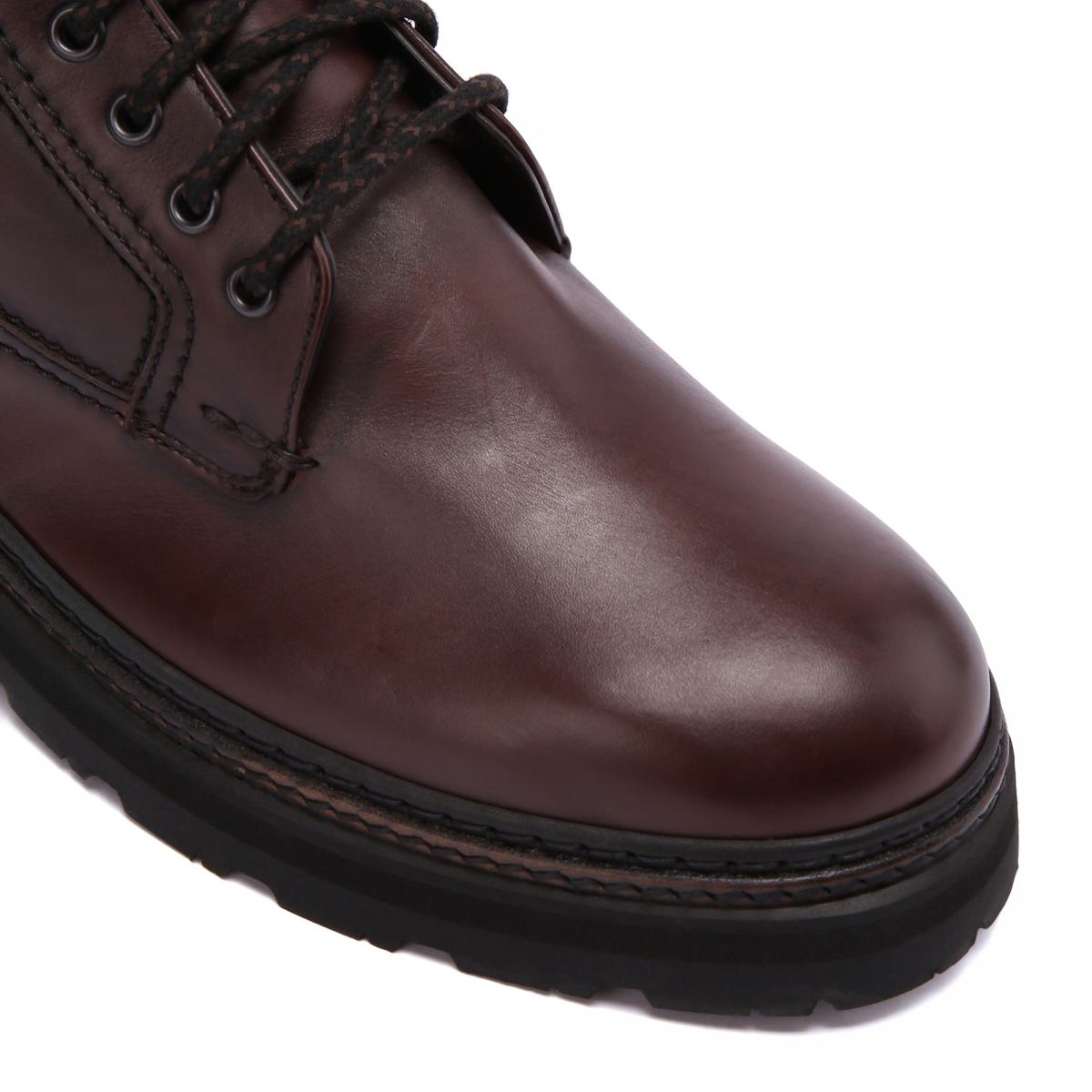 Коричневые ботинки на массивной подошве — лучший вариант для зимнего гардероба. Модель выполнена из натуральной кожи, внутри подклад и стелька из натурального меха. Ботинки застёгиваются на молнию, при этом шнуровкой можно регулировать посадку. Высота ботинок позволит легко сочетать их с брюками и джинсами любых фасонов.