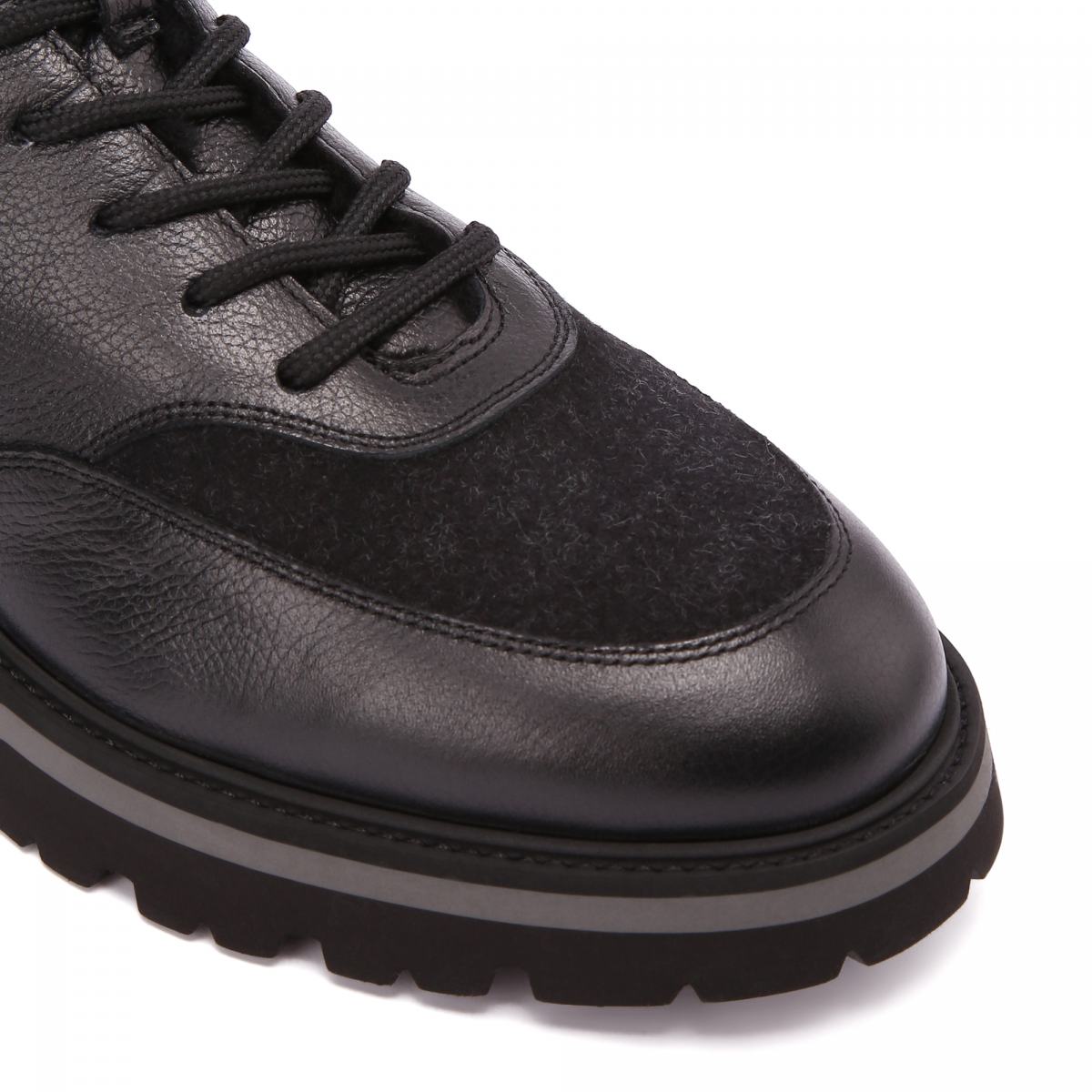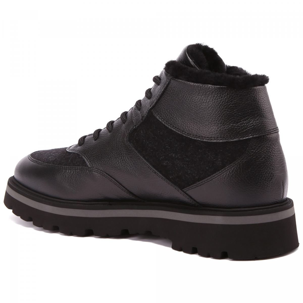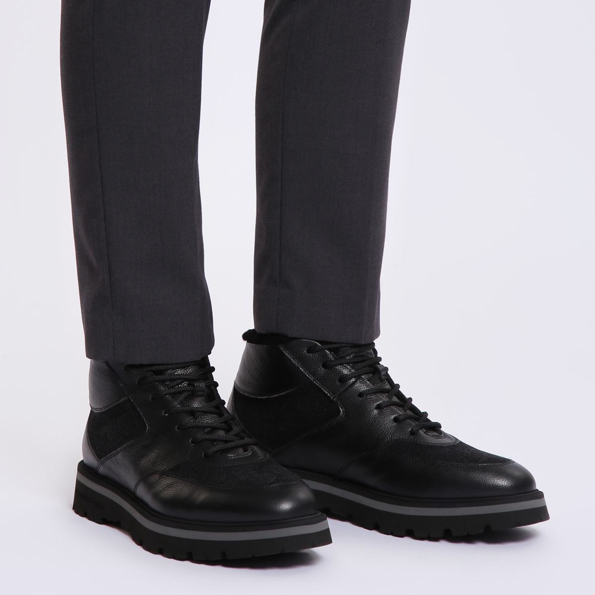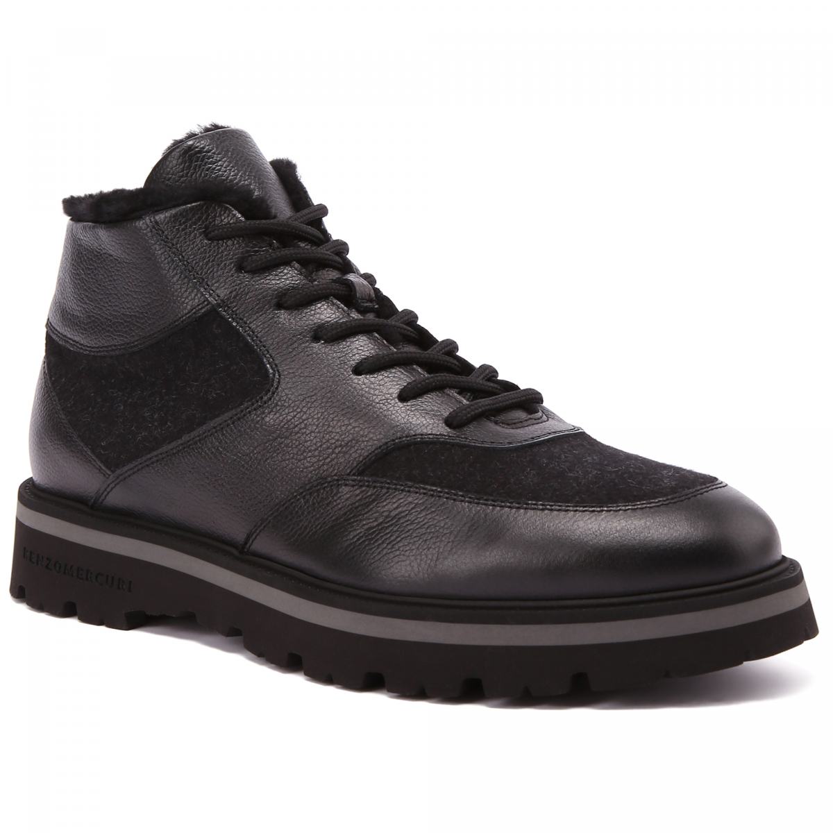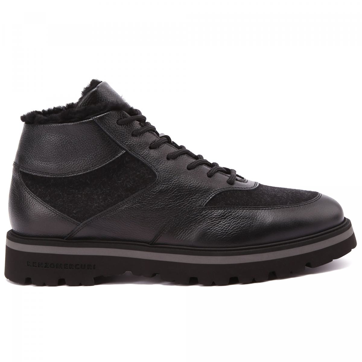 Высокие ботинки в базовом чёрном цвете из зимней коллекции Renzo Mercuri. Утеплённые ботинки идеально подойдут для холодного времени года. Верх комбинированный, из натуральной кожи и тёплой шерстяной ткани. Высокая резиновая подошва с внедорожным протектором позволит пройти по любой поверхности и защитит ноги от влаги. Дизайн дополнен тонкой шнуровкой в цвет. Внутри тёплая шерстяная подкладка и стелька из шерсти.