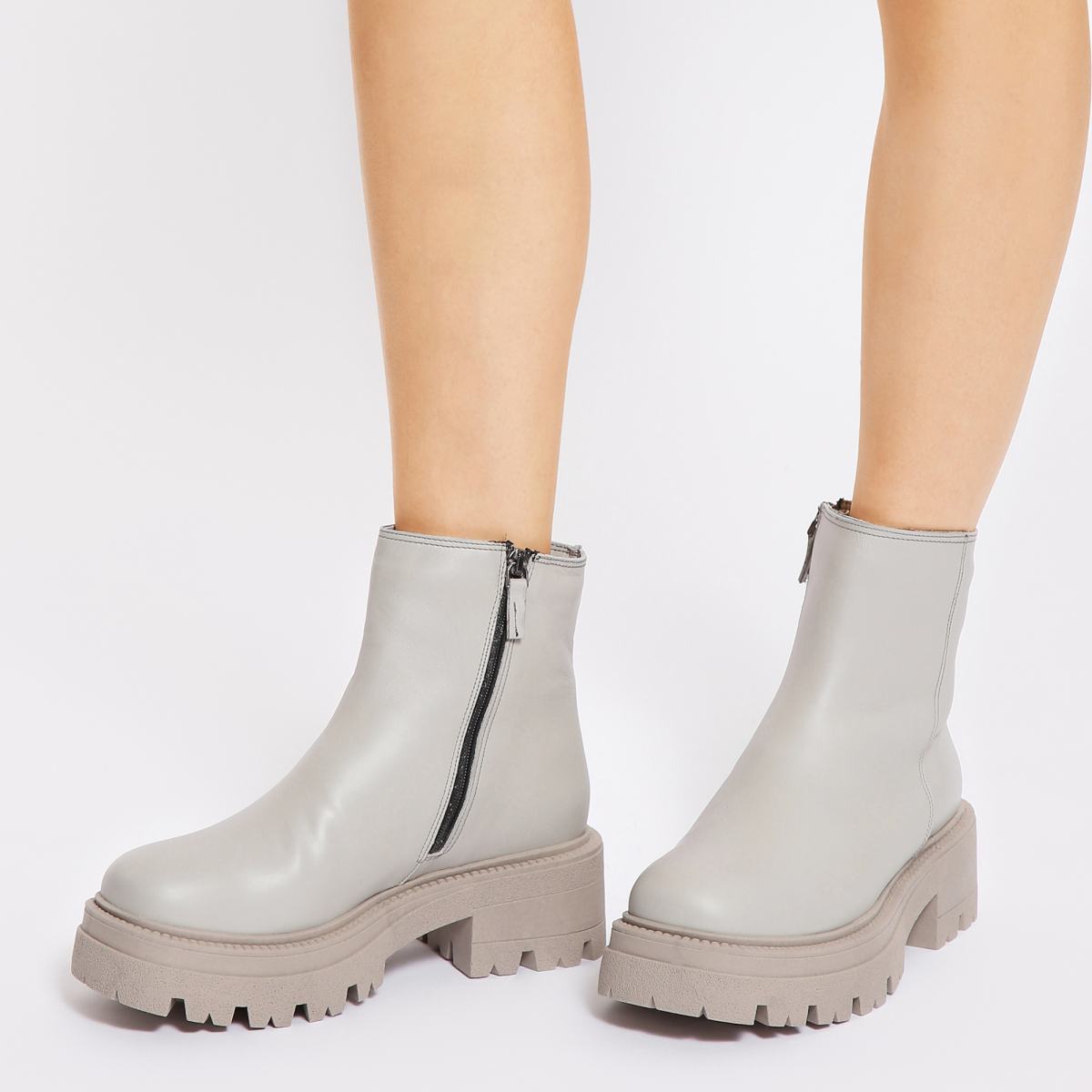 Кожаные ботинки на массивной подошве помогут создать стильный и немного дерзкий образ. Модель выполнена из натуральной кожи в сером цвете и застёгивается на молнию, расположенную сбоку. Внутри подклад и стелька из натурального меха. Резиновая подошва с выразительным протектором — самая акцентная часть пары, которая задаёт настроение. Ботинки будут отлично сочетаться как с юбками, так и с джинсами или джоггерами.