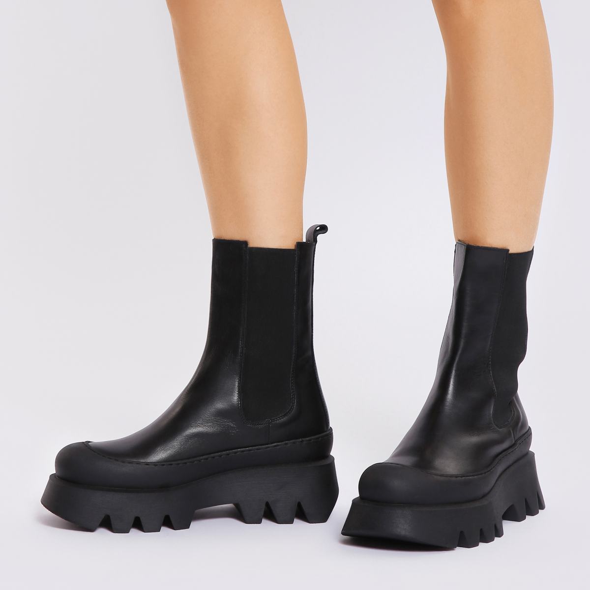 В черных ботинках на массивной подошве не страшны любые сюрпризы погоды. Модель выполнена из натуральной кожи, при этом зона над подошвой дополнена прорезиненной вставкой, чтобы защитить стопу от влаги и грязи. Внутри подклад и стелька из кожи. Эластичные вставки по бокам и петля на пятке позволят с комфортом обувать пару. Сочетайте ботинки с легинсами, широкими брюками, а также с юбками и платьями в повседневном стиле.