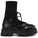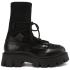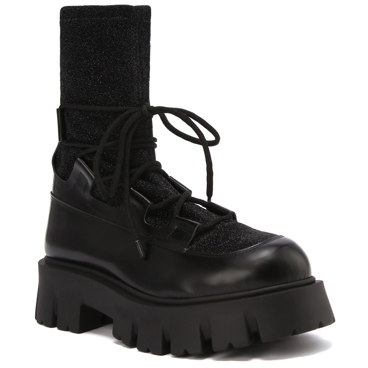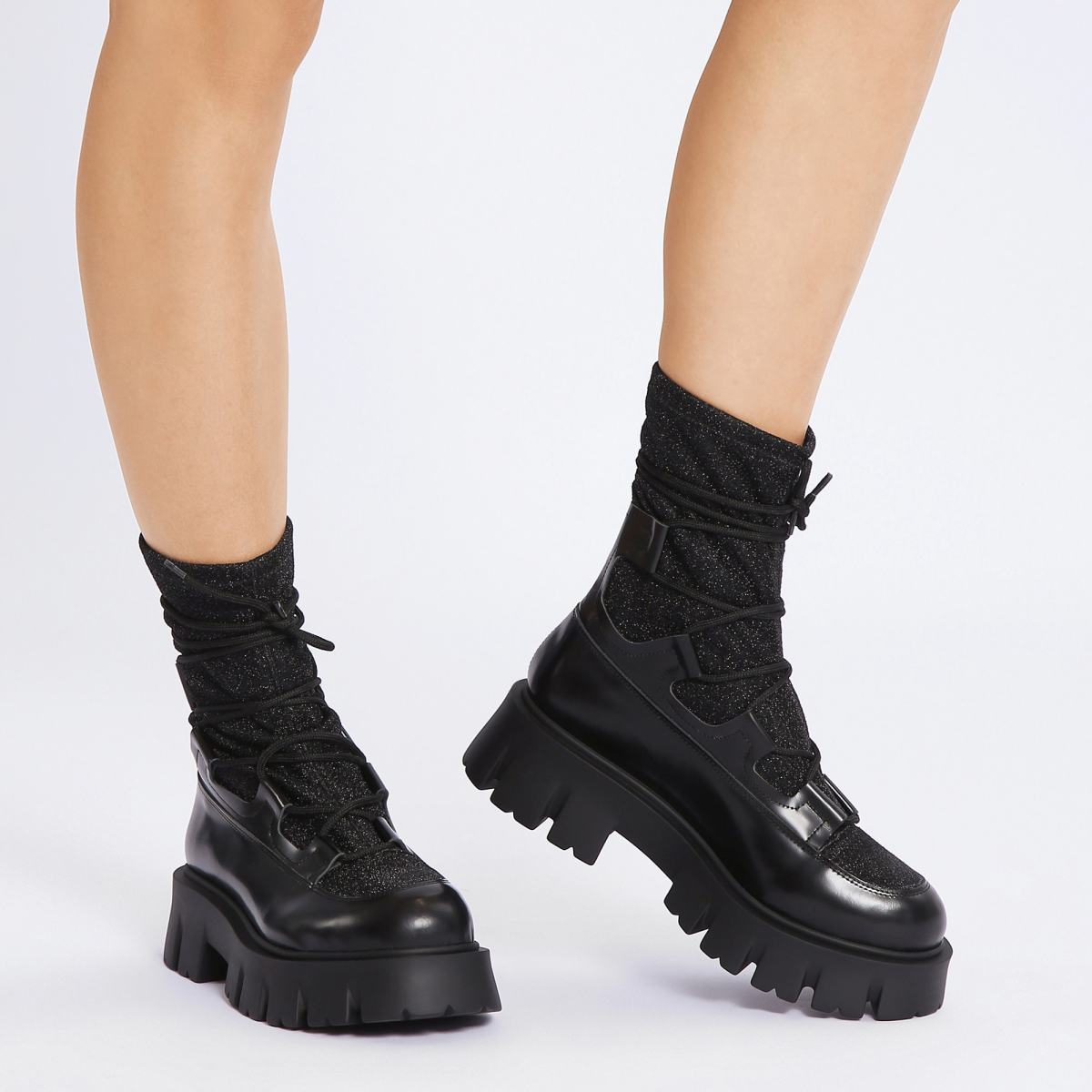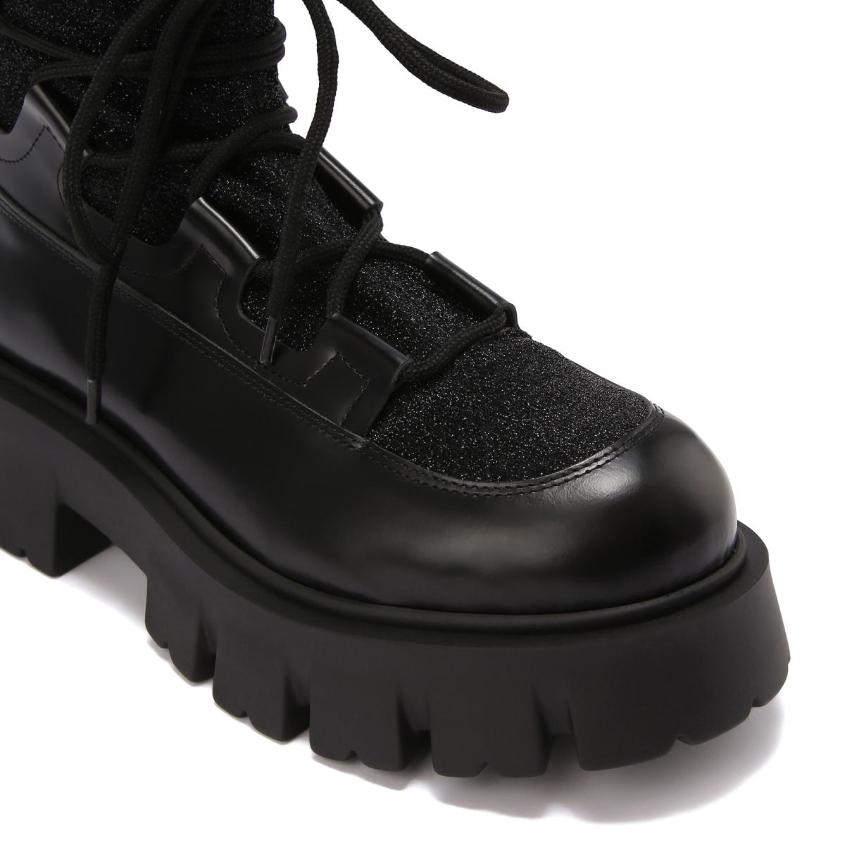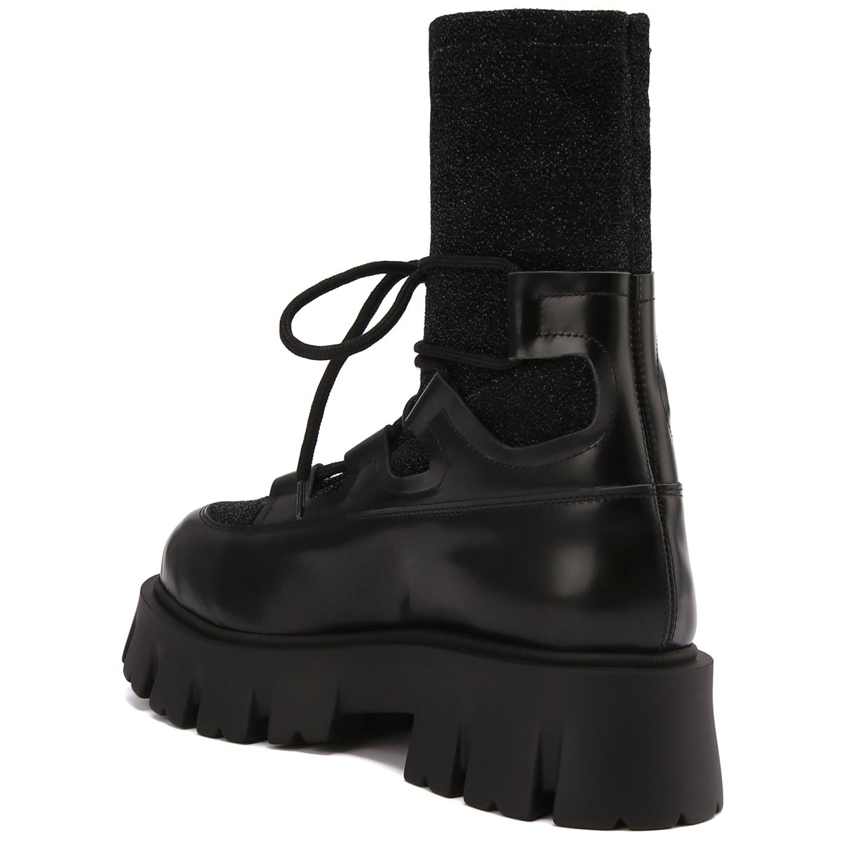 Комбинированные ботинки в чёрном цвете добавят разнообразия в повседневные образы. Модель выполнена из текстиля и кожи, на резиновой подошве. Внутри пара утеплена подкладом и стелькой из шерсти. Посадку регулирует шнуровка, которая также станет эффектным акцентом в любом образе.
