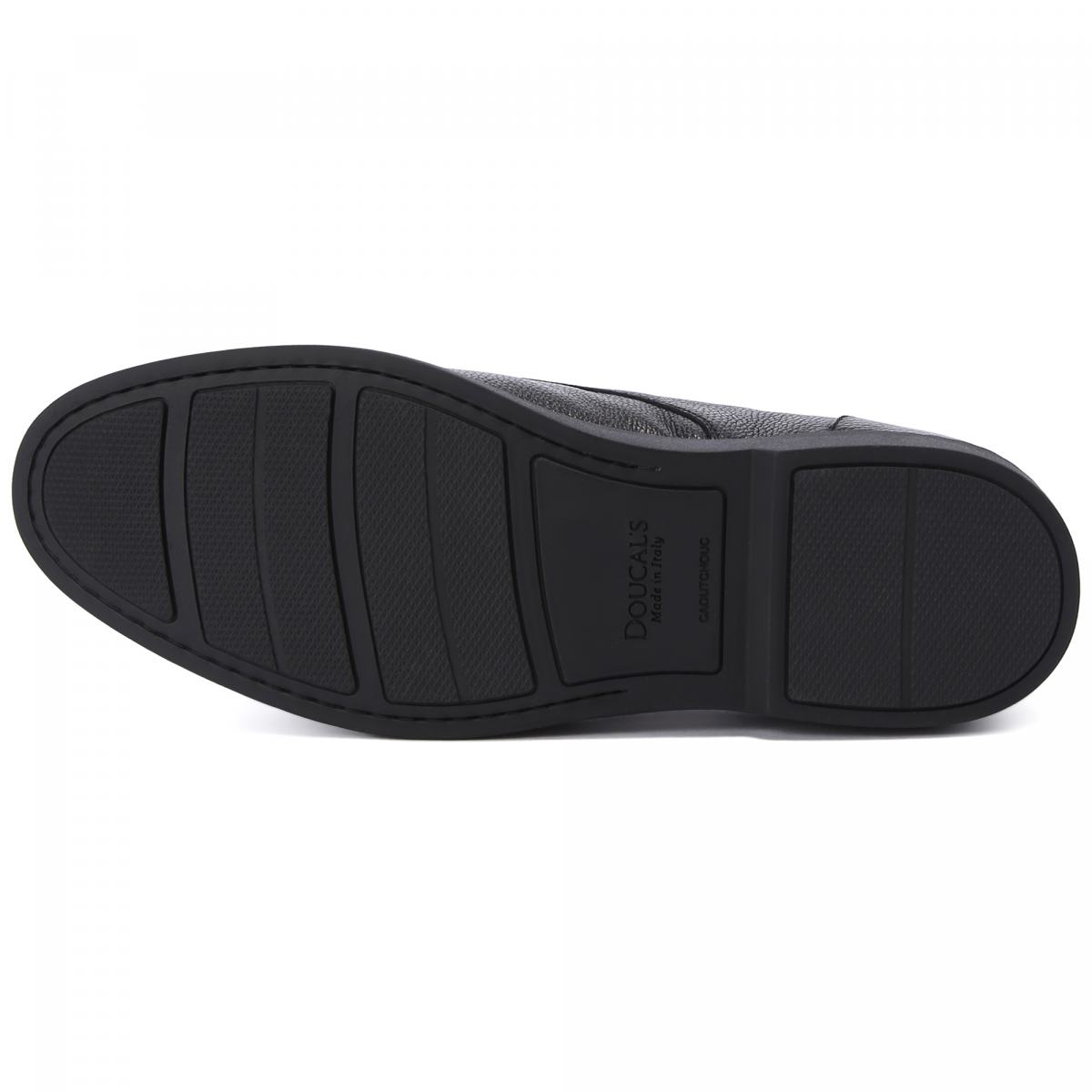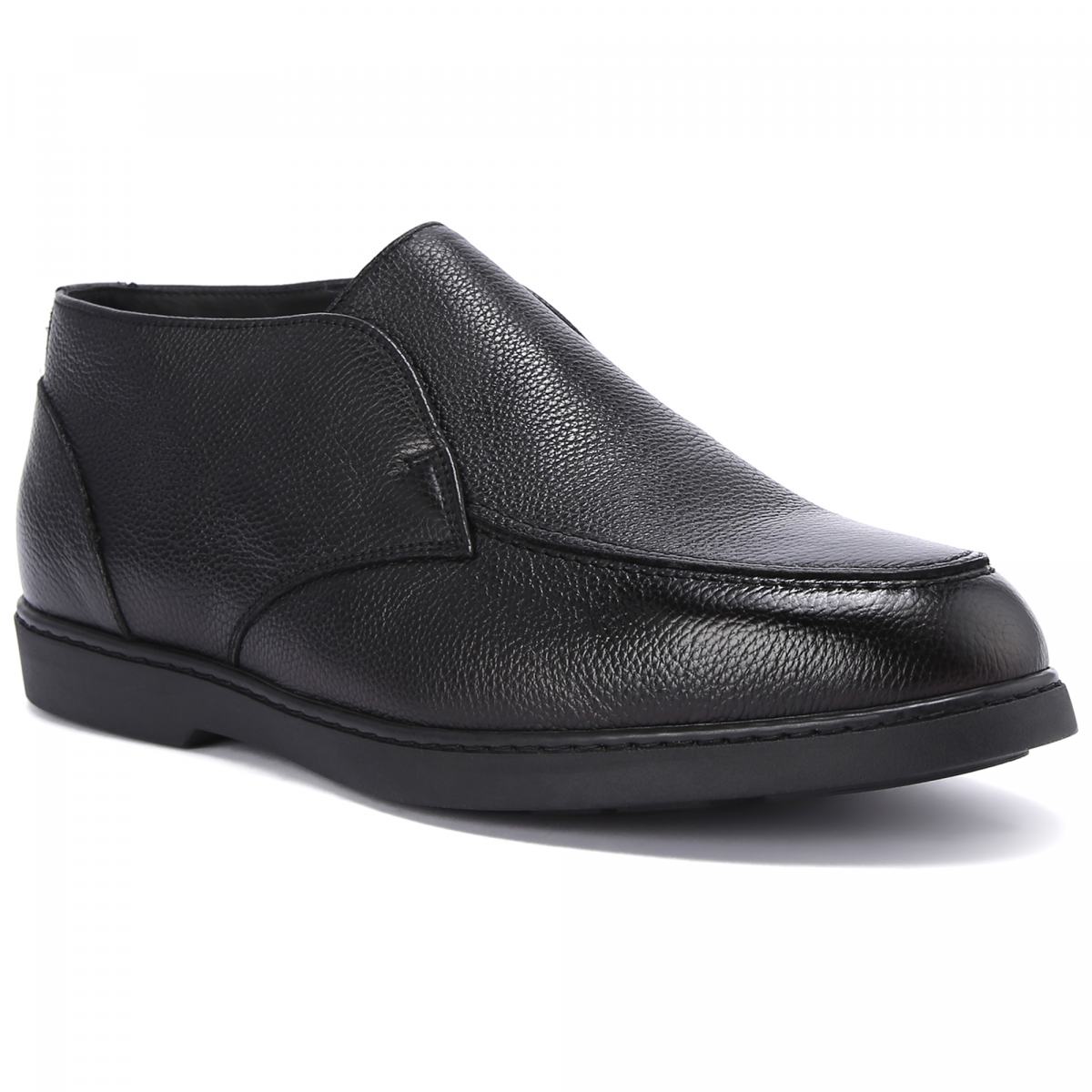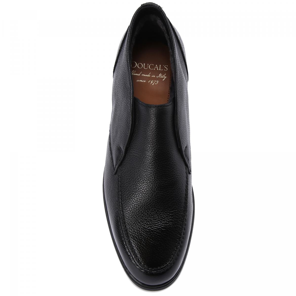 Ботинки из натуральной чёрной кожи от Doucal’s. Очень комфортные ботинки дополнят как деловые, так и повседневные осенние образы. Верх выполнен из натуральной зернистой кожи, внутри тёплая подкладка и стелька из натурального меха. Гибкая подошва в чёрном цвете выполнена из резины.