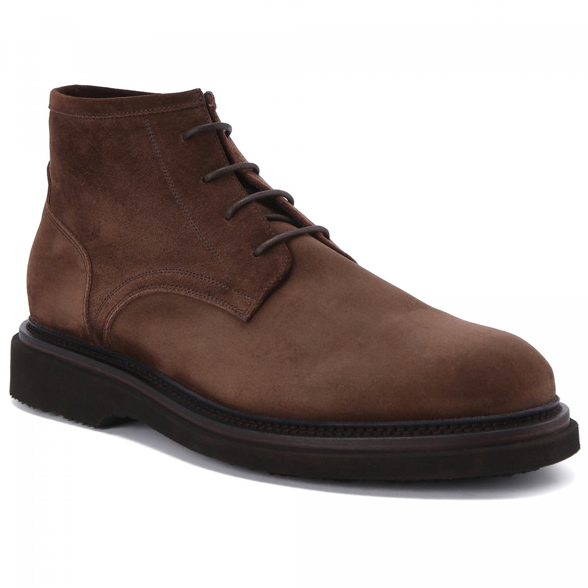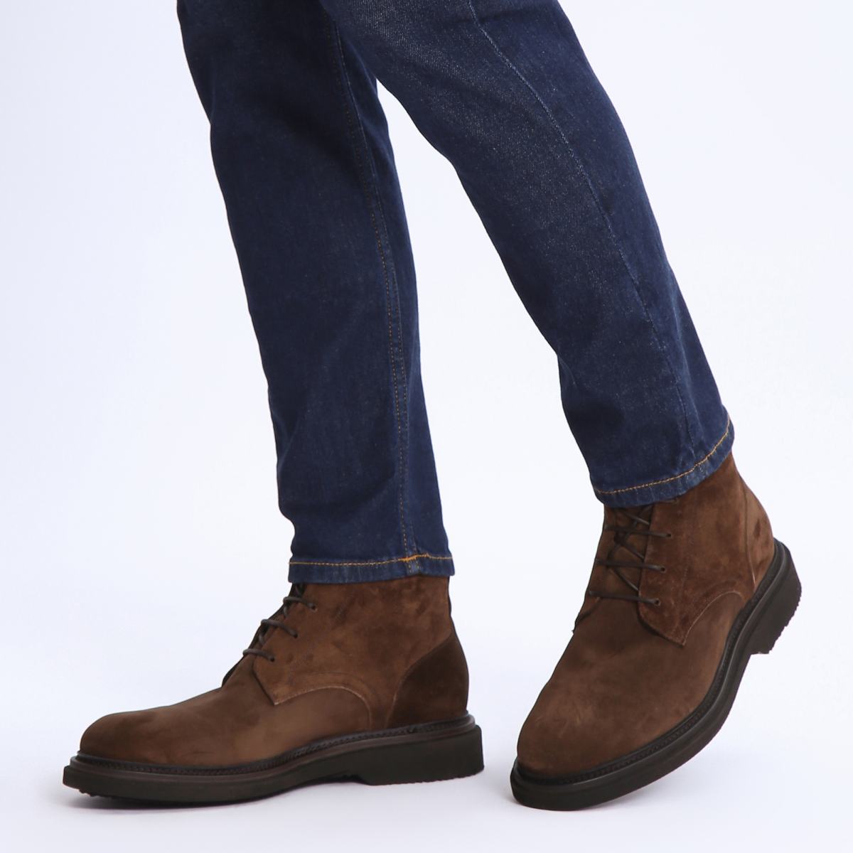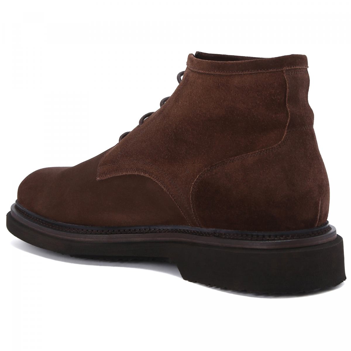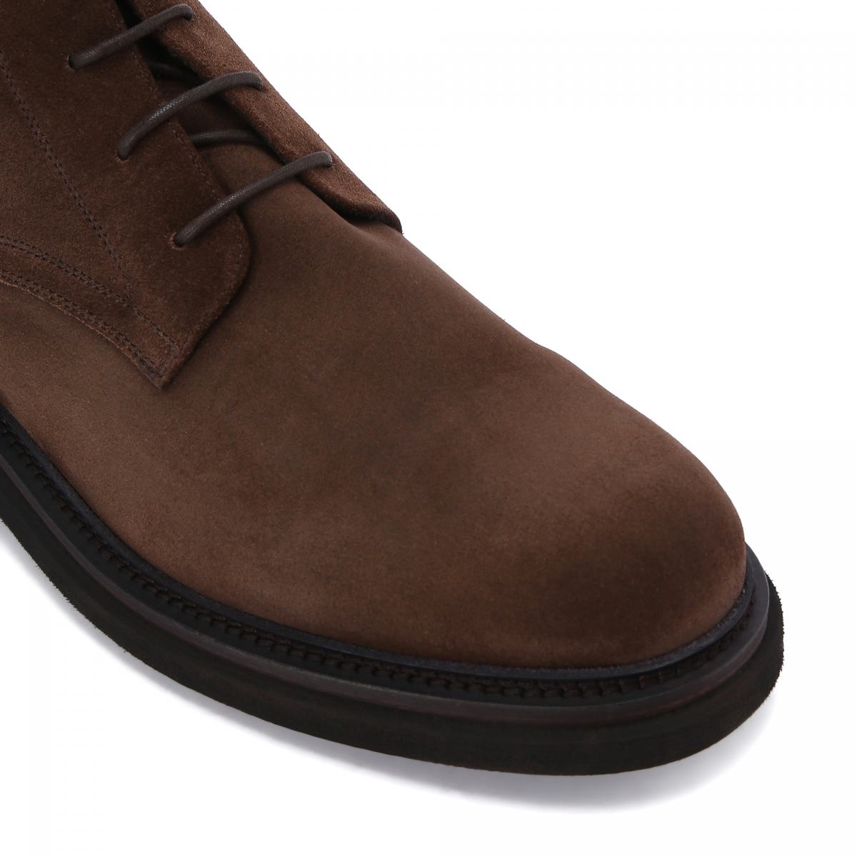 Ботинки из тёмно-коричневой замши из зимней коллекции Pantanetti. Пара в классическом цвете подойдёт как к повседневным, так и к деловым образам. Верх из натуральной замши дополнен шнуровкой в цвет. Подкладка и стелька утеплённые, из натурального меха. Подошва с небольшим каблуком выполнена из резины.