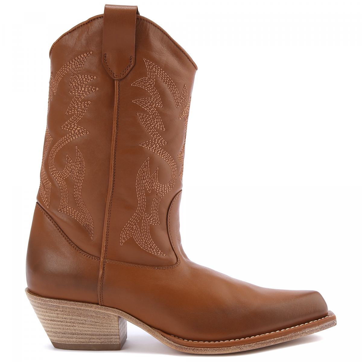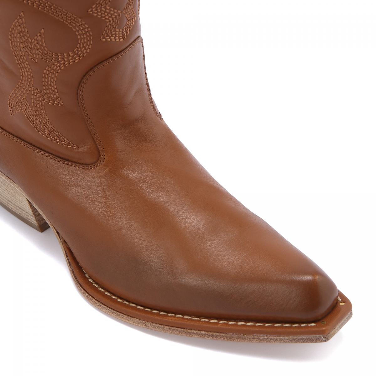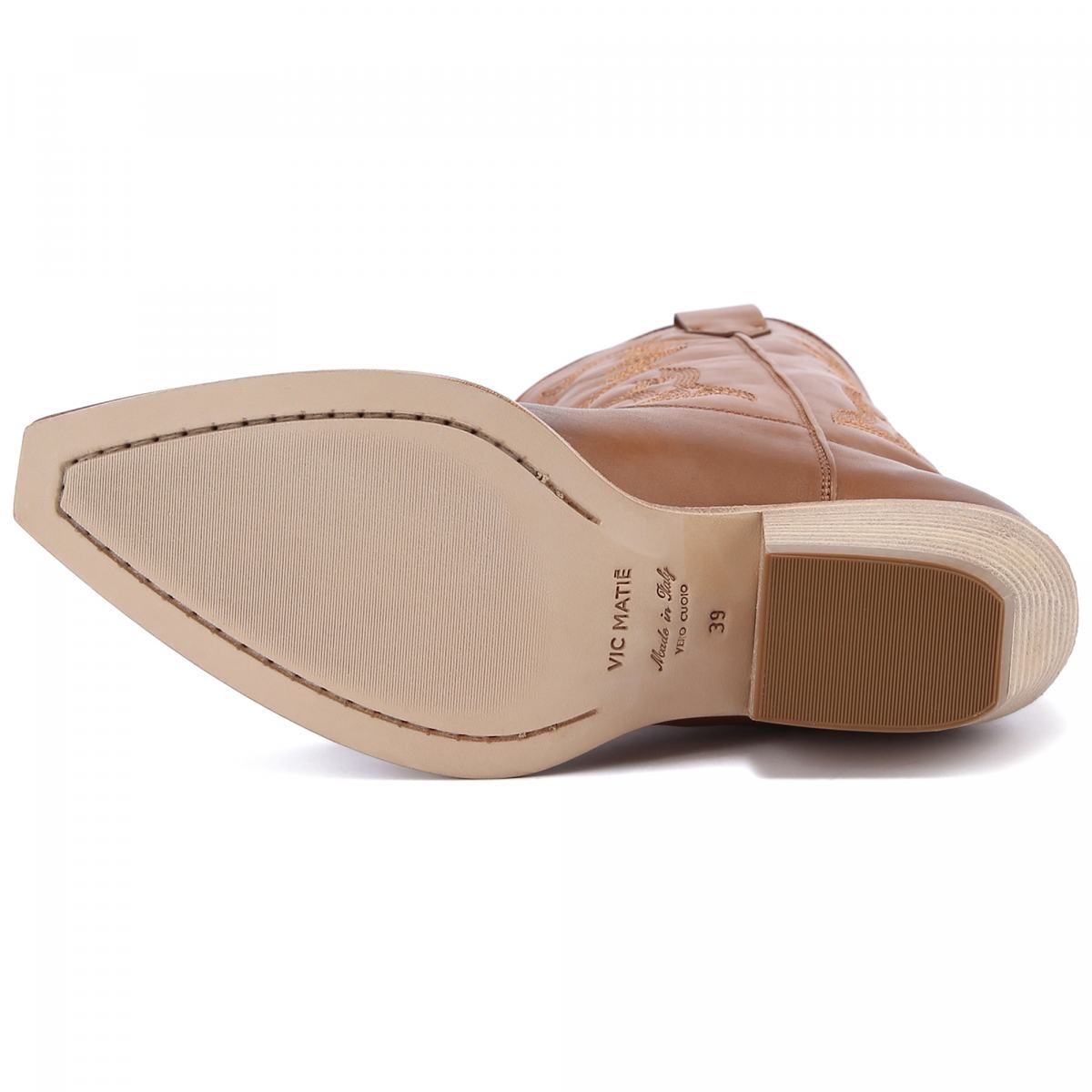 Ботильоны из кожи в коричневом цвете от VIC MATIE’. Ботинки в стиле вестерн выполнены из коричневой телячьей кожи с вышивкой в тон на голенище и петлями по бокам для удобства надевания. Кожаная подошва с кожаным рантом, внутри стелька из натуральной кожи.