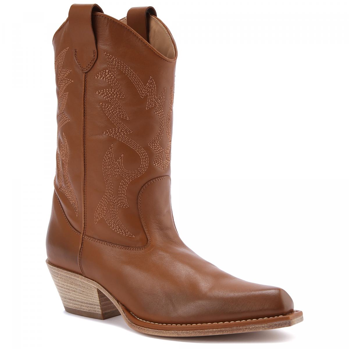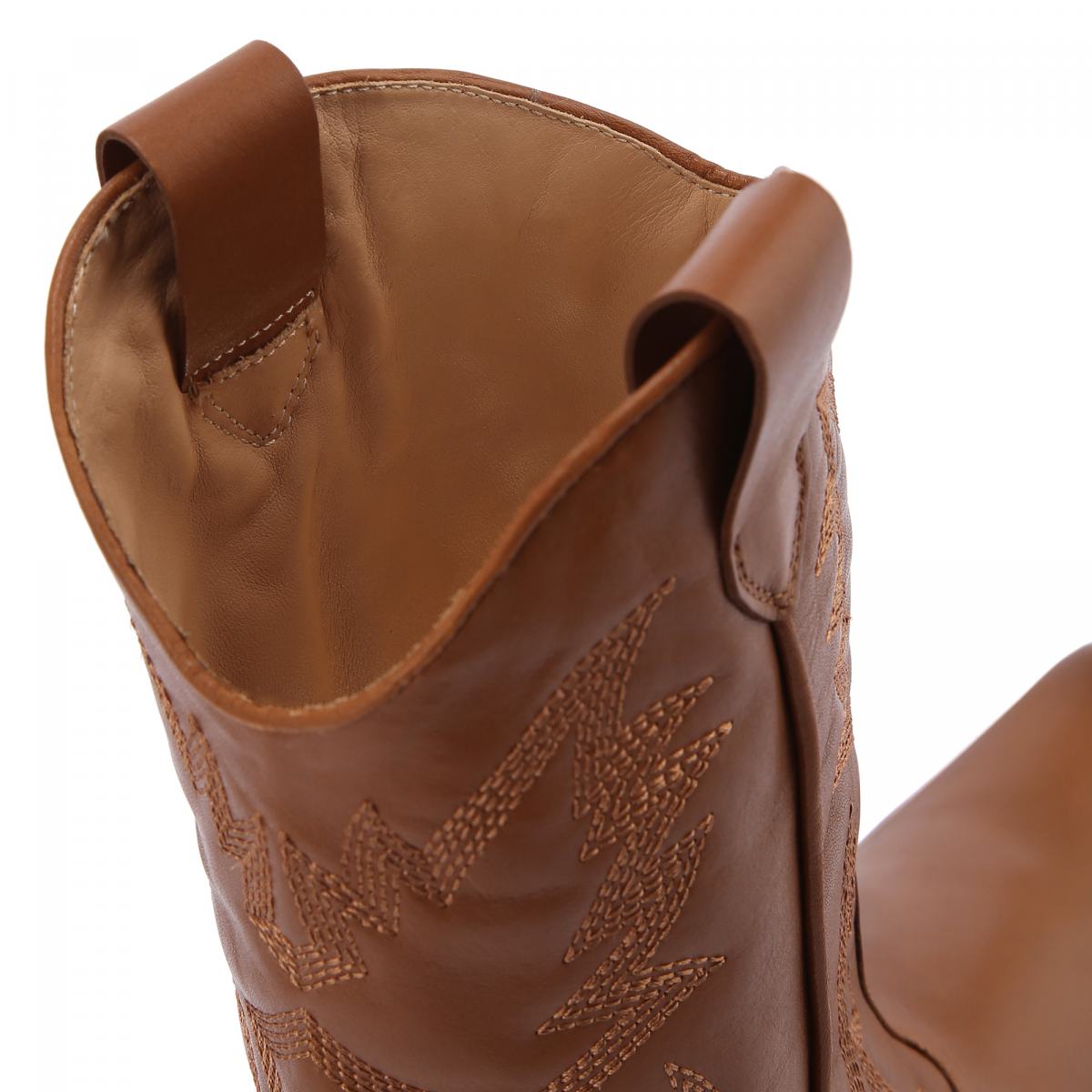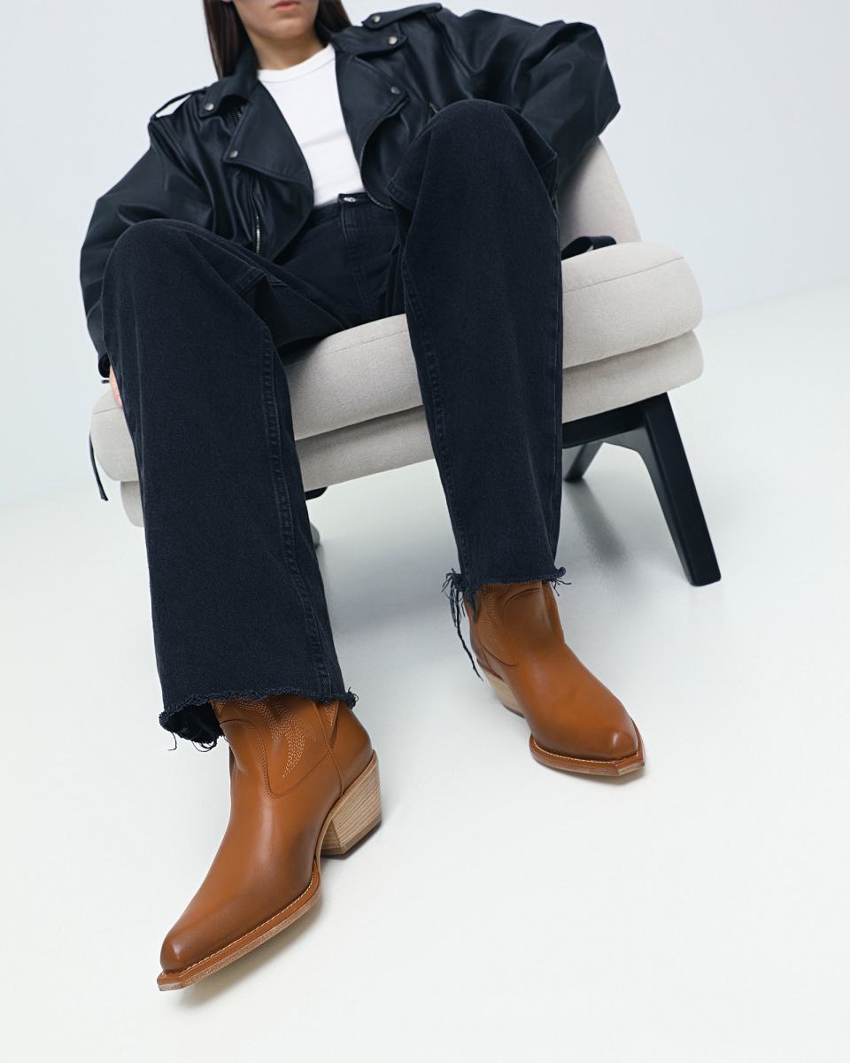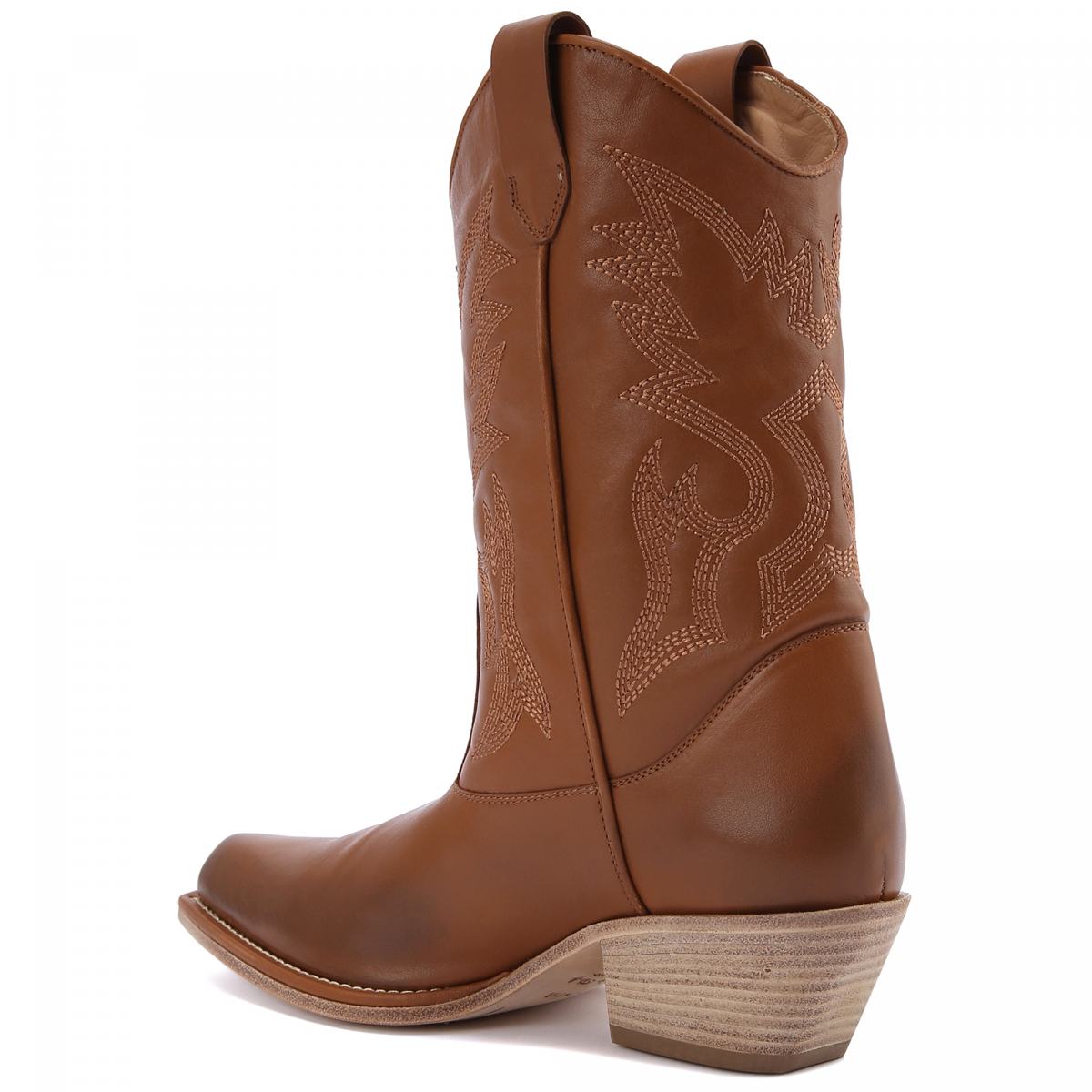 Ботильоны из кожи в коричневом цвете от VIC MATIE’. Ботинки в стиле вестерн выполнены из коричневой телячьей кожи с вышивкой в тон на голенище и петлями по бокам для удобства надевания. Кожаная подошва с кожаным рантом, внутри стелька из натуральной кожи.