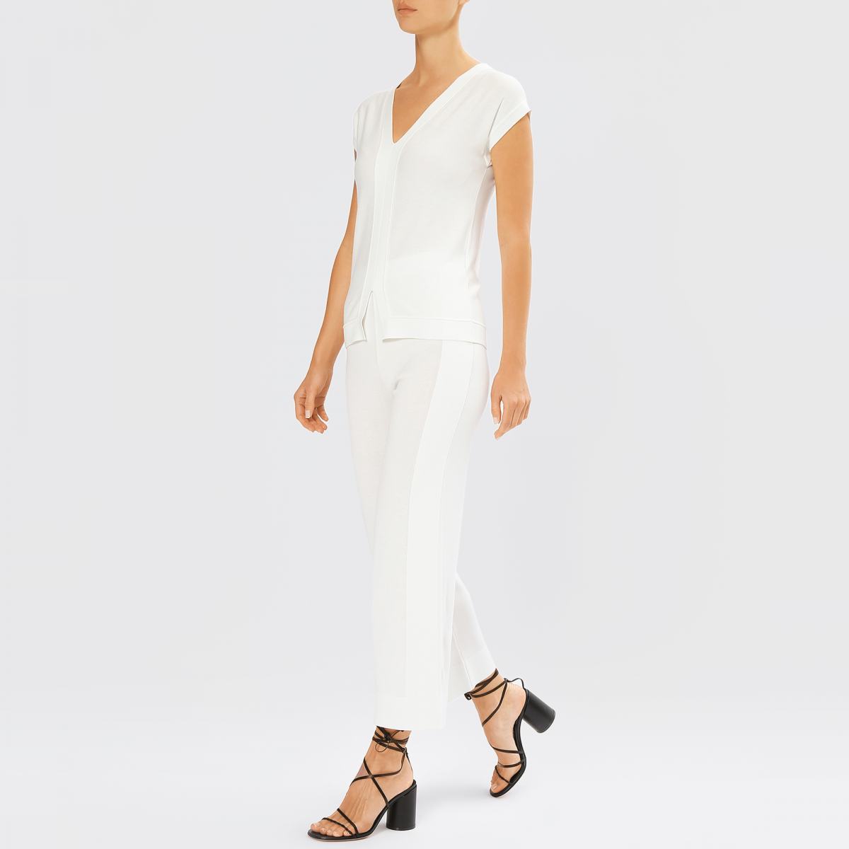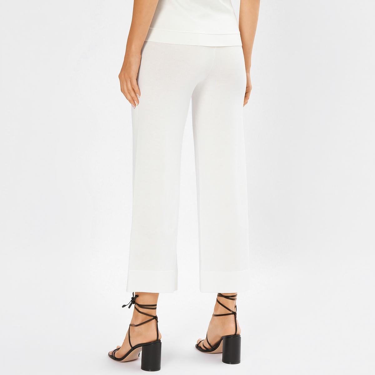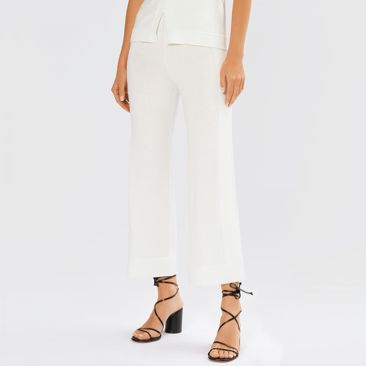 Брюки из трикотажа в кремовом цвете идеально дополнят праздничный образ. Модель выполнена на резинке, из трикотажной ткани, в составе которой 67% вискозы, 29% акрила и 4% полиэстера. Благодаря акрилу в составе брюки идеально держат форму и не деформируются в процессе носки. Сочетайте брюки с топом из капсульной коллекции, а также с любимыми джемперами и другими изделиями из трикотажа.