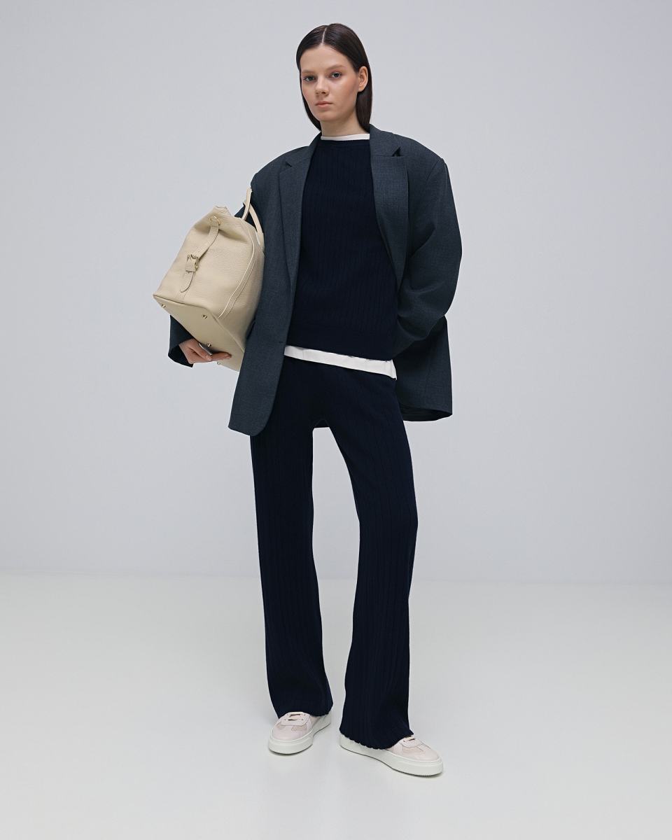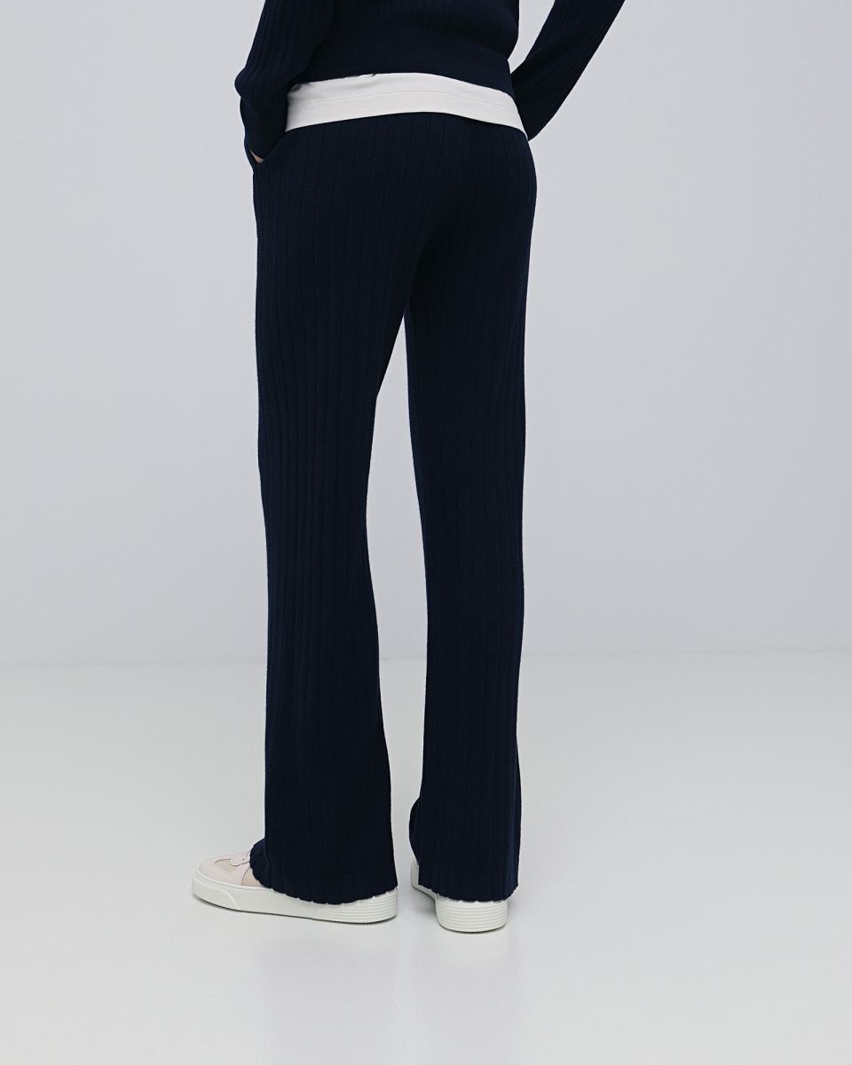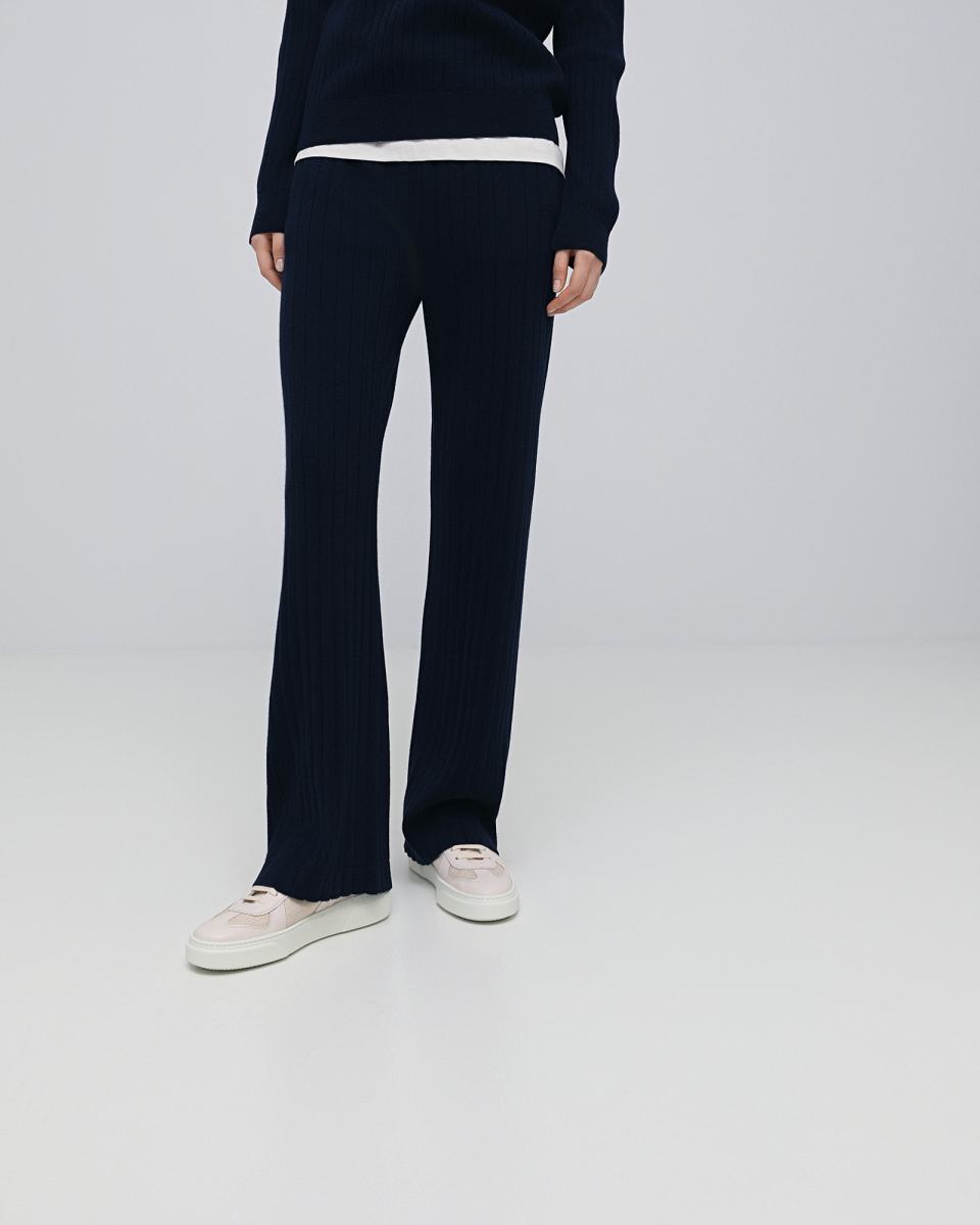 Темно-синие брюки Principe di Bologna помогут в создании комфортного образа на каждый день. Модель выполнена на эластичном поясе, из трикотажа, в составе которого 70% кашемира и 30% шелка. Вертикальный рисунок вязки и прямой крой визуально вытягивает силуэт. Брюки можно носить комплектом с футболкой или джемпером из капсулы бренда или сочетать с любыми другими верхами.