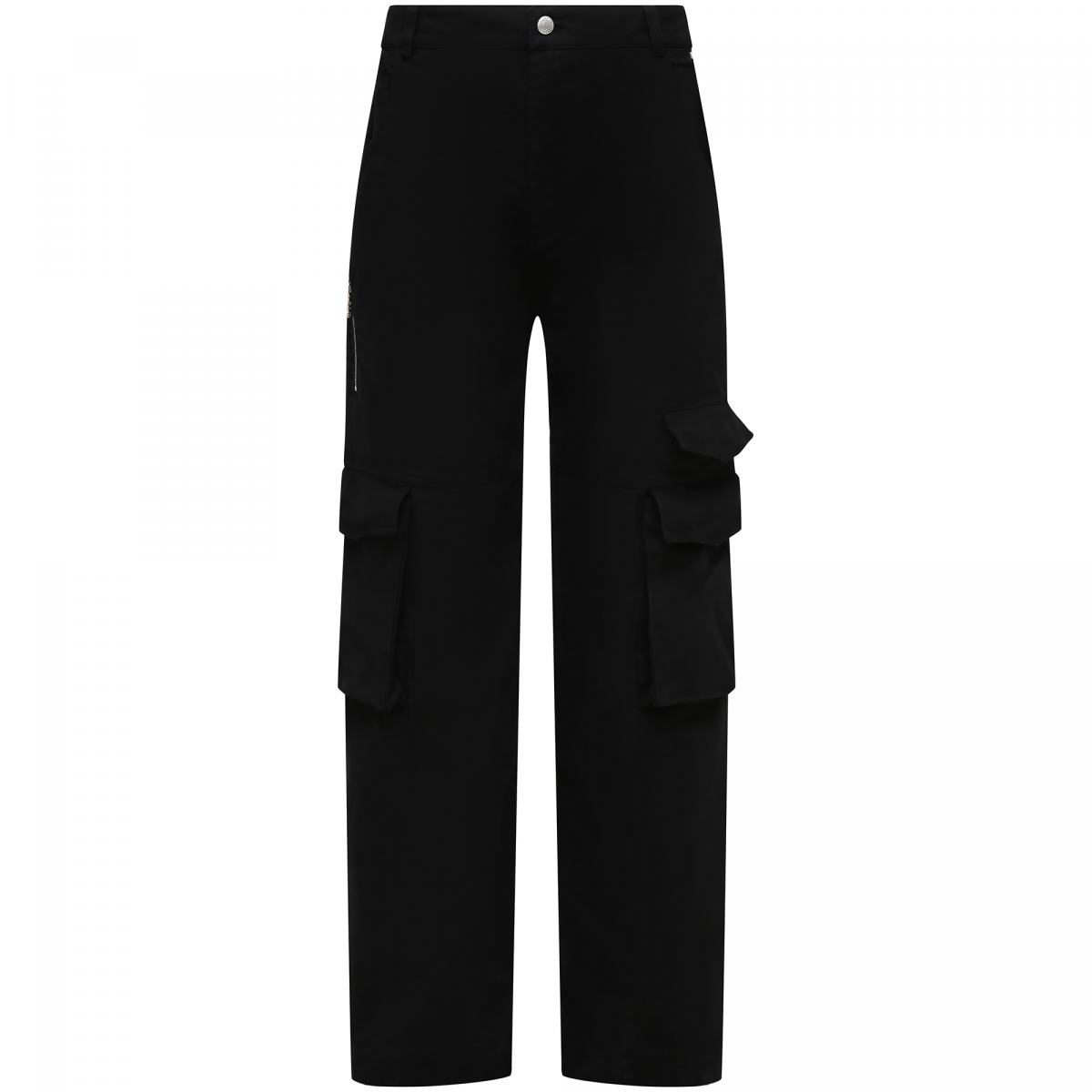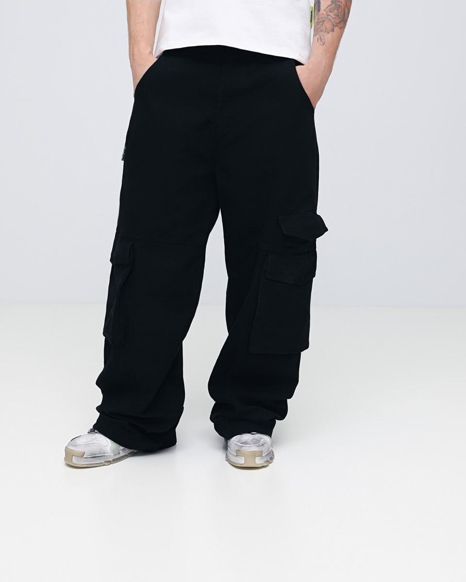 Чёрные брюки карго от GCDS. Брюки-карго выполнены из хлопкового габардина. Модель с большими боковыми карманами-карго. Карман на молнии на правом бедре. Размер оверсайз.