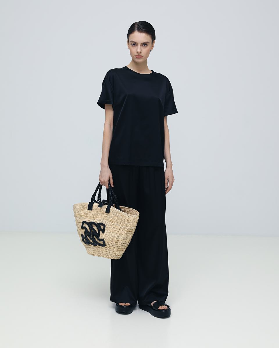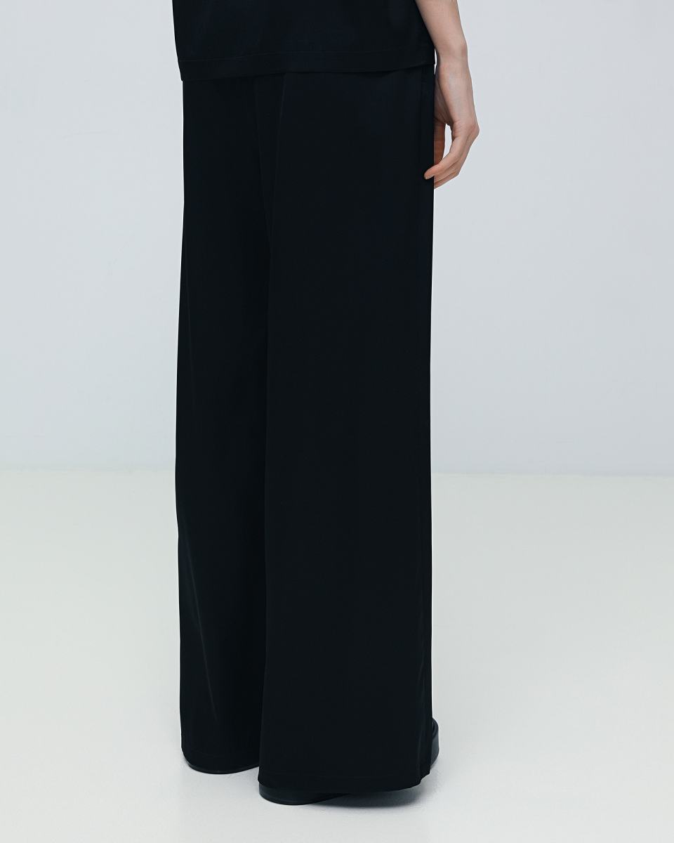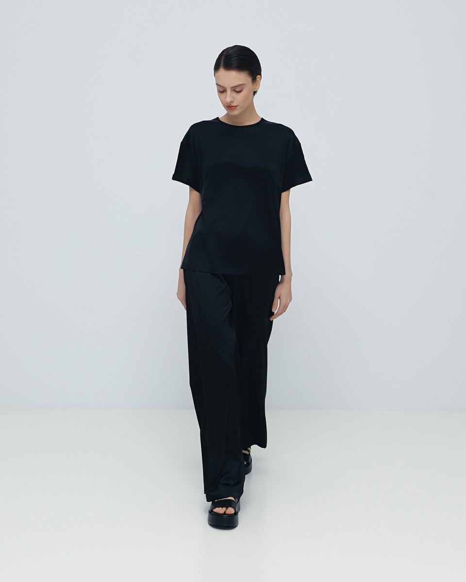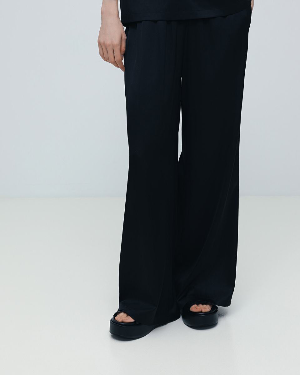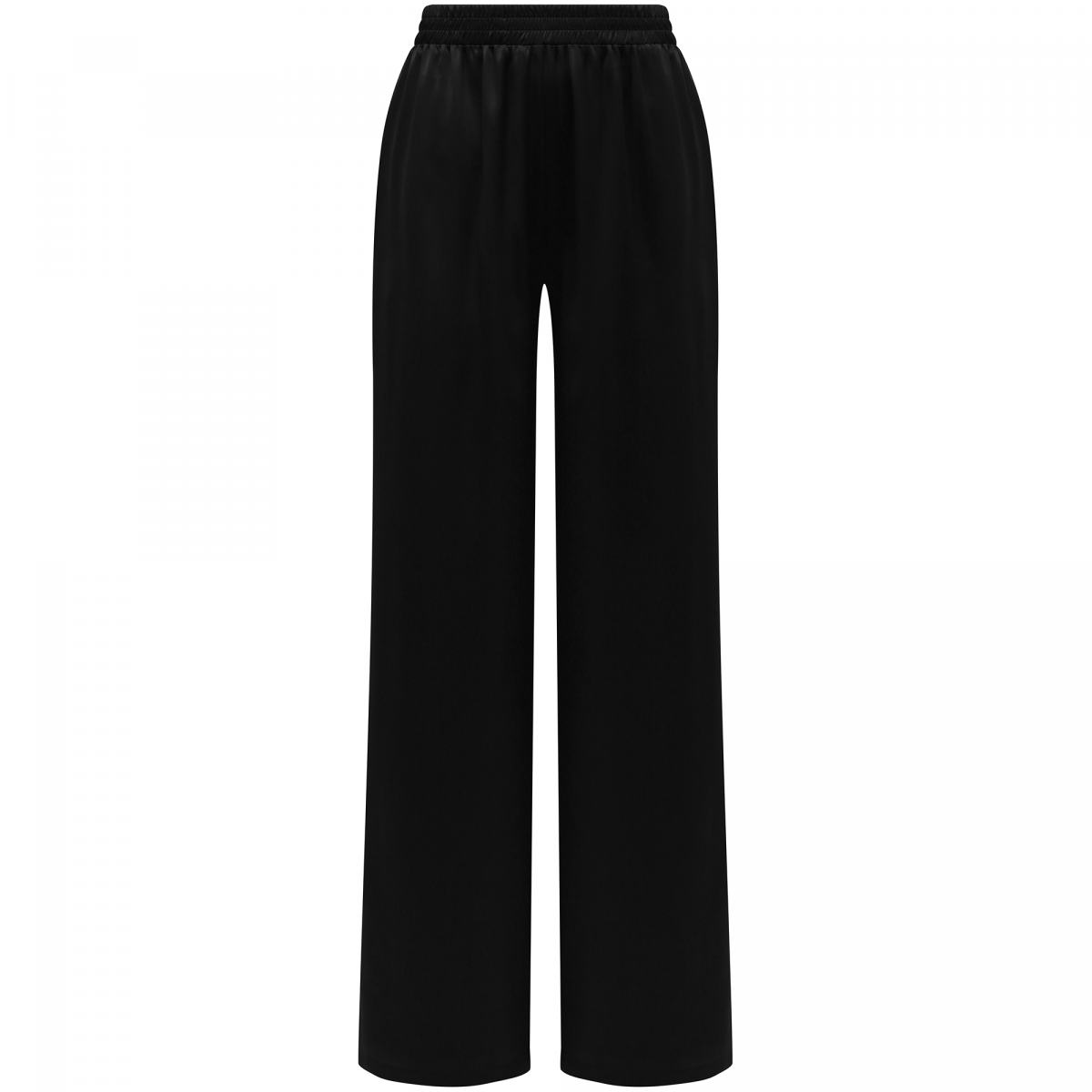 Чёрные брюки палаццо от Principe di Bologna подойдут как для повседневных, так и для вечерних образов, благодаря фактуре ткани. Модель выполнена на эластичном поясе, из шелка с добавлением эластана. По бокам брюки дополнены карманами. Сочетайте эту модель как с футболками и блузами, так и в комплекте с шелковой футболкой из капсулы бренда.