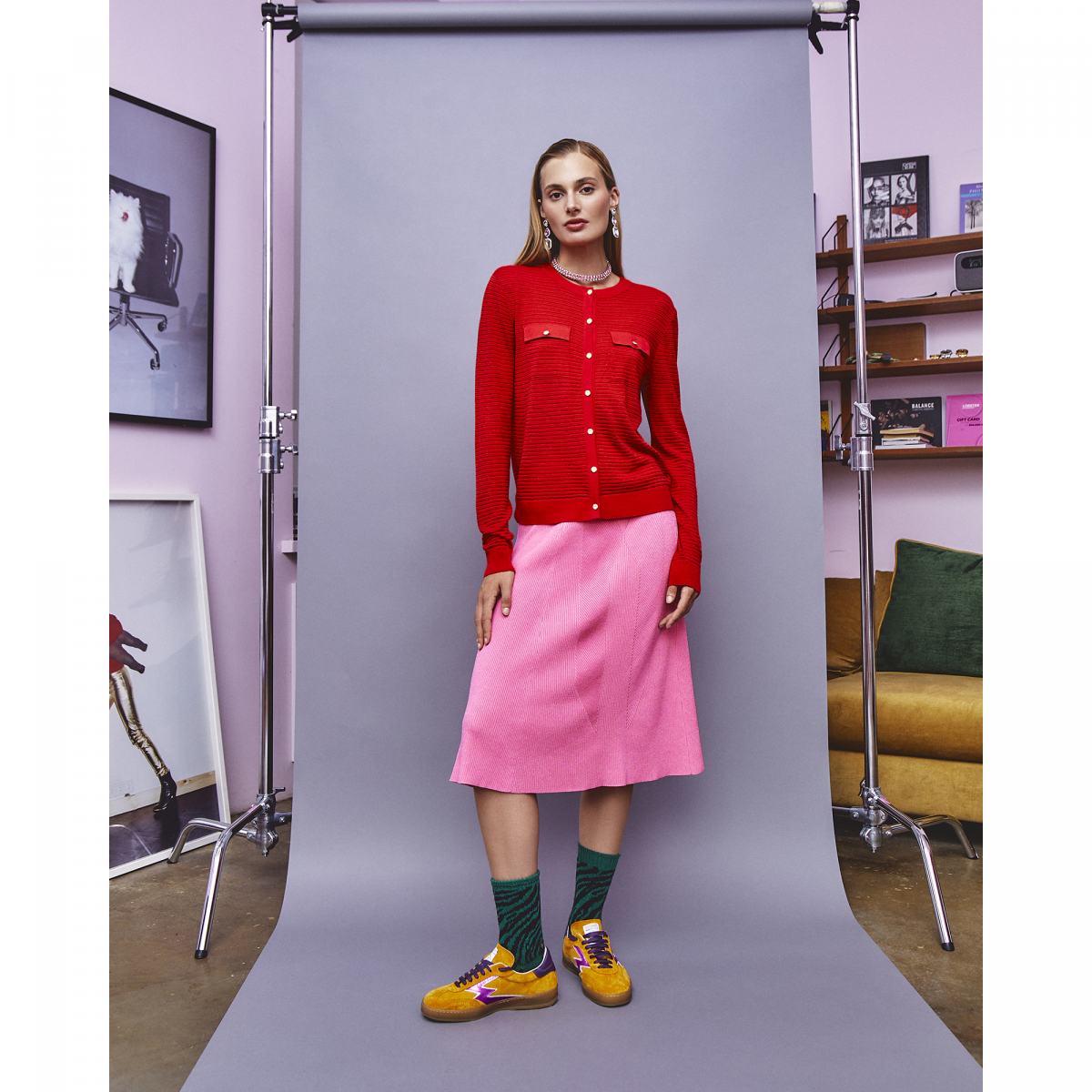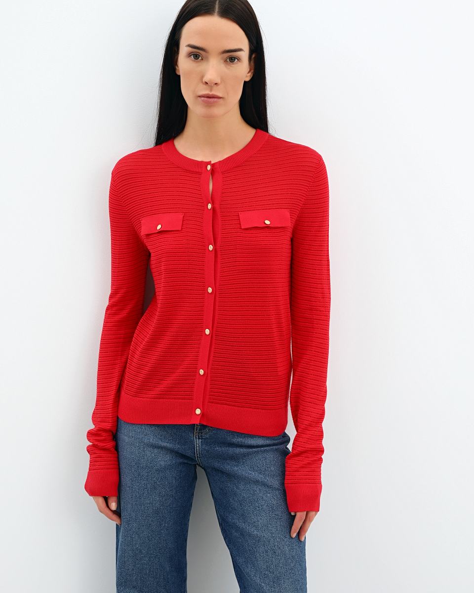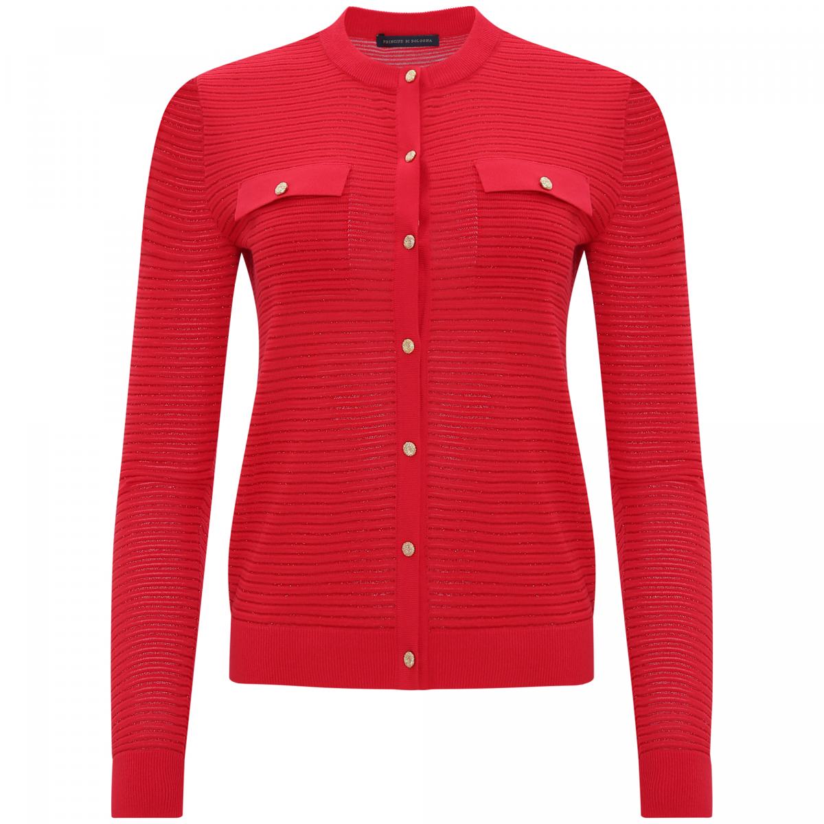 Трикотажный красный джемпер на пуговицах от Principe di Bologna станет одной из любимых вещей в базовом гардеробе. Модель выполнена из мягкого трикотажа, с добавлением блестящих нитей. Обтягивающий силуэт позволит носить этот джемпер не только самостоятельно, но и в качестве второго слоя. Застёжка на пуговицы, круглый воротник и нагрудные карманы.