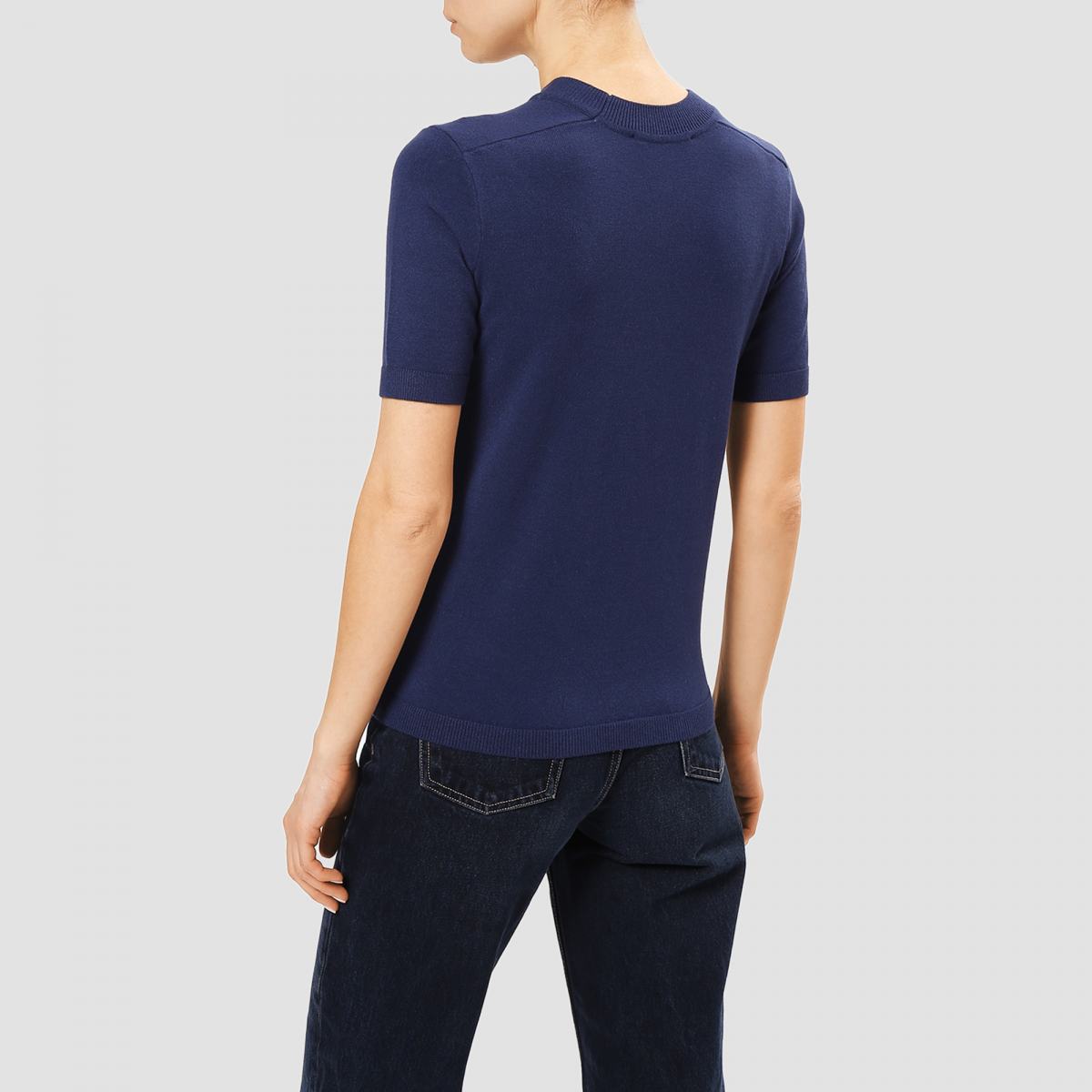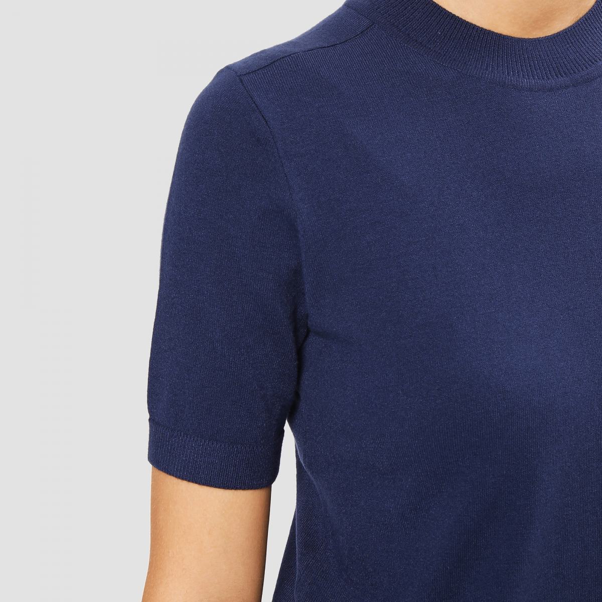 Темно синяя футболка прямого кроя дополнит базовый гардероб и станет основой множества образов. Модель выполнена из трикотажа, в составе которого 55% вискозы, 34% полиамида, 6% шерсти мериноса и 5% кашемира. Мягкая и тёплая футболка идеальна в качестве второго слоя под пиджак, при этом самостоятельно такая модель тоже будет выглядеть стильно.