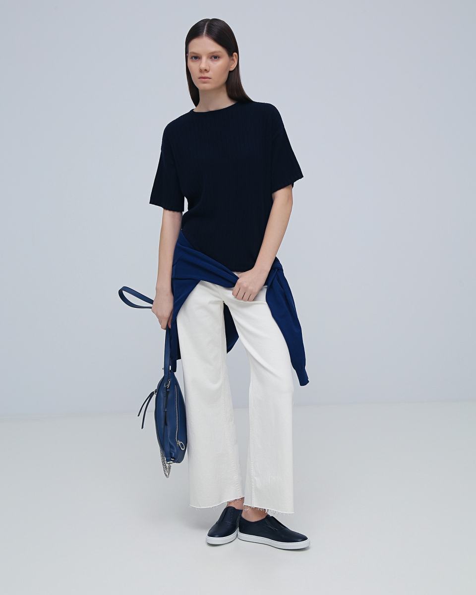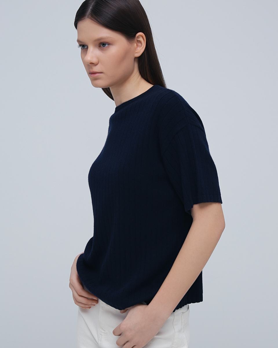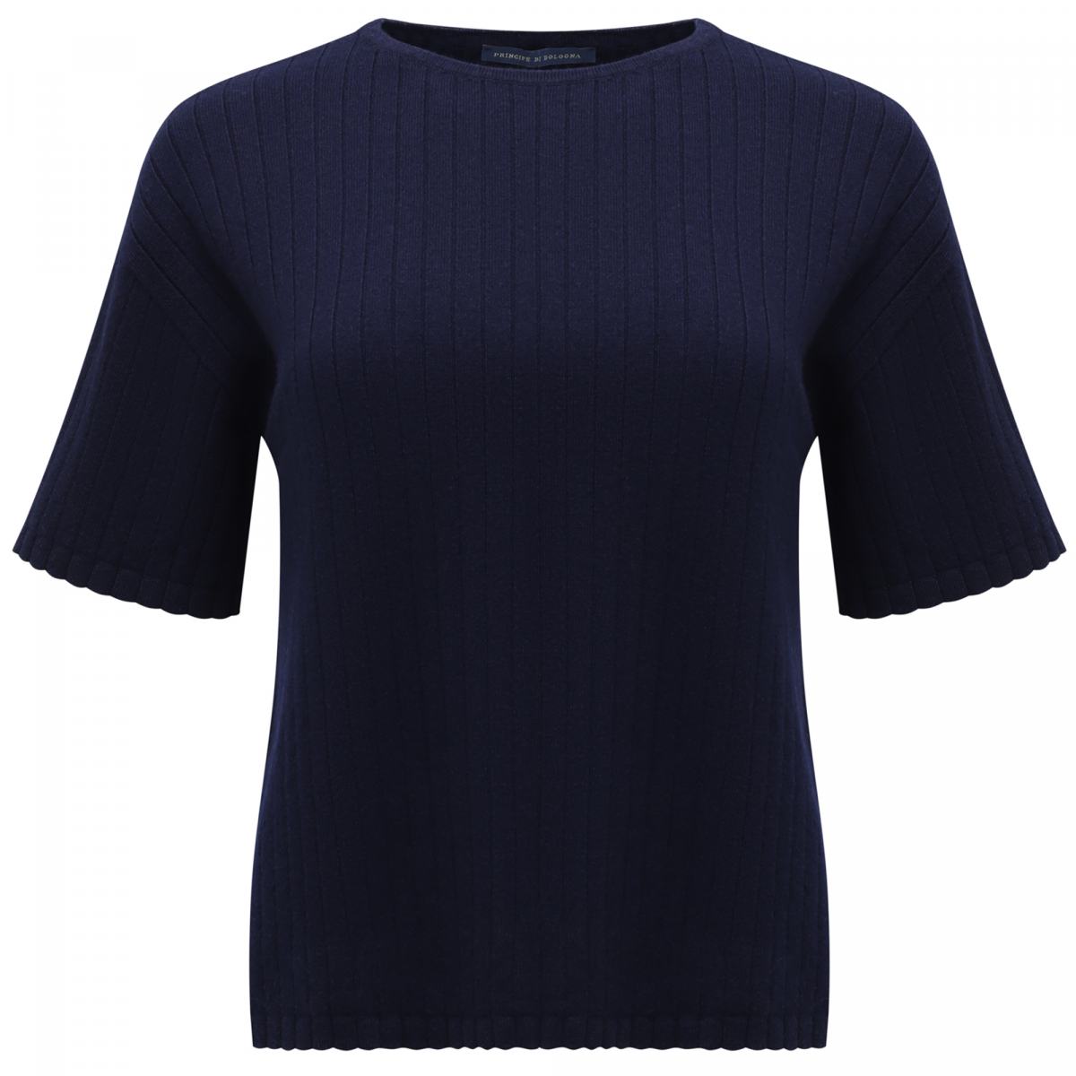Темно-синяя футболка Principe di Bologna подойдет в качестве базы для создания повседневных или деловых образов. Модель выполнена из трикотажа, в составе которого 70% кашемира и 30% шелка. Вертикальный рисунок вязки и прямой крой визуально вытягивает силуэт. Футболку можно носить комплектом с трикотажными брюками из капсулы бренда или сочетать с любыми другими низами, создавая нужный стиль.