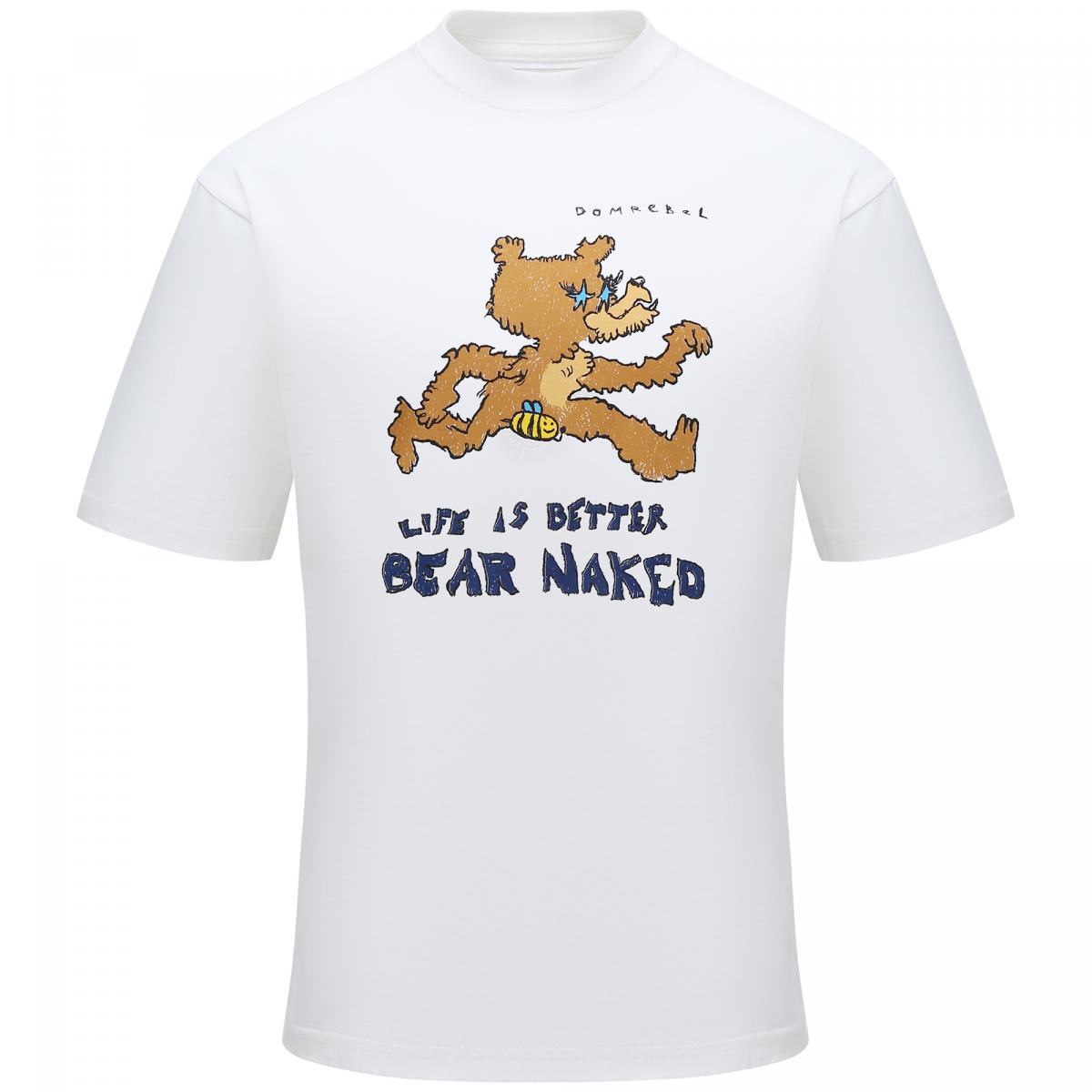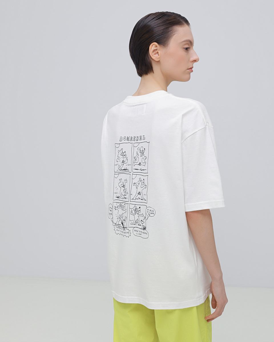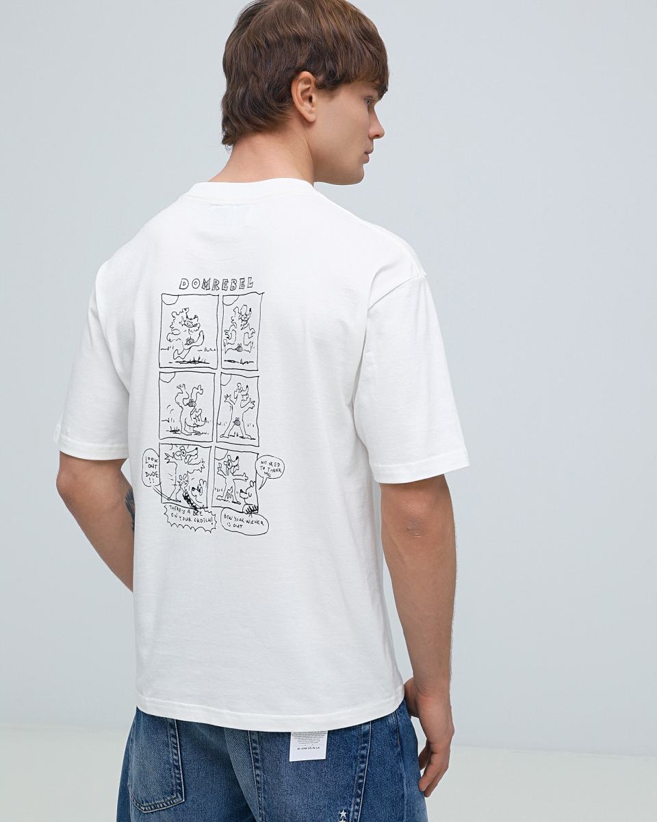 Белая футболка с мультяшным принтом от DOMREBEL. Футболка выполнена из 100% хлопкового трикотажа. Короткие рукава, круглая горловина, регулярная посадка. Спереди и на спине рисованный принт с фирменным логотипом.