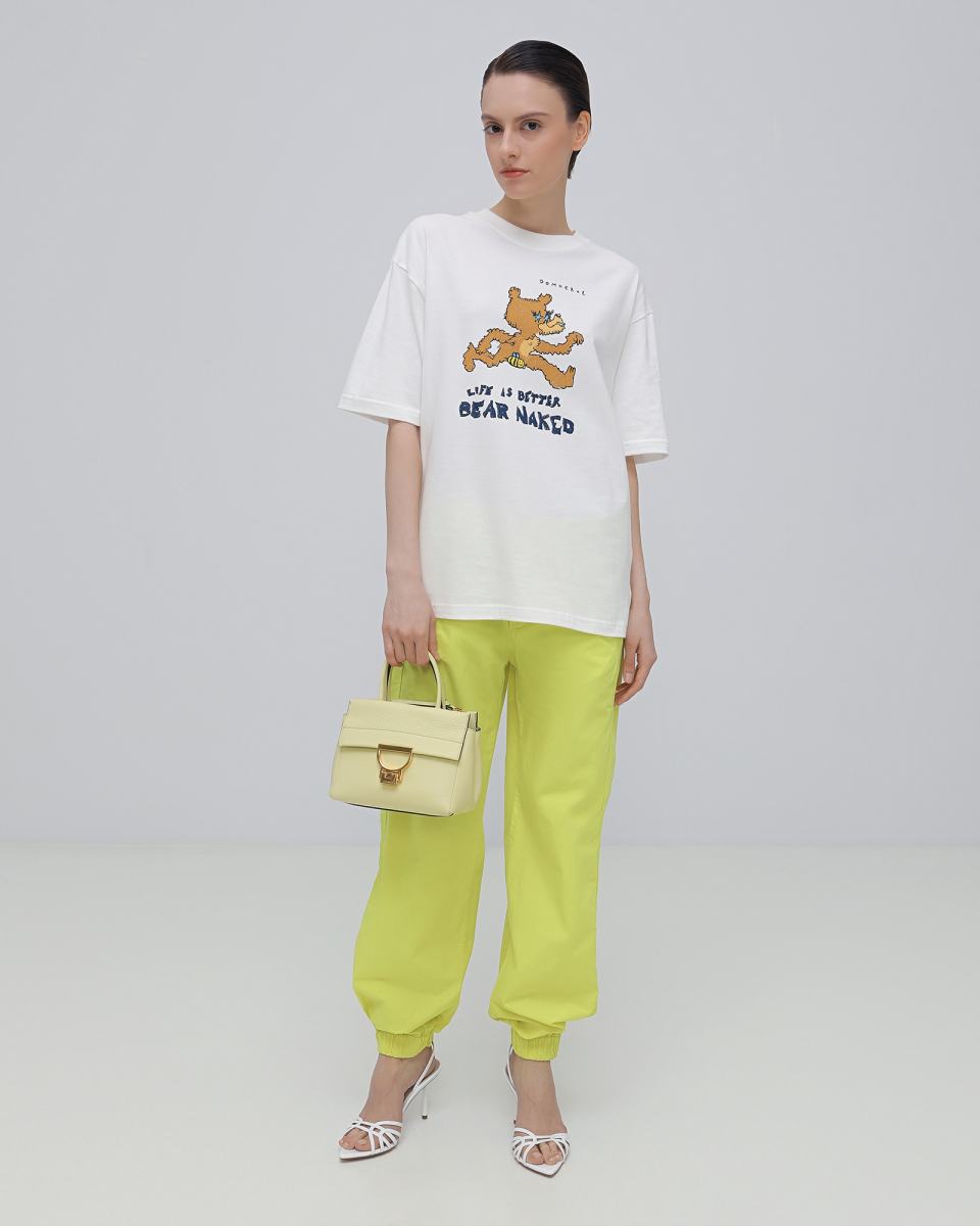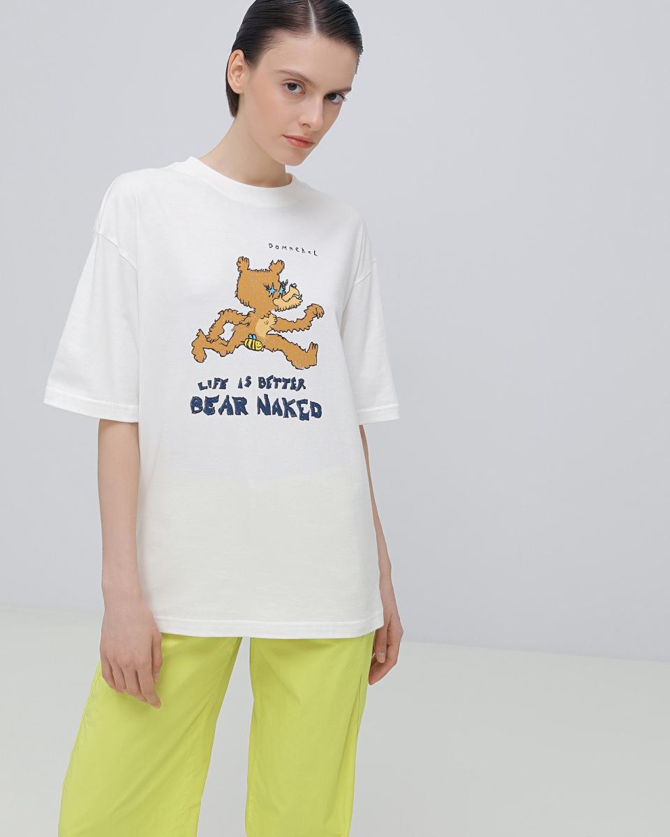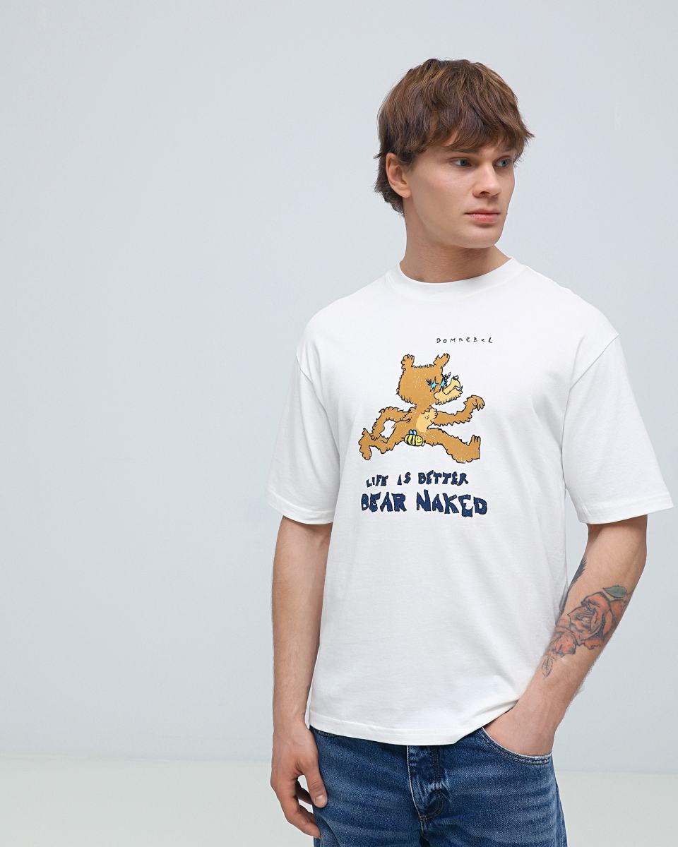 Белая футболка с мультяшным принтом от DOMREBEL. Футболка выполнена из 100% хлопкового трикотажа. Короткие рукава, круглая горловина, регулярная посадка. Спереди и на спине рисованный принт с фирменным логотипом.
