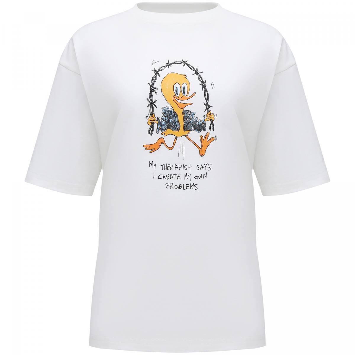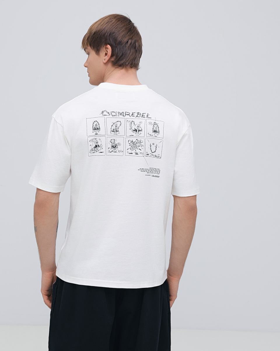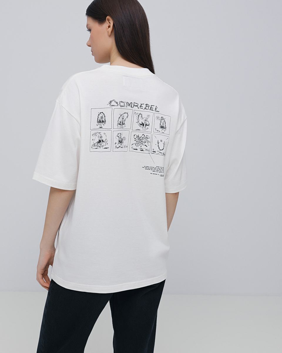 Белая футболка с мультяшным принтом от DOMREBEL. Футболка выполнена из 100% хлопкового трикотажа. Короткие рукава, круглая горловина, регулярная посадка. Спереди и на спине рисованный принт с фирменным логотипом.