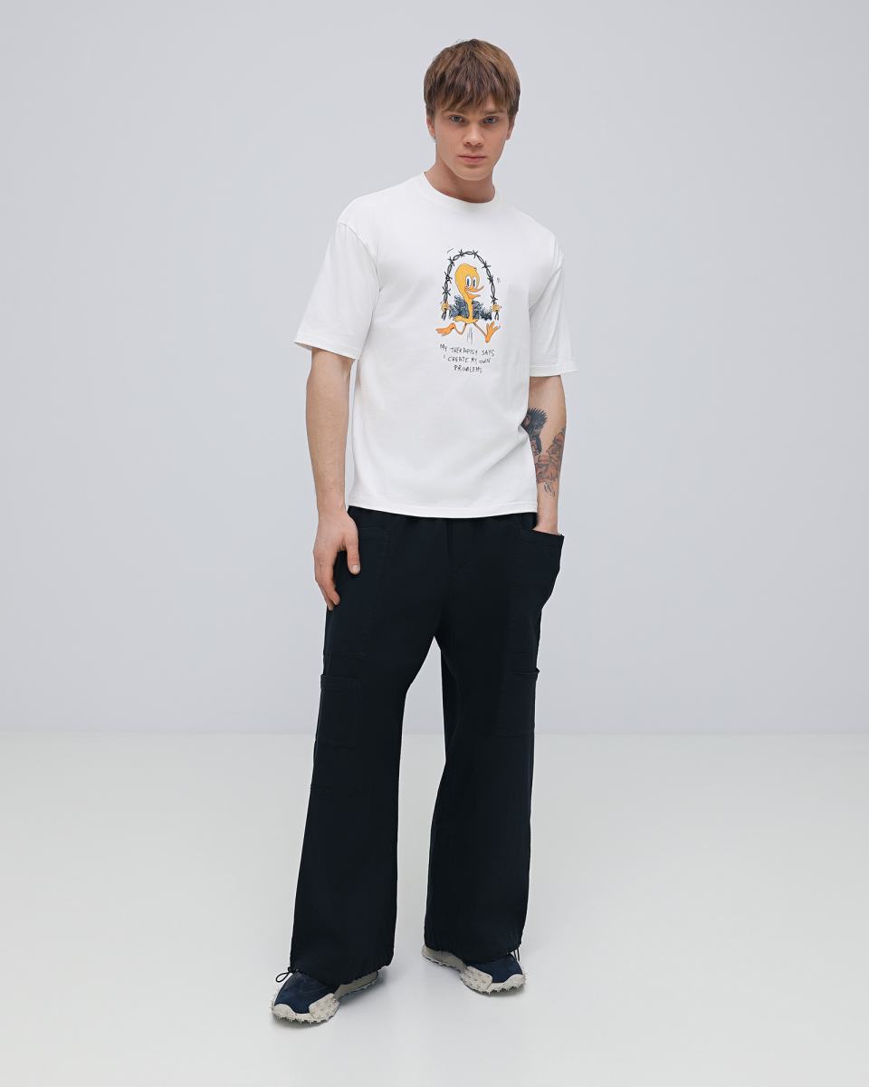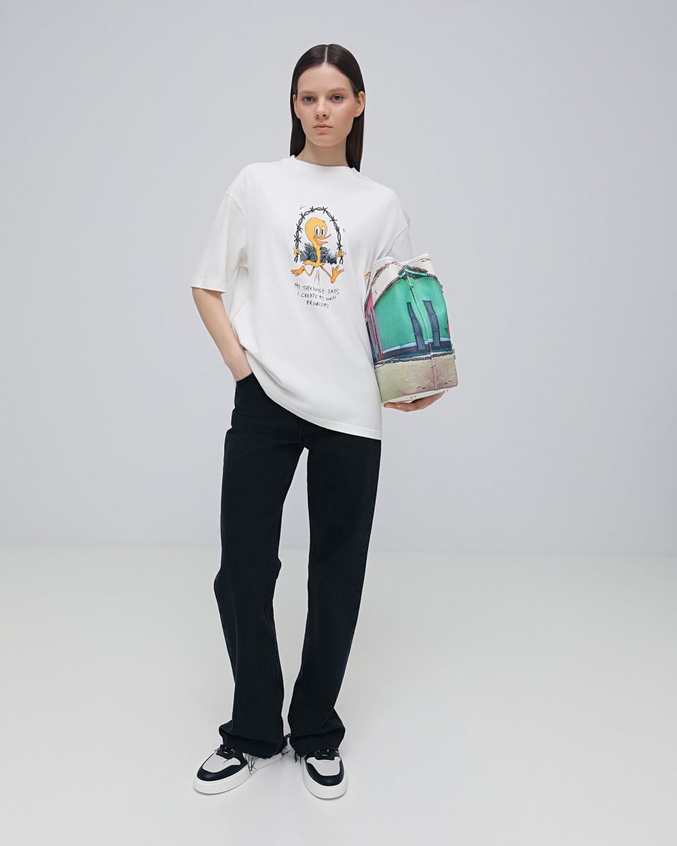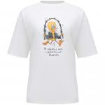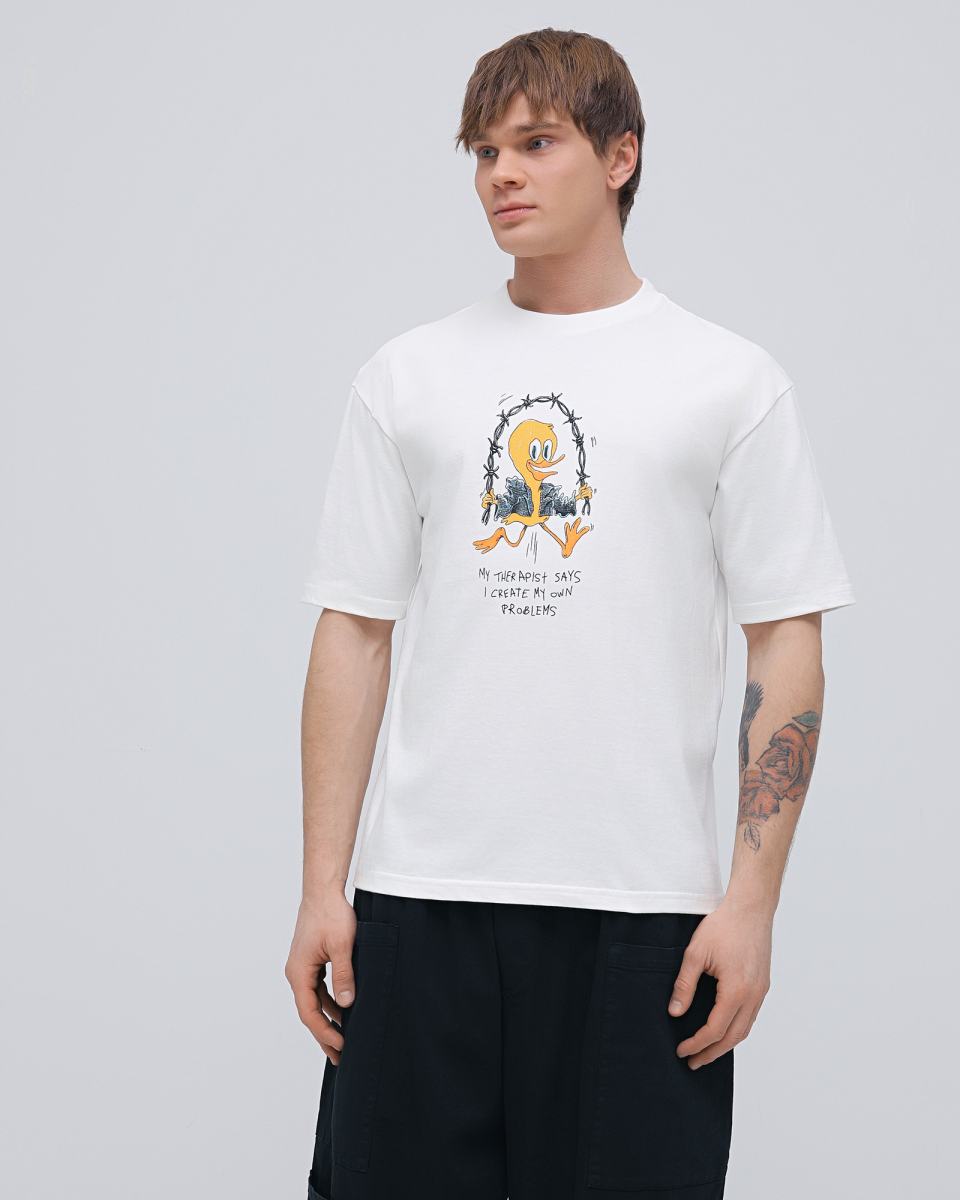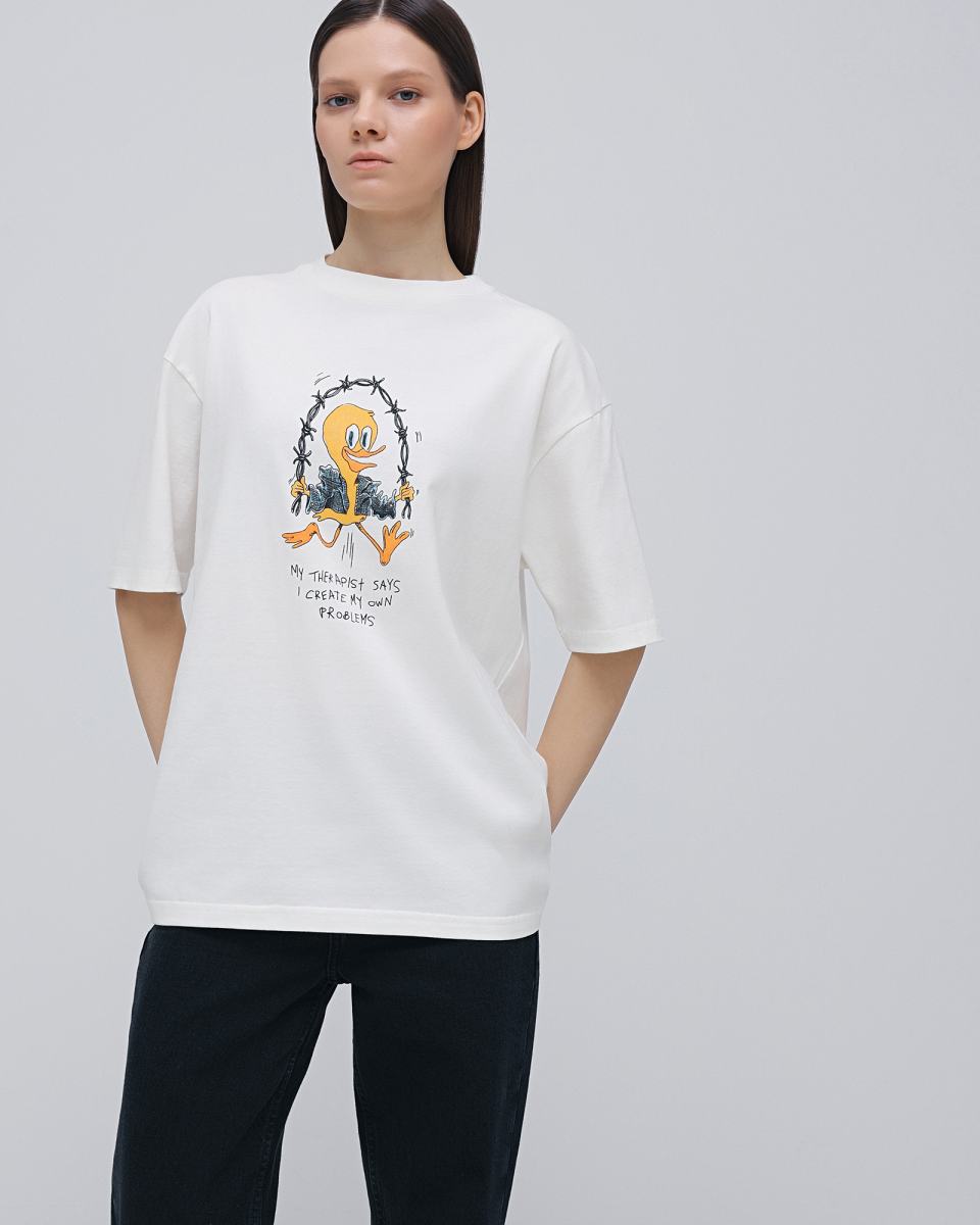 Белая футболка с мультяшным принтом от DOMREBEL. Футболка выполнена из 100% хлопкового трикотажа. Короткие рукава, круглая горловина, регулярная посадка. Спереди и на спине рисованный принт с фирменным логотипом.