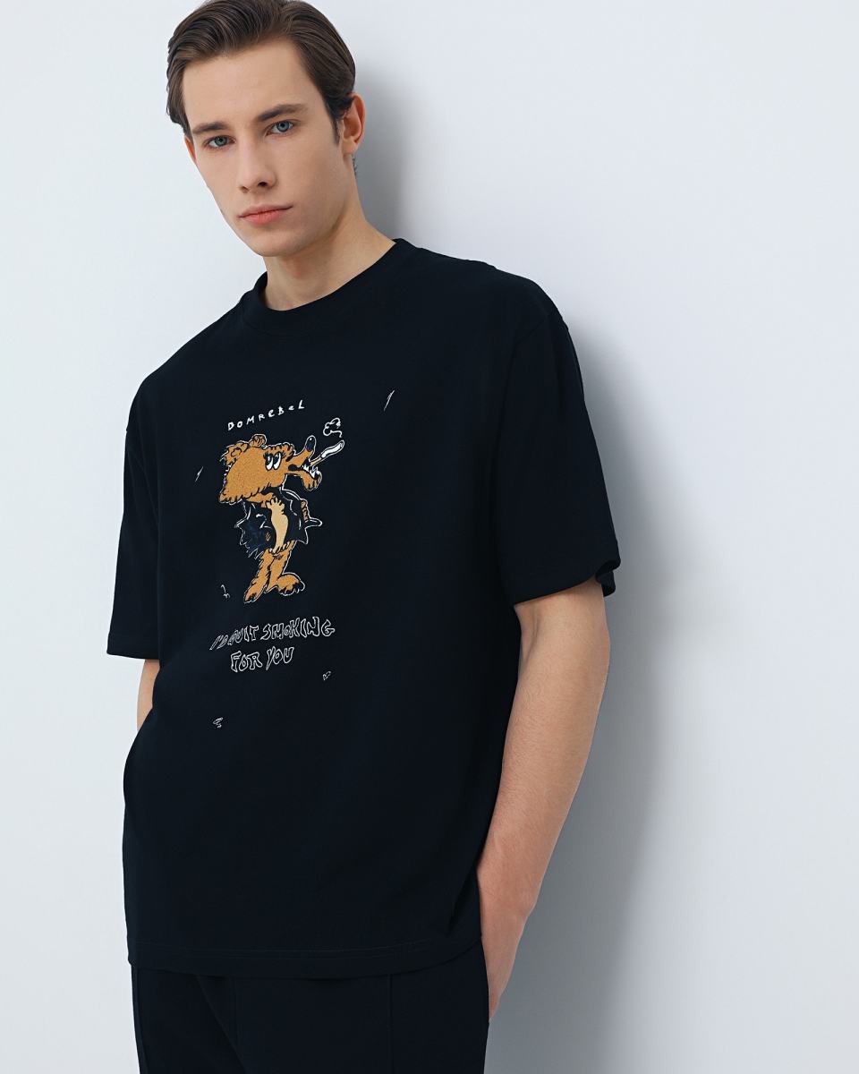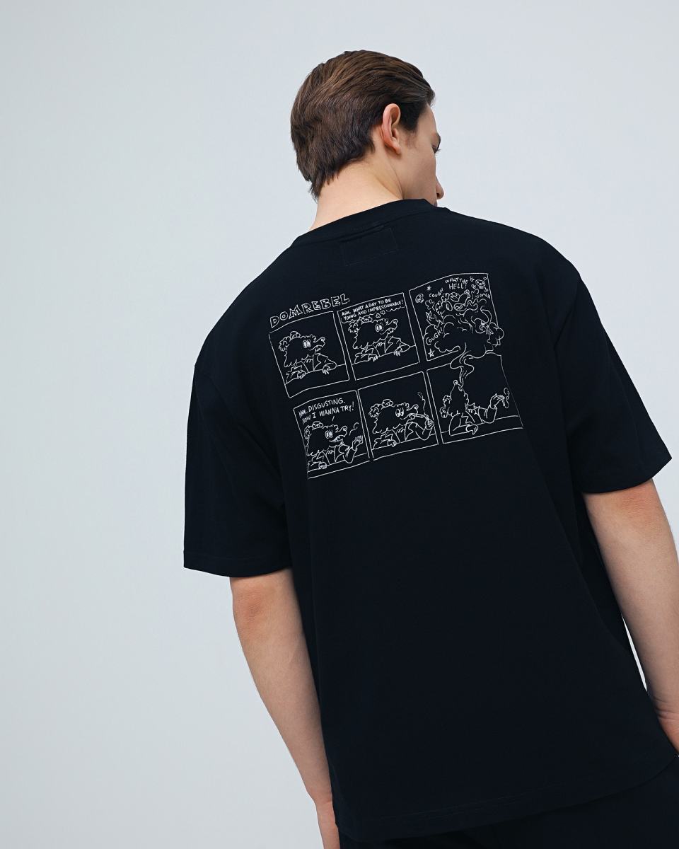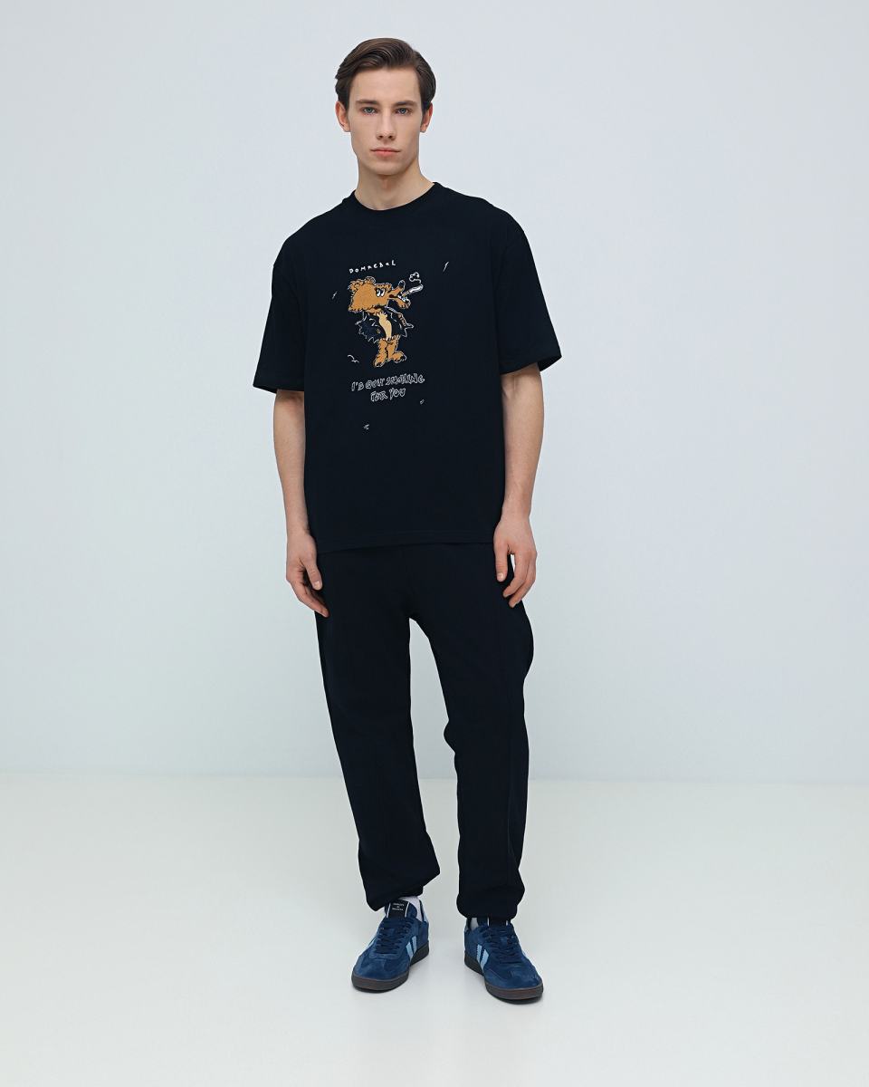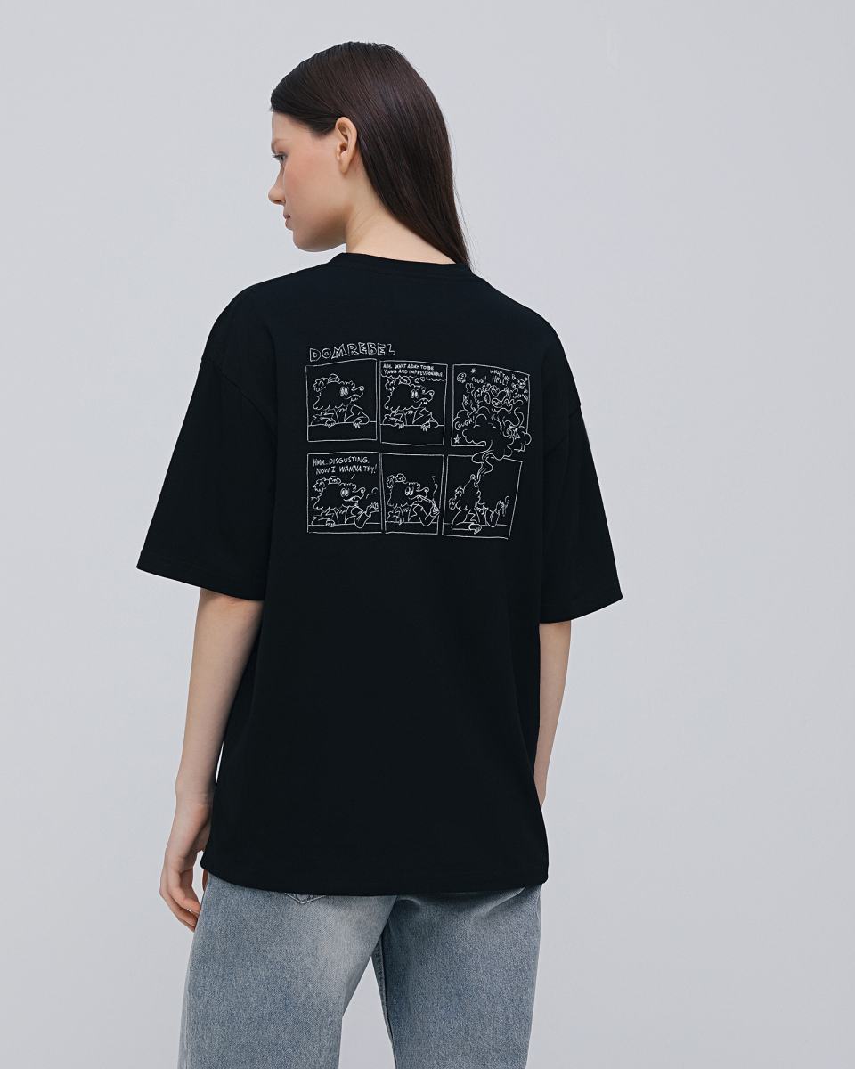 Черная футболка с мультяшным принтом от DOMREBEL. Футболка выполнена из 100% хлопкового трикотажа. Короткие рукава, круглая горловина, регулярная посадка. Спереди и на спине рисованный принт с фирменным логотипом.