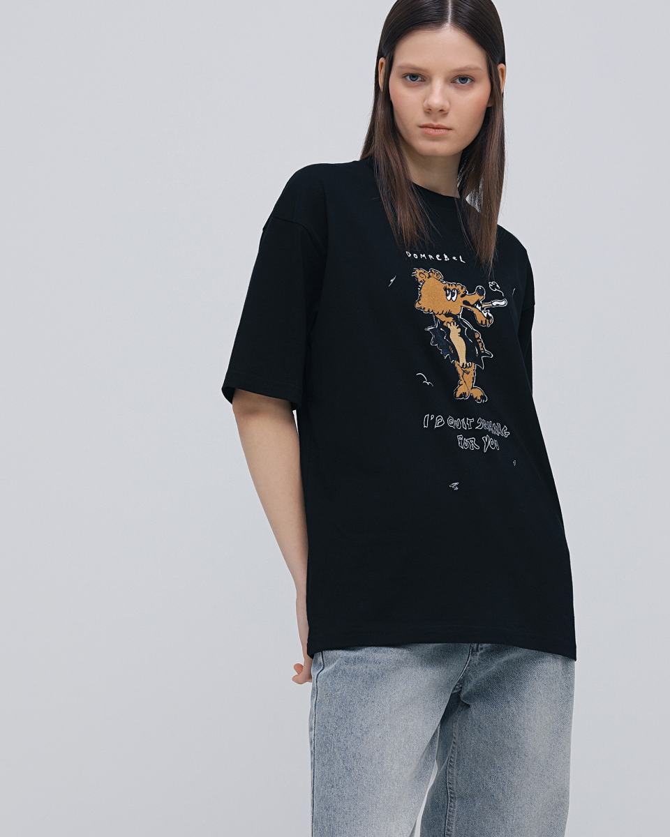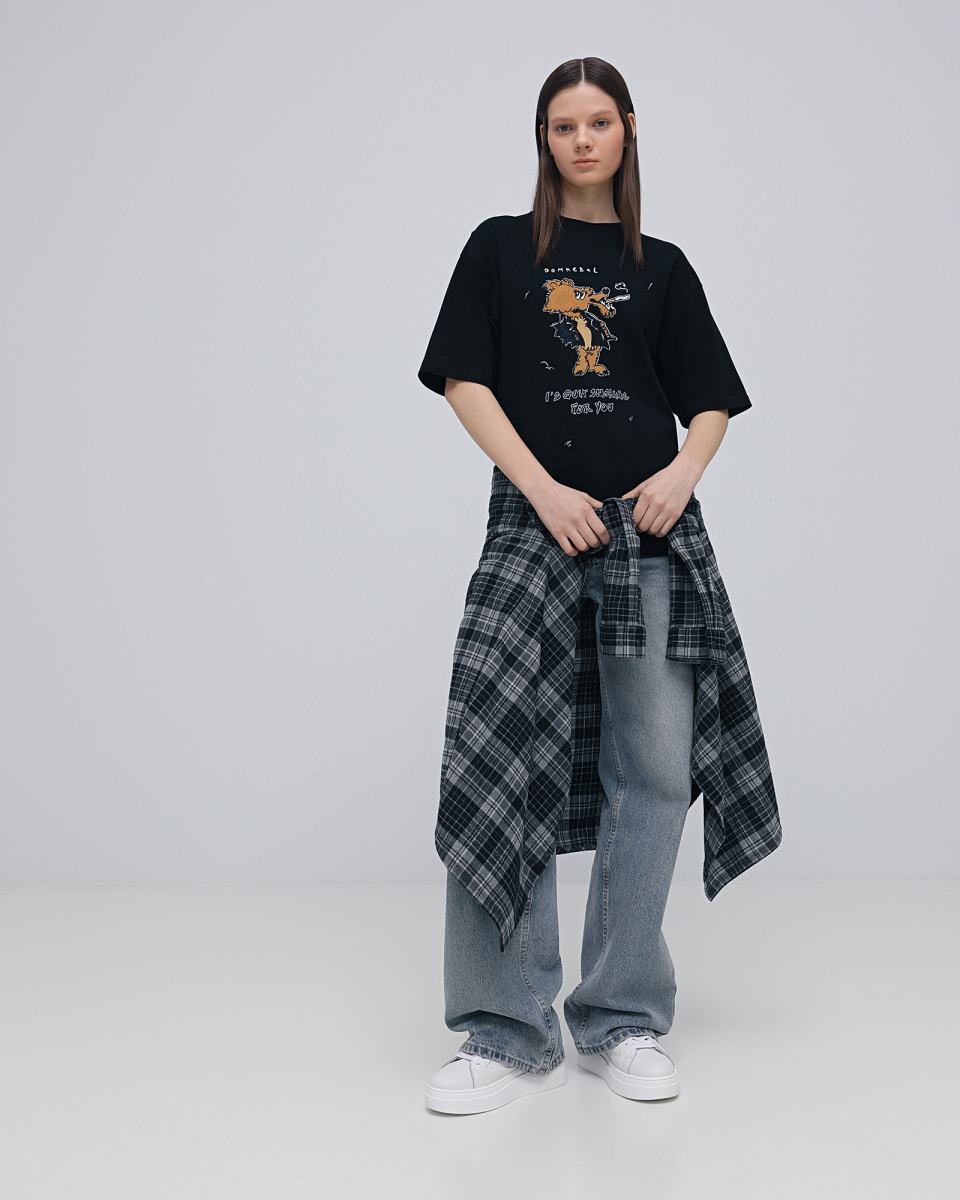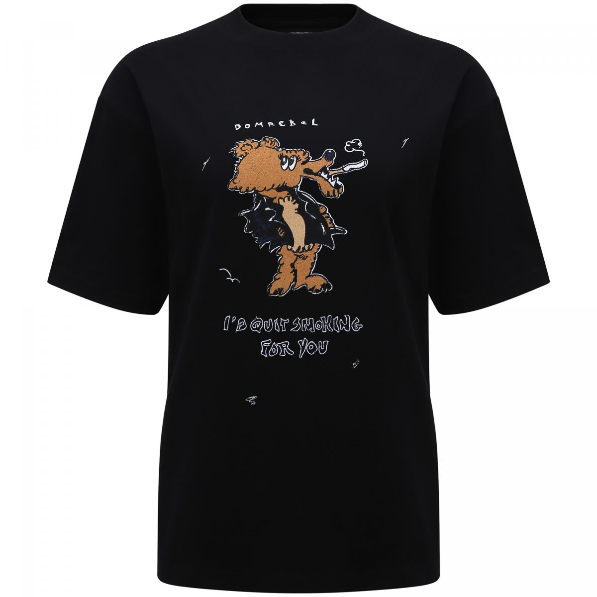 Черная футболка с мультяшным принтом от DOMREBEL. Футболка выполнена из 100% хлопкового трикотажа. Короткие рукава, круглая горловина, регулярная посадка. Спереди и на спине рисованный принт с фирменным логотипом.