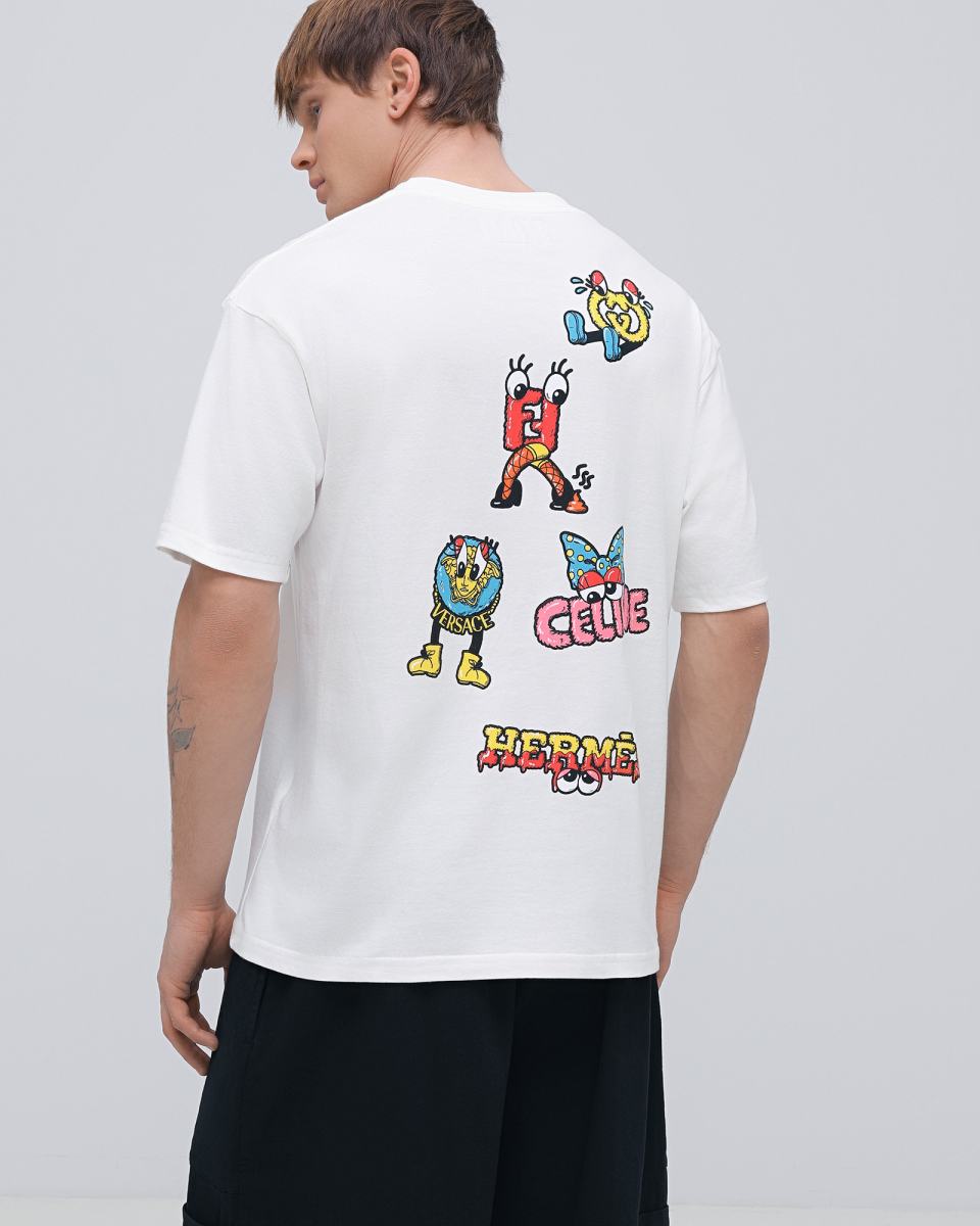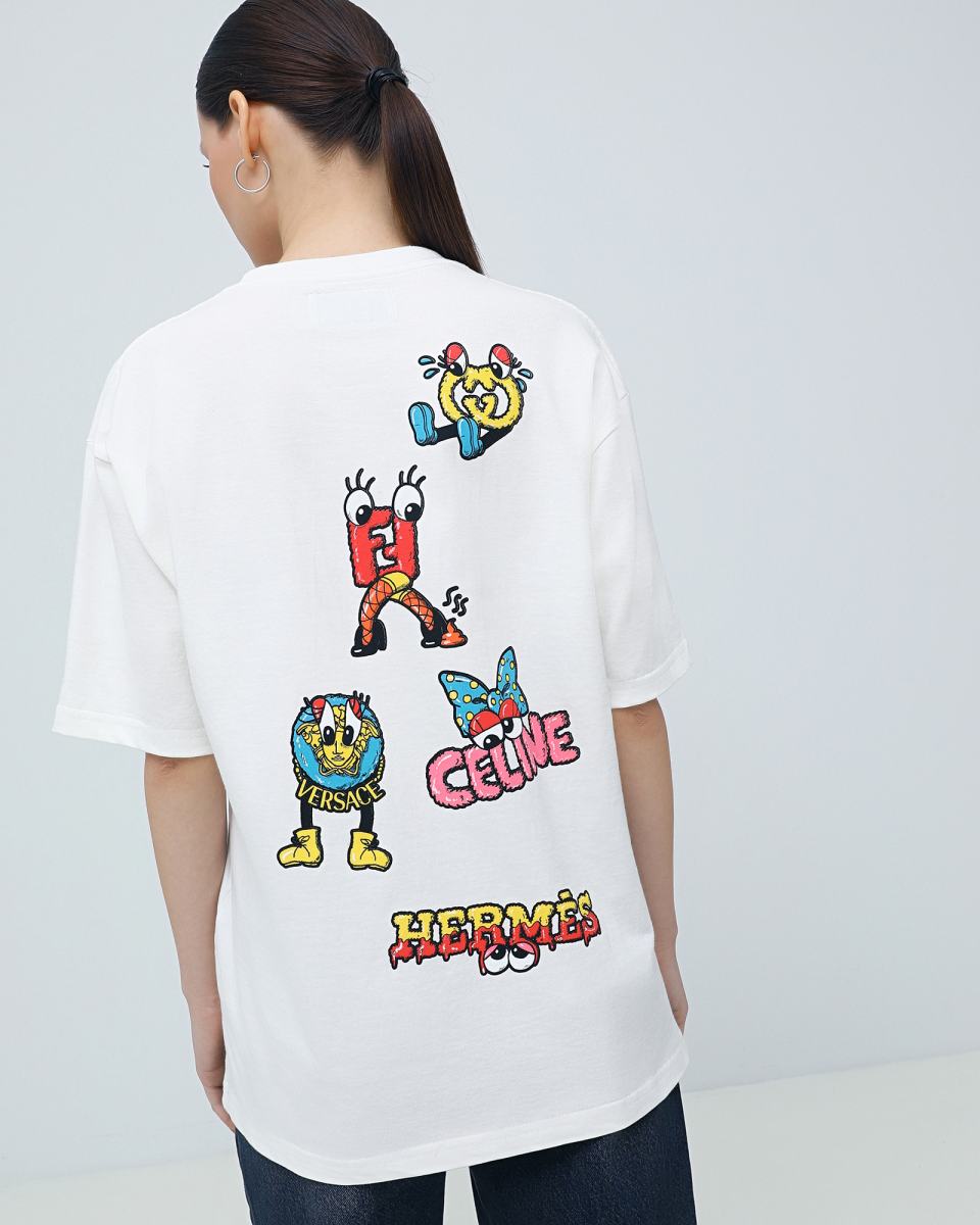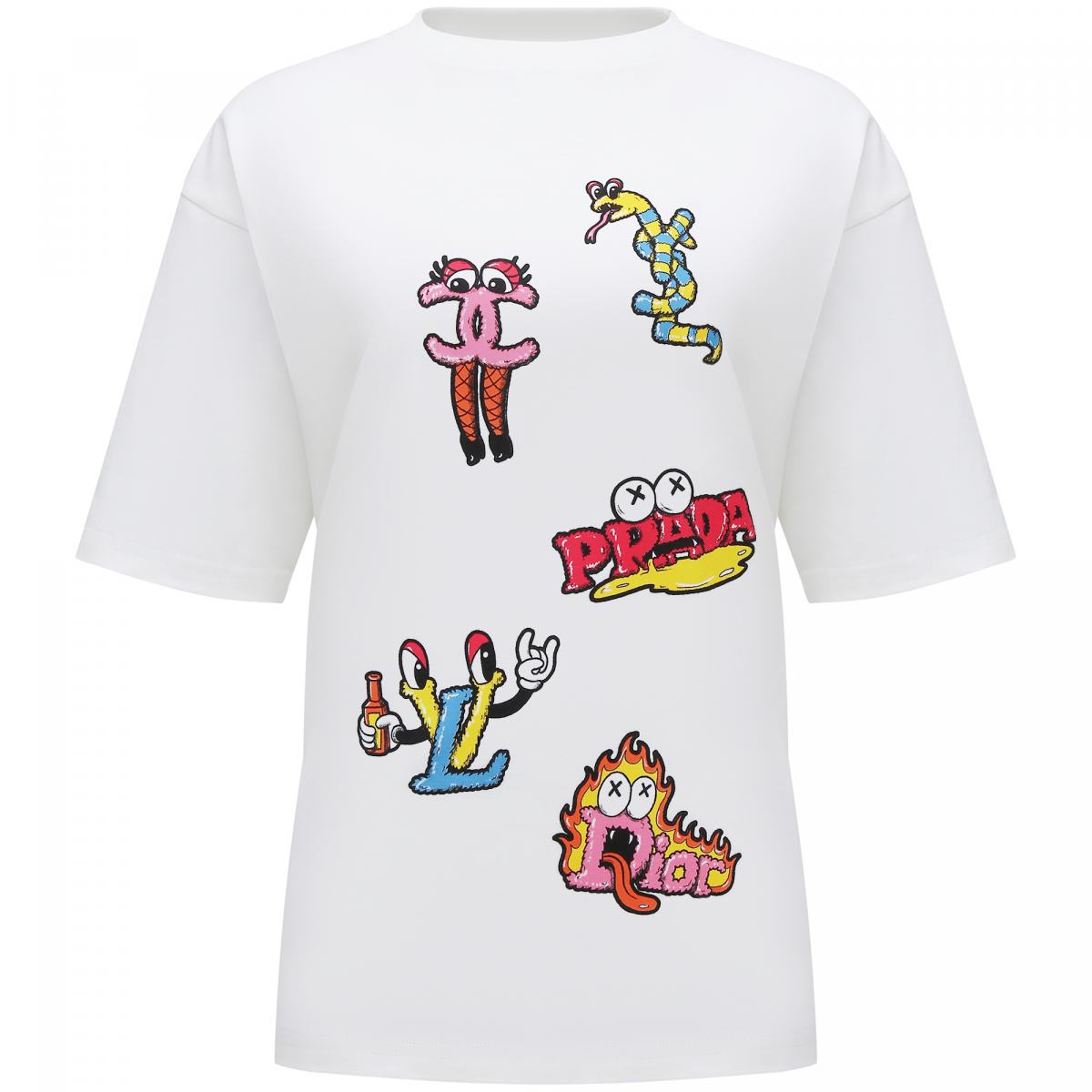 Белая футболка со стильным принтом от DOMREBEL. Напечатанные изображения люксовых брендов DOMREBEL превратились в красочных мультяшных монстров спереди и сзади. Футболка выполнена из 100% хлопковой ткани. Все изделия изготавливаются вручную, что приводит к небольшим вариациям от одного изделия к другому.