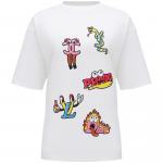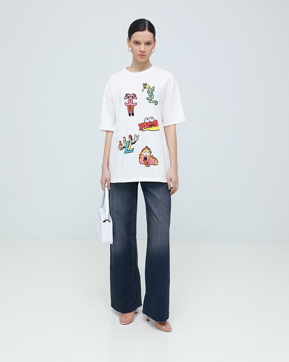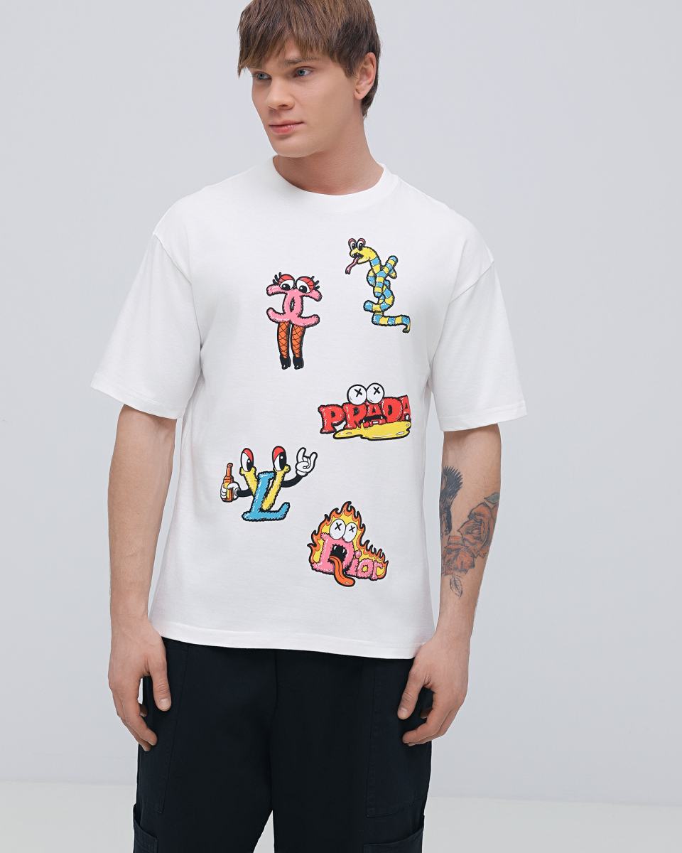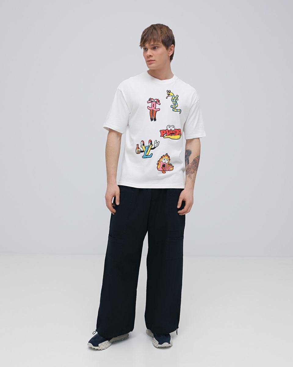 Белая футболка со стильным принтом от DOMREBEL. Напечатанные изображения люксовых брендов DOMREBEL превратились в красочных мультяшных монстров спереди и сзади. Футболка выполнена из 100% хлопковой ткани. Все изделия изготавливаются вручную, что приводит к небольшим вариациям от одного изделия к другому.