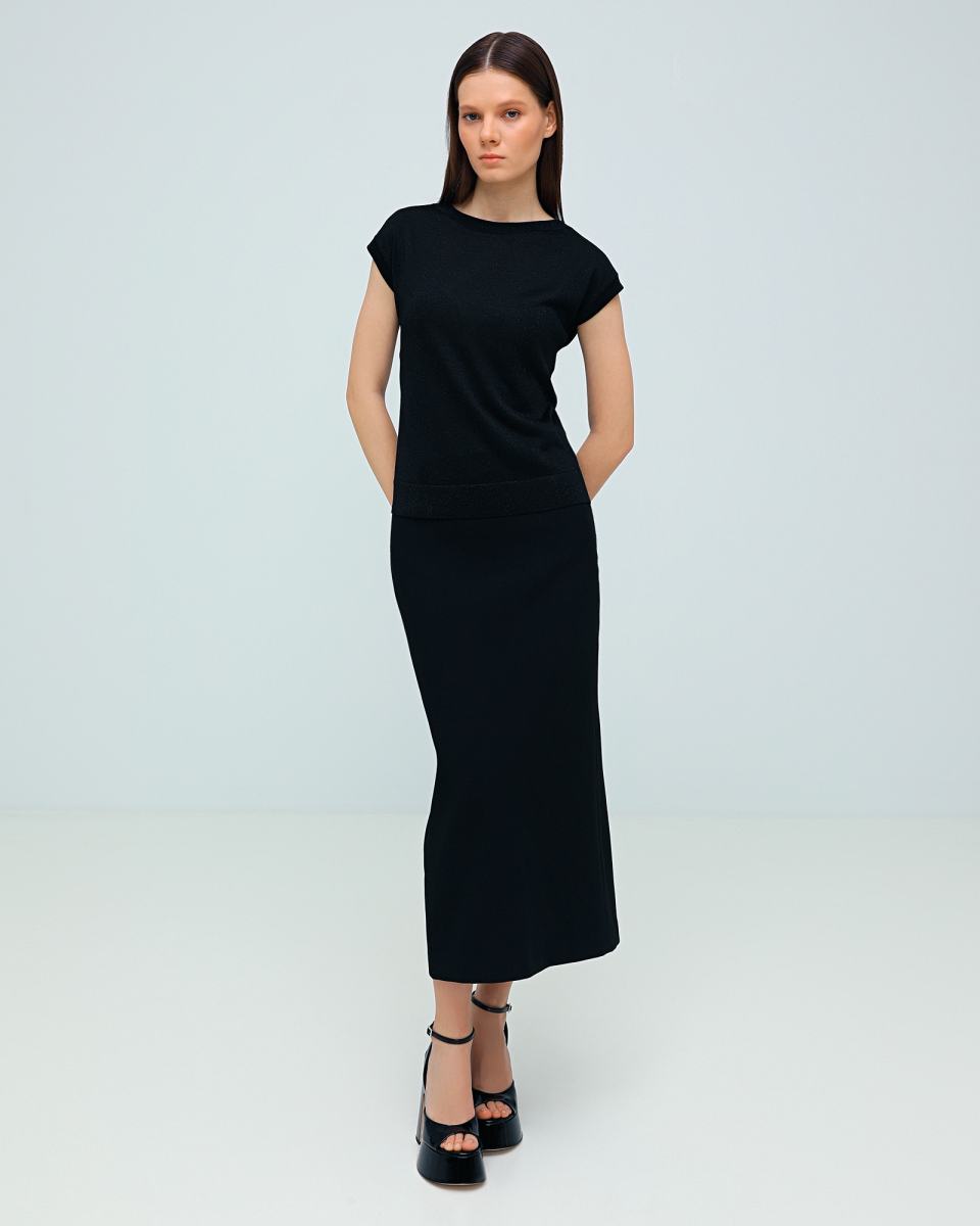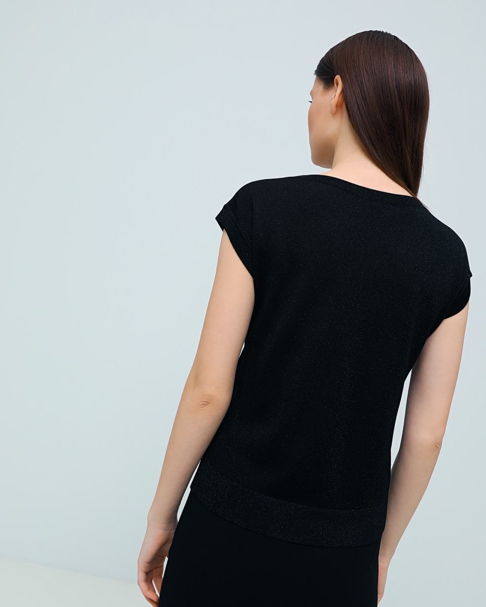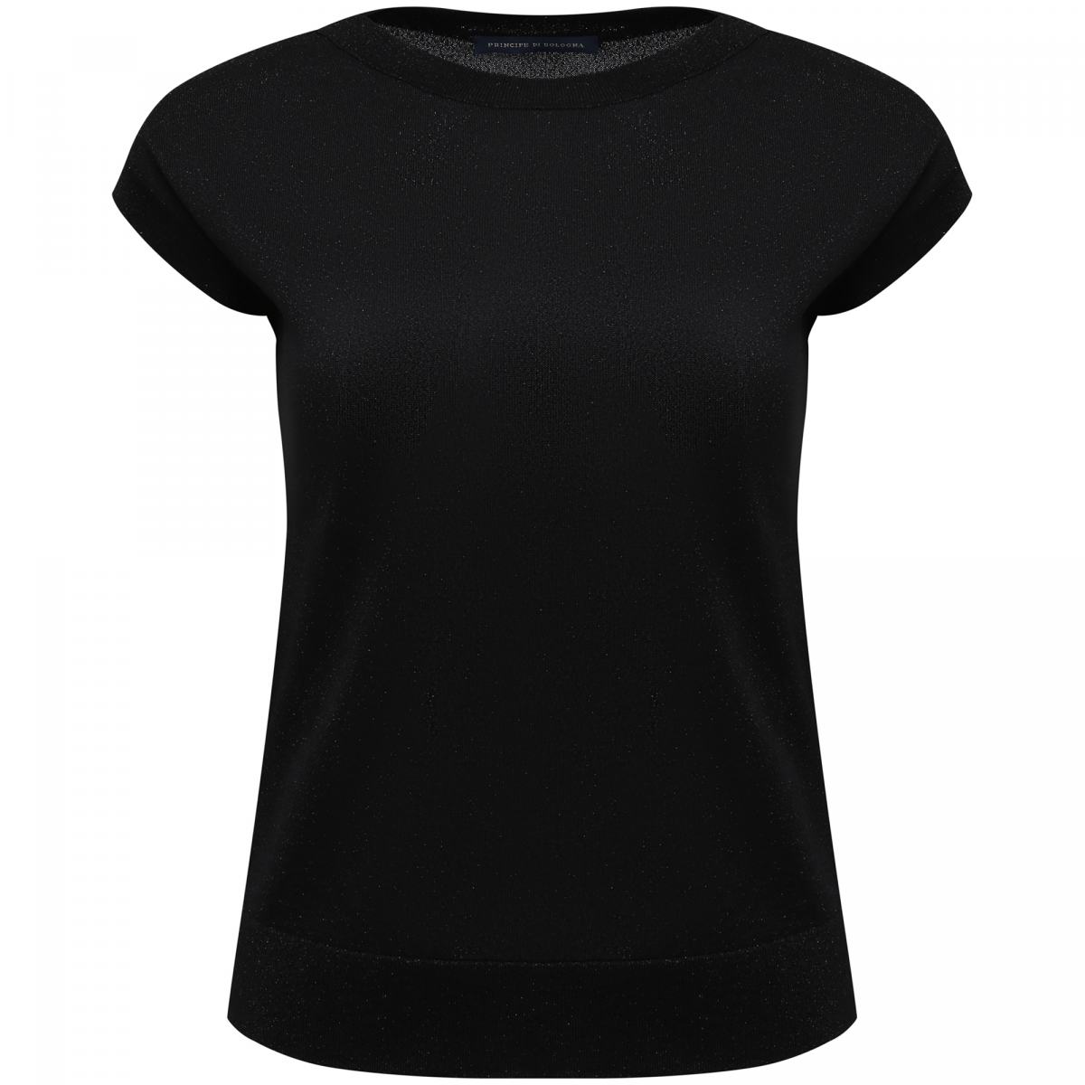 Черная футболка Principe di Bologna в классическом дизайне отлично подойдет для деловых и повседневные образов. Модель выполнена из тонкого трикотажа, в составе которого 80% вискозы, а также волокна полиамида и полиэстера, которые позволяют держать форму изделия. Футболку можно носить комплектом с юбкой длины миди из капсулы бренда или сочетать с любыми другими низами.