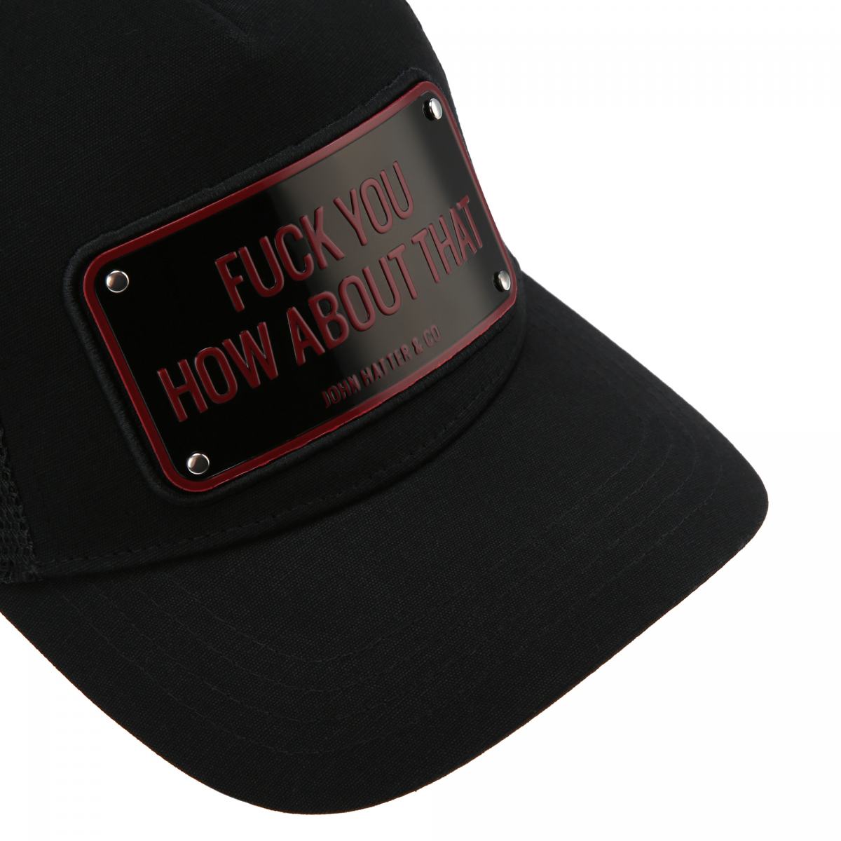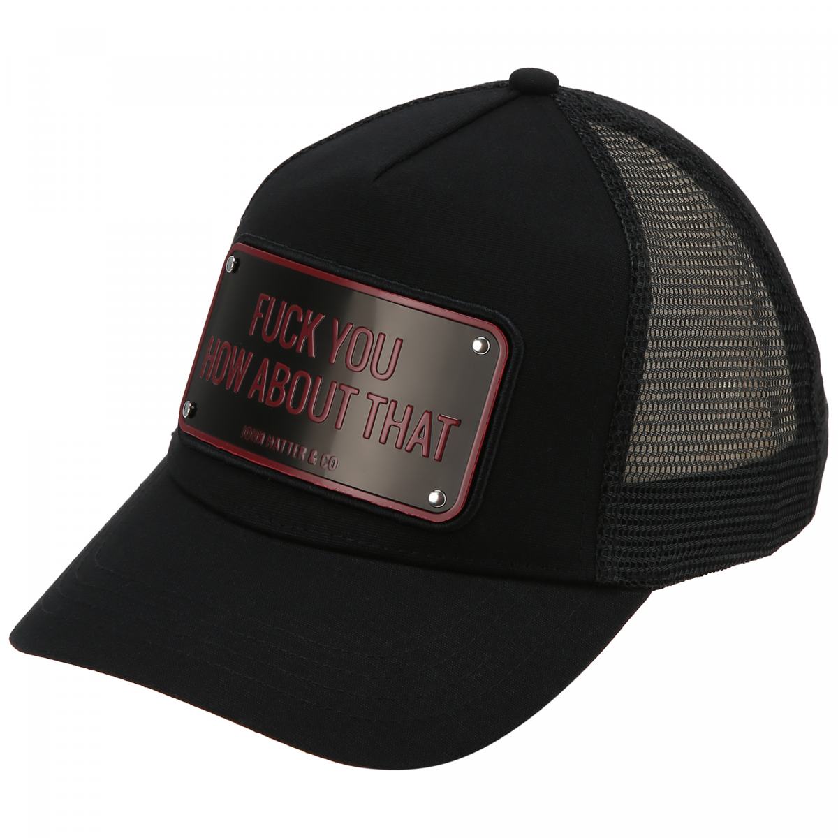 Кепка в чёрном цвете от John Hatter&Co. Аксессуар, способный подчеркнуть любой образ. Кепка выполнена из плотной ткани спереди и ткани-сетки сзади. Табличка с текстовым принтом служит акцентом дизайна. Регулировать размер можно с помощью застёжки на кнопки.