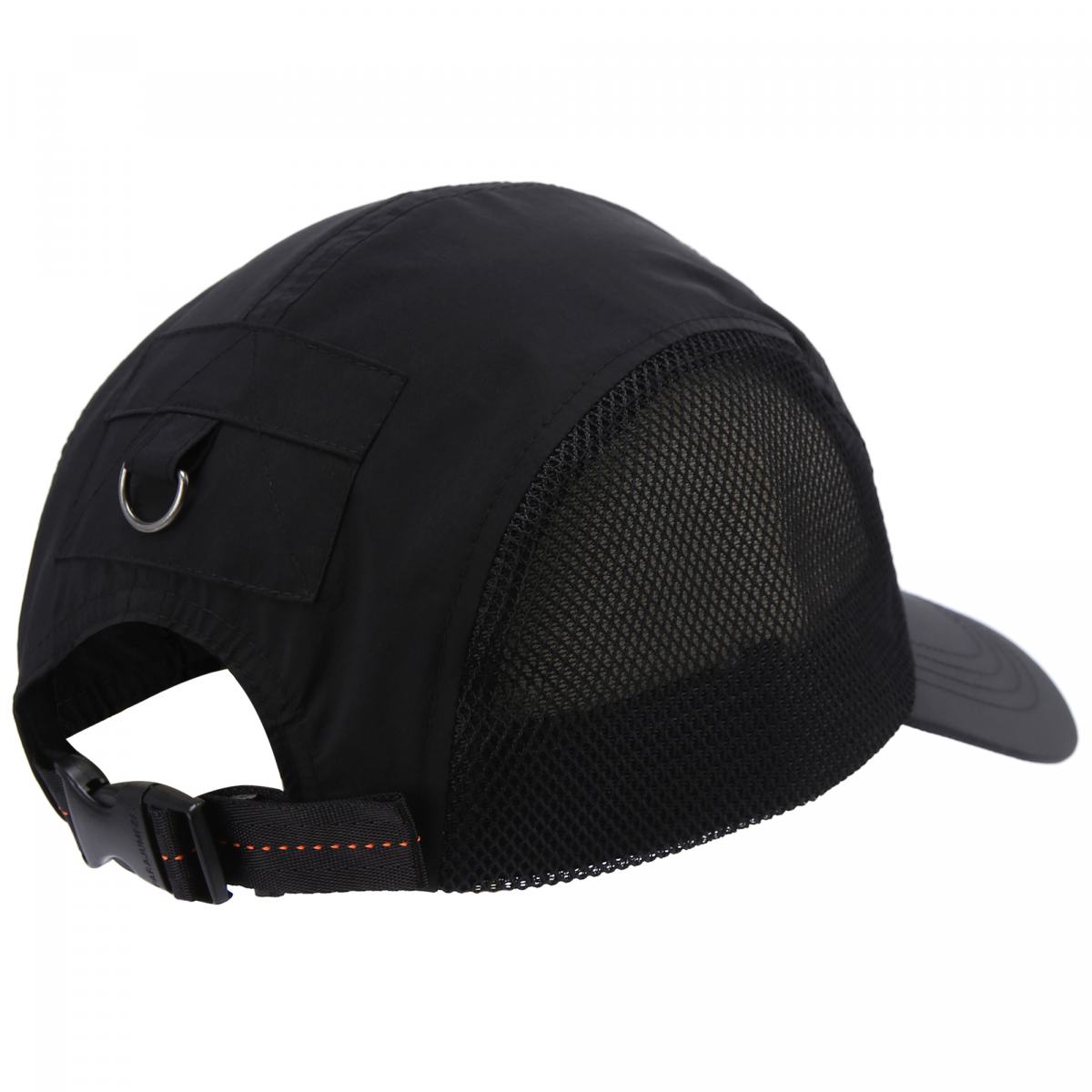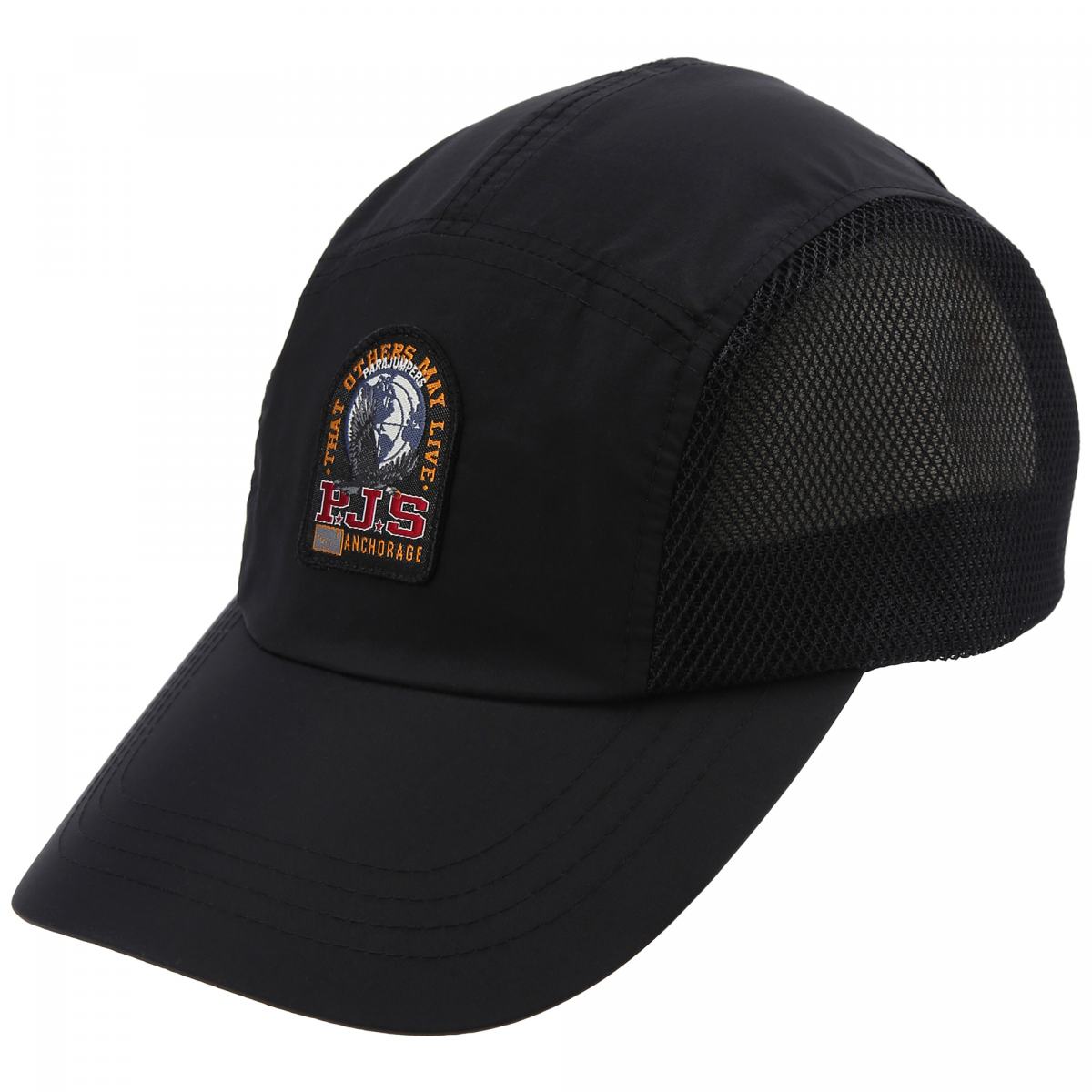 Чёрная кепка от Parajumpers. Панама выполнена из плотной ткани без подкладки. Боковые стороны выполнены из ткани-сетки. Спереди фирменная нашивка Parajumpers. Регулировать размер можно с помощью ремешка с автоматической застёжкой сзади.