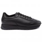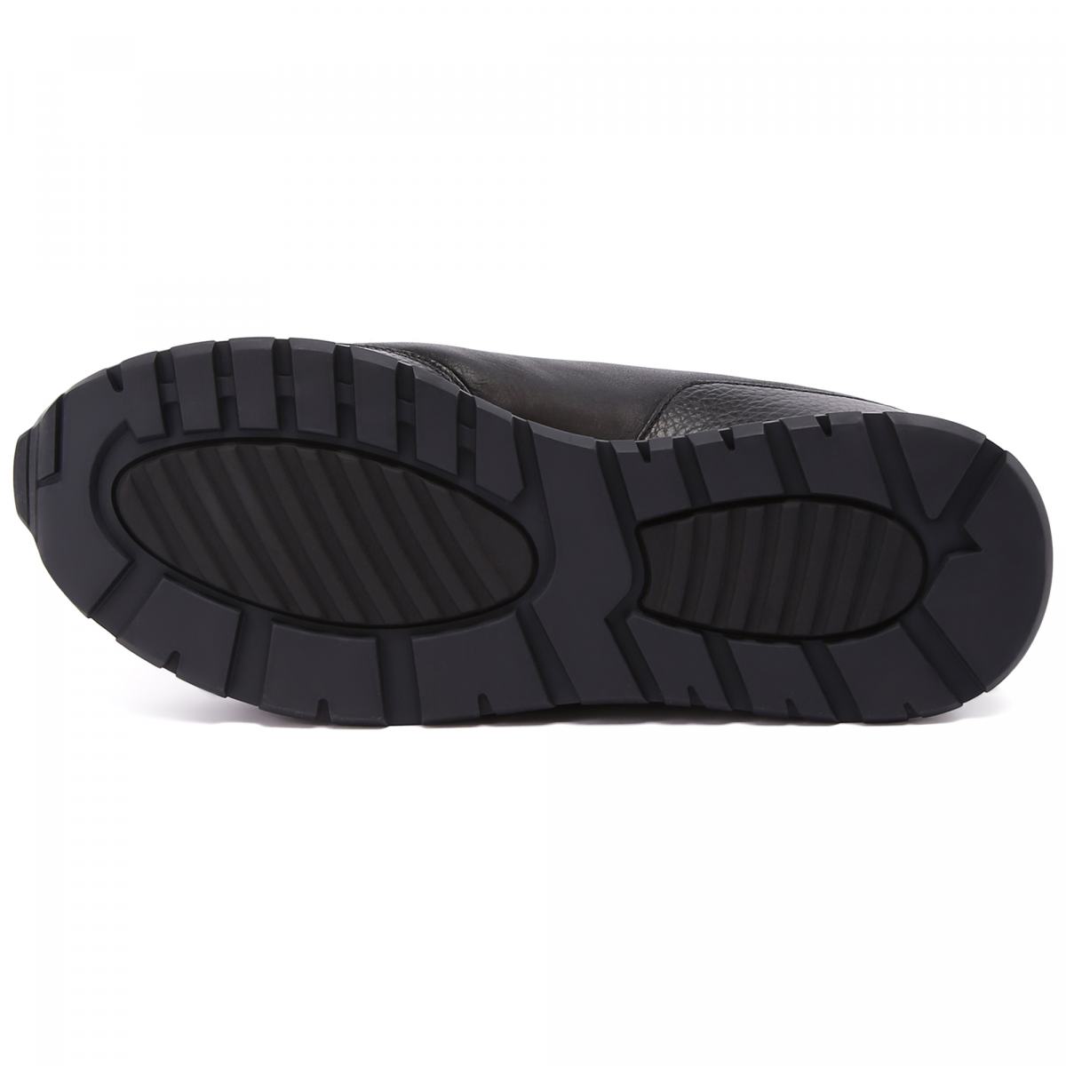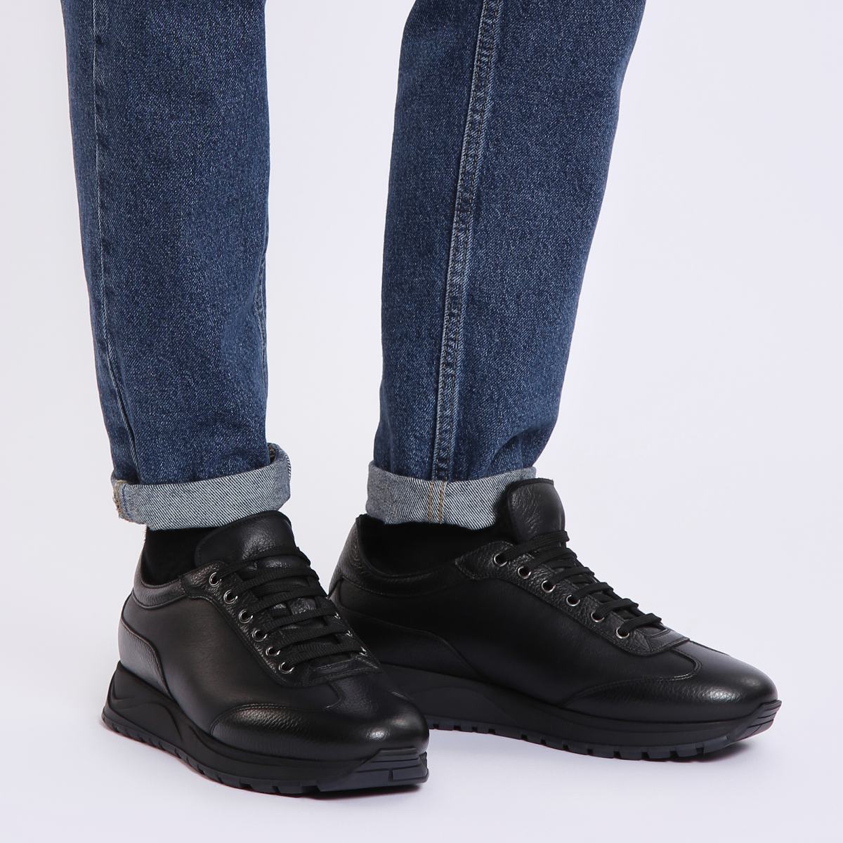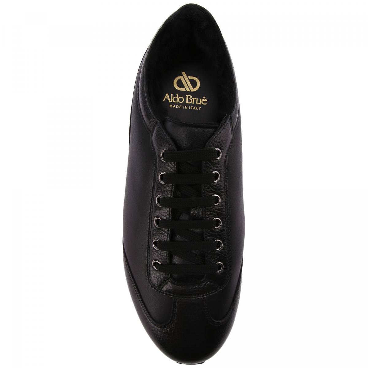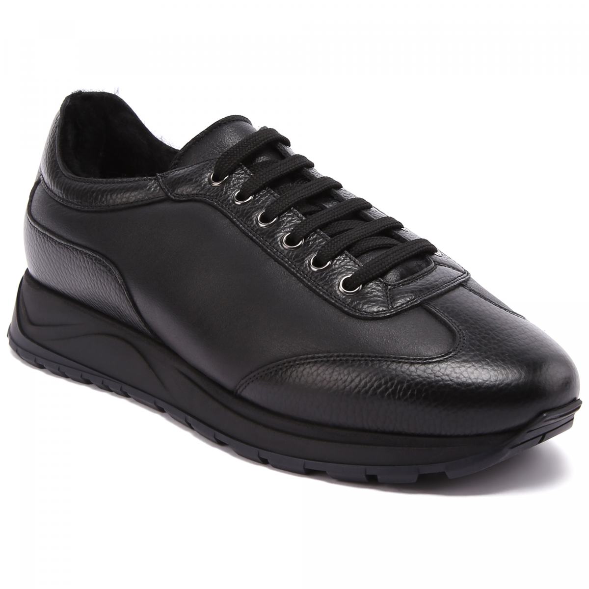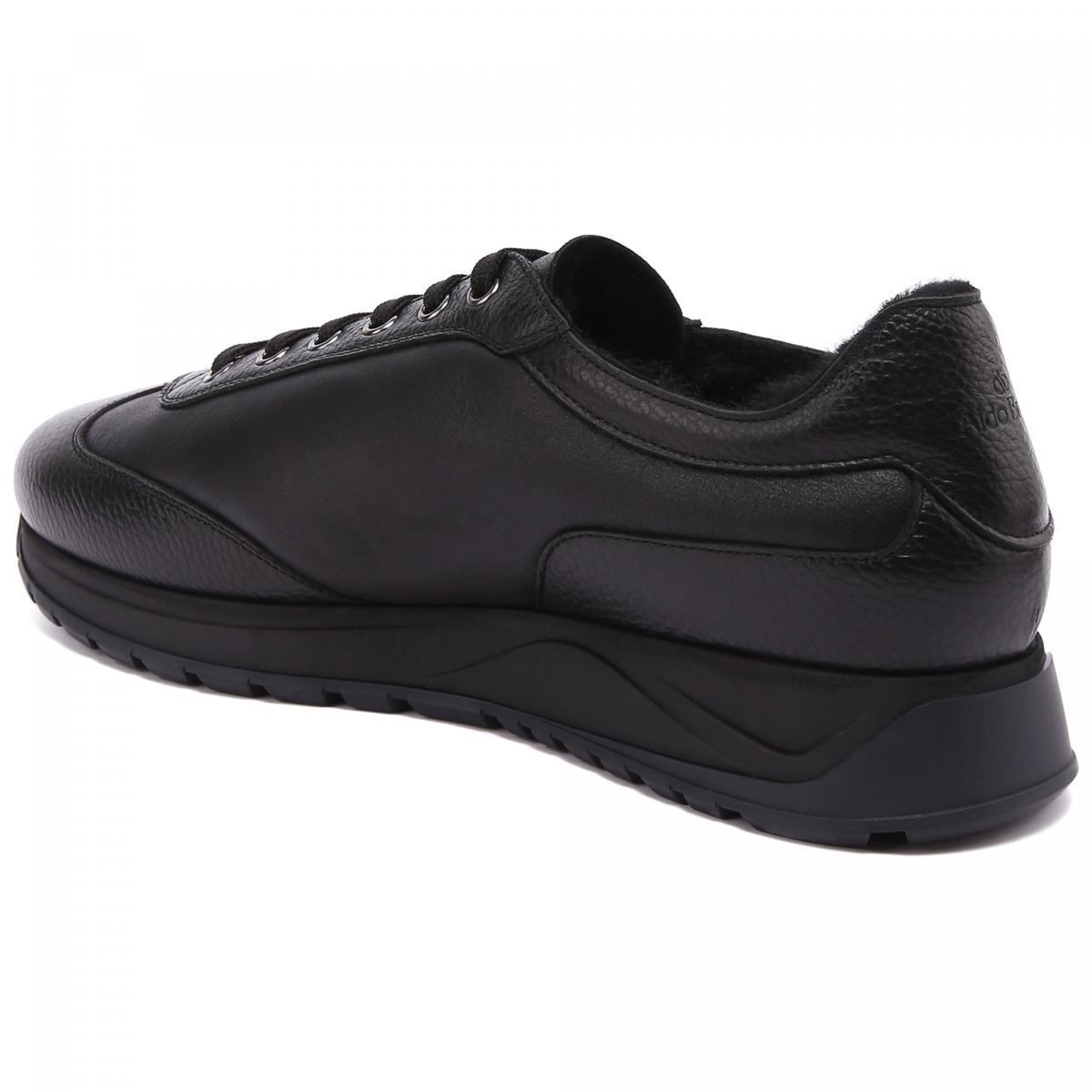 Кроссовки в чёрном цвете от Aldo Brue. Пара в спортивном стиле выполнена из натуральной гладкой чёрной кожи. Высокая резиновая подошва дарит дополнительный комфорт в каждом шаге, а текстильная шнуровка в цвет позволяет подогнать обувь точно под вашу ногу. Внутри утеплённые подкладка и стелька из меха.