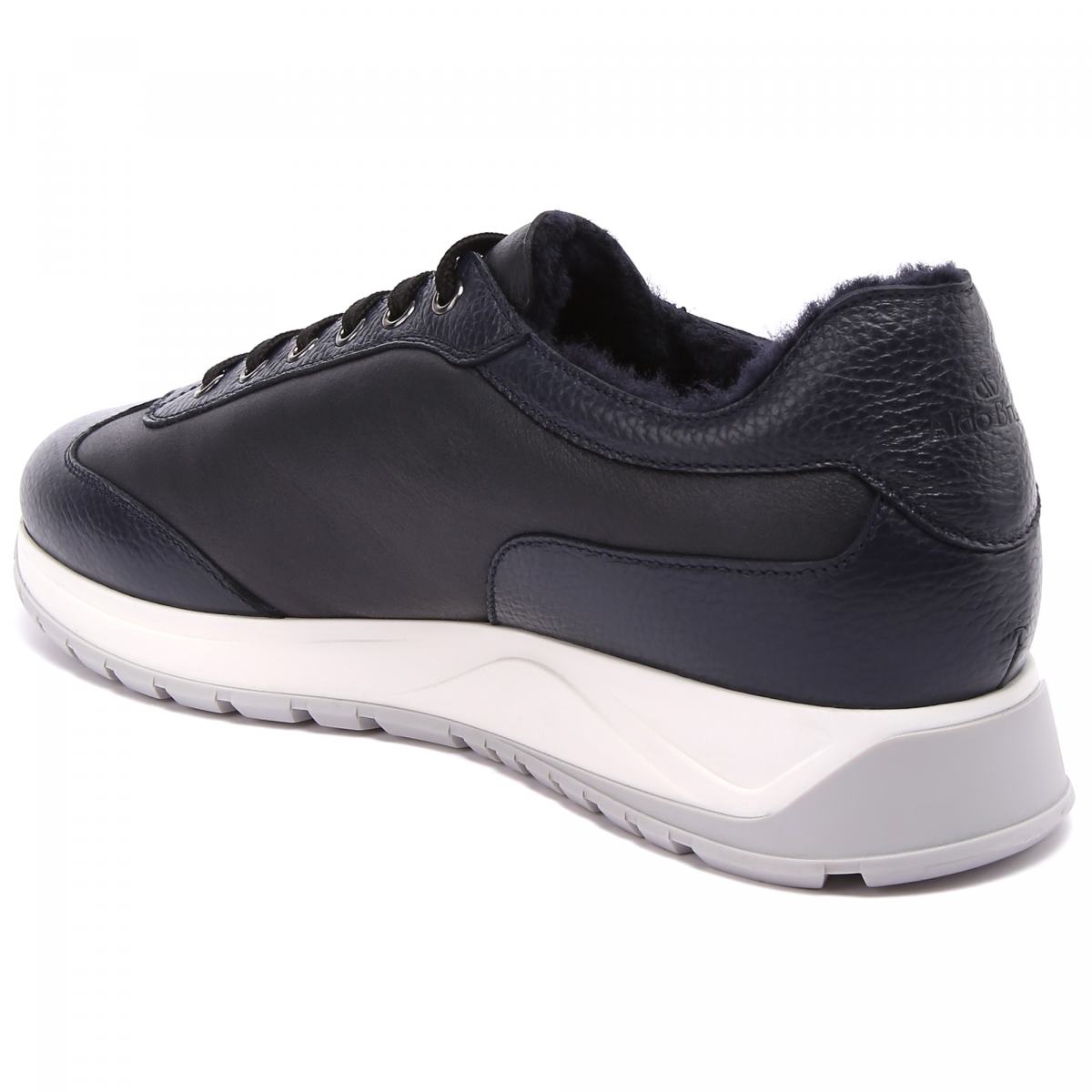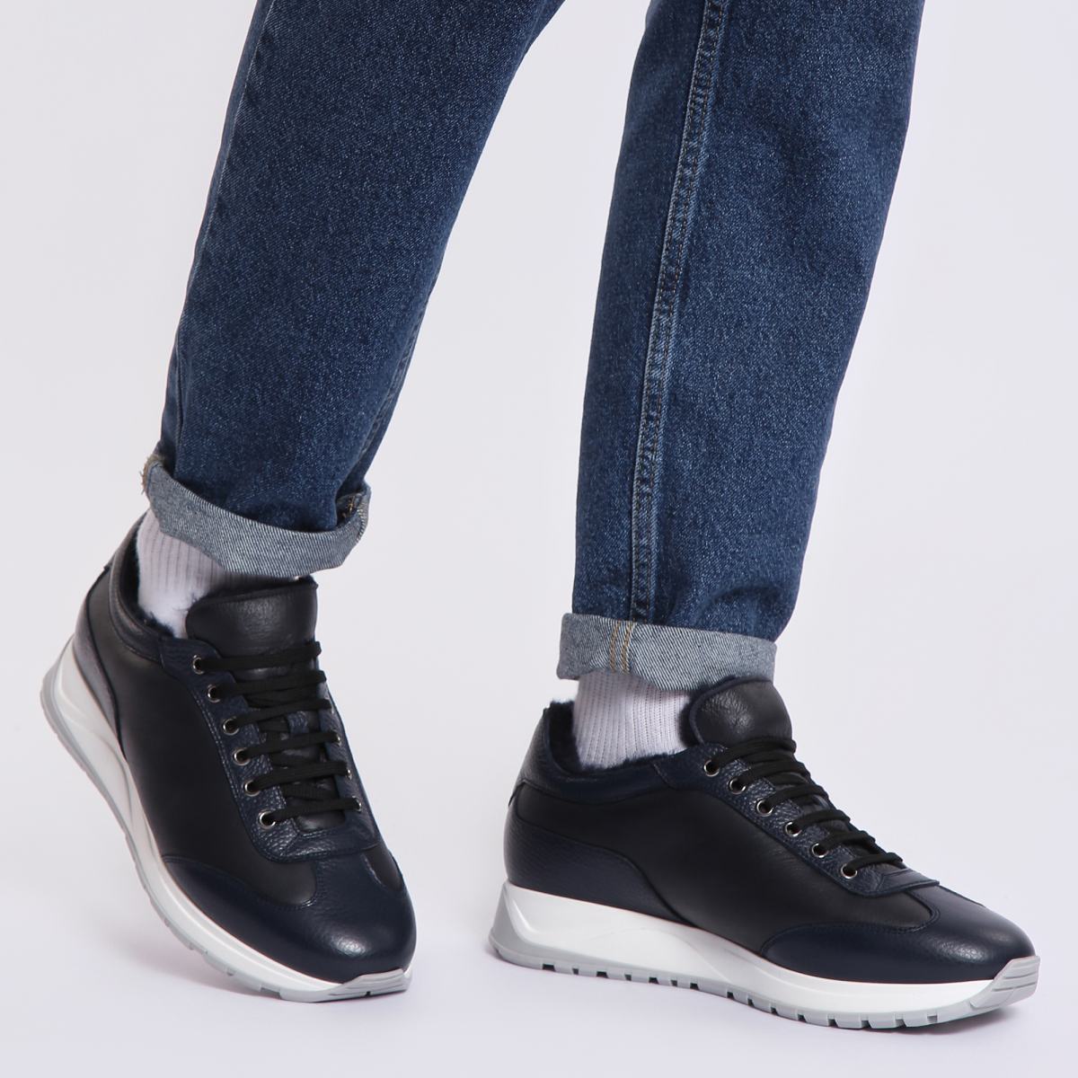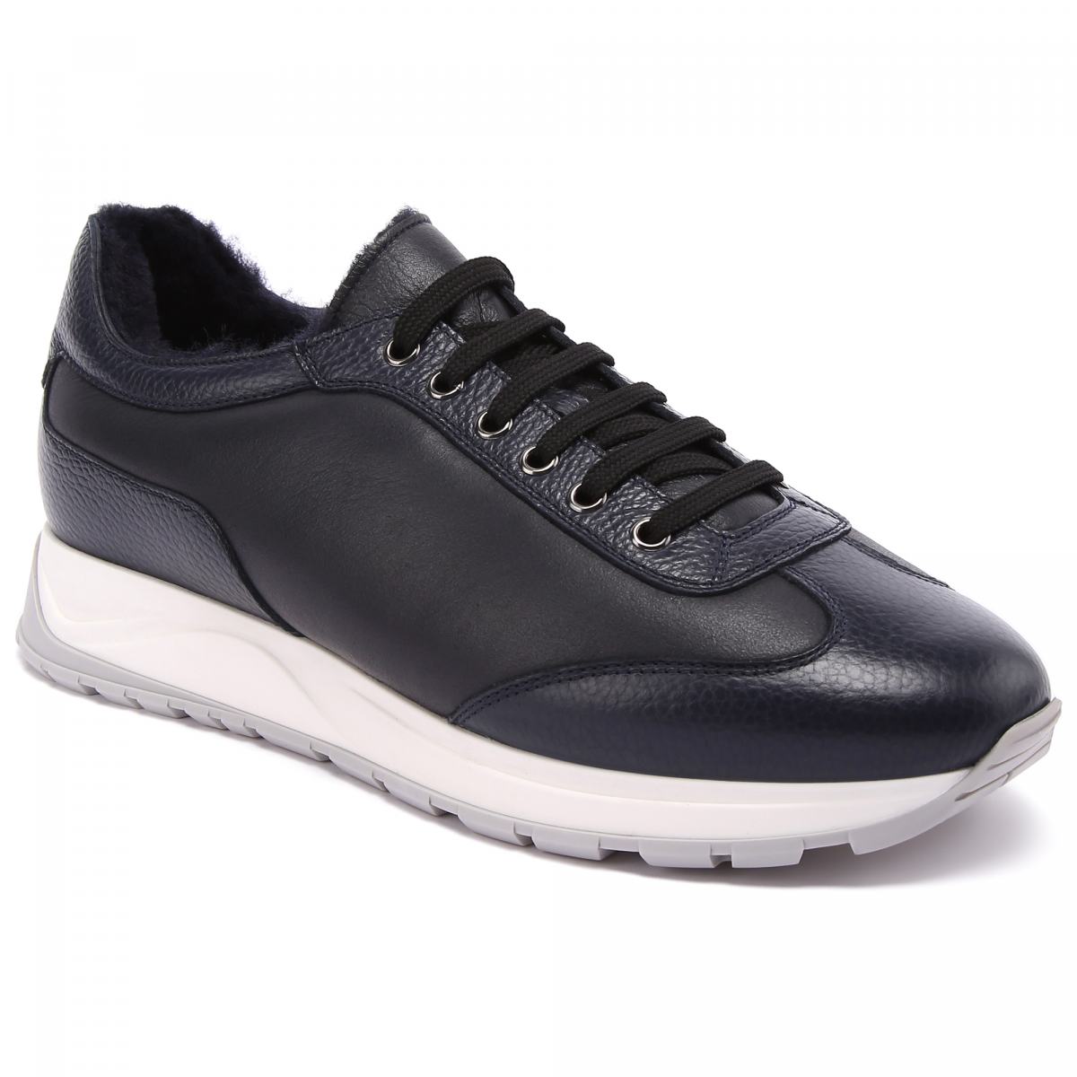 Кроссовки в тёмно-синем цвете от Aldo Brue. Пара в спортивном стиле выполнена из гладкой натуральной кожи. Высокая резиновая подошва дарит дополнительный комфорт в каждом шаге, а текстильная шнуровка в цвет позволяет подогнать обувь точно под вашу ногу. Внутри утеплённые подкладка и стелька из меха.