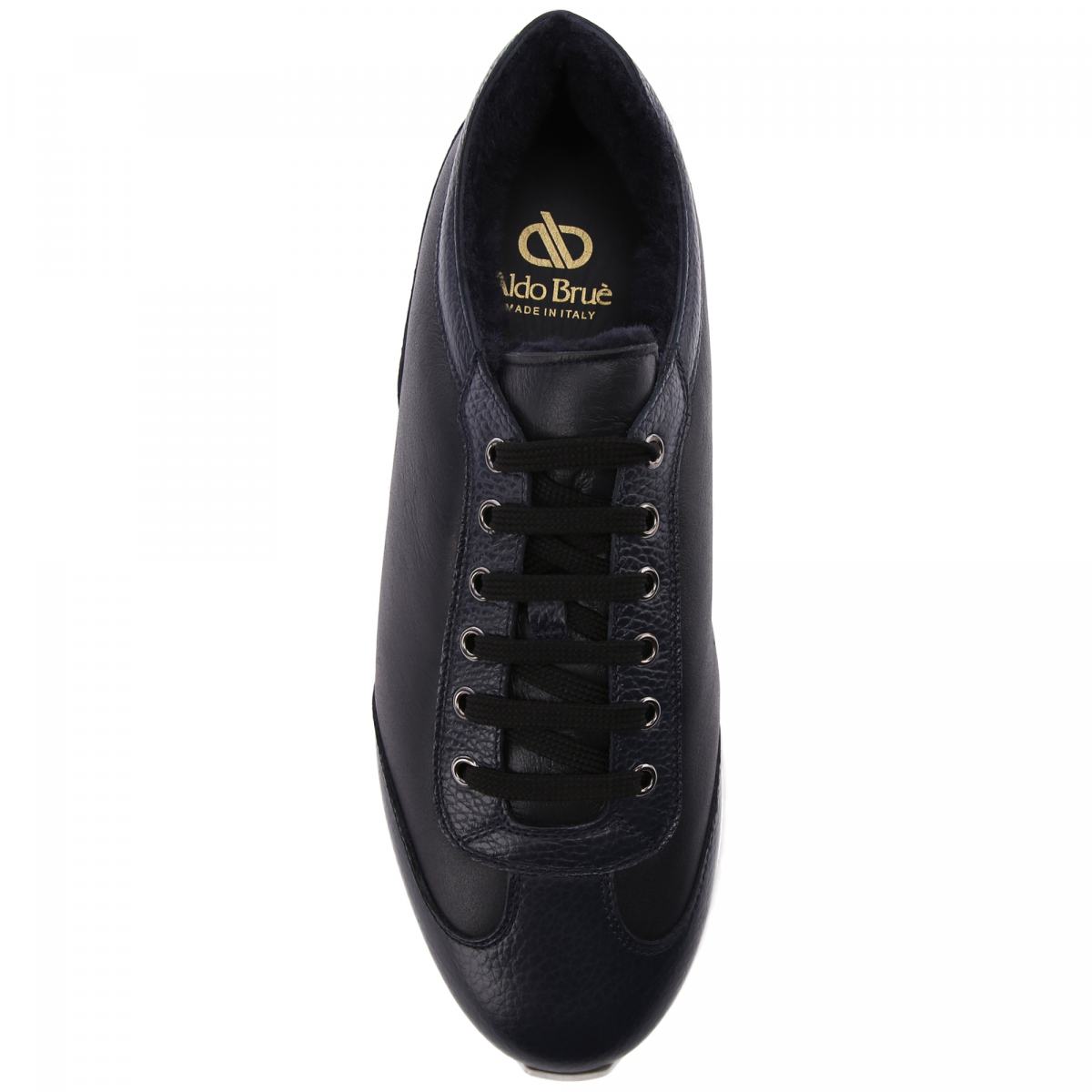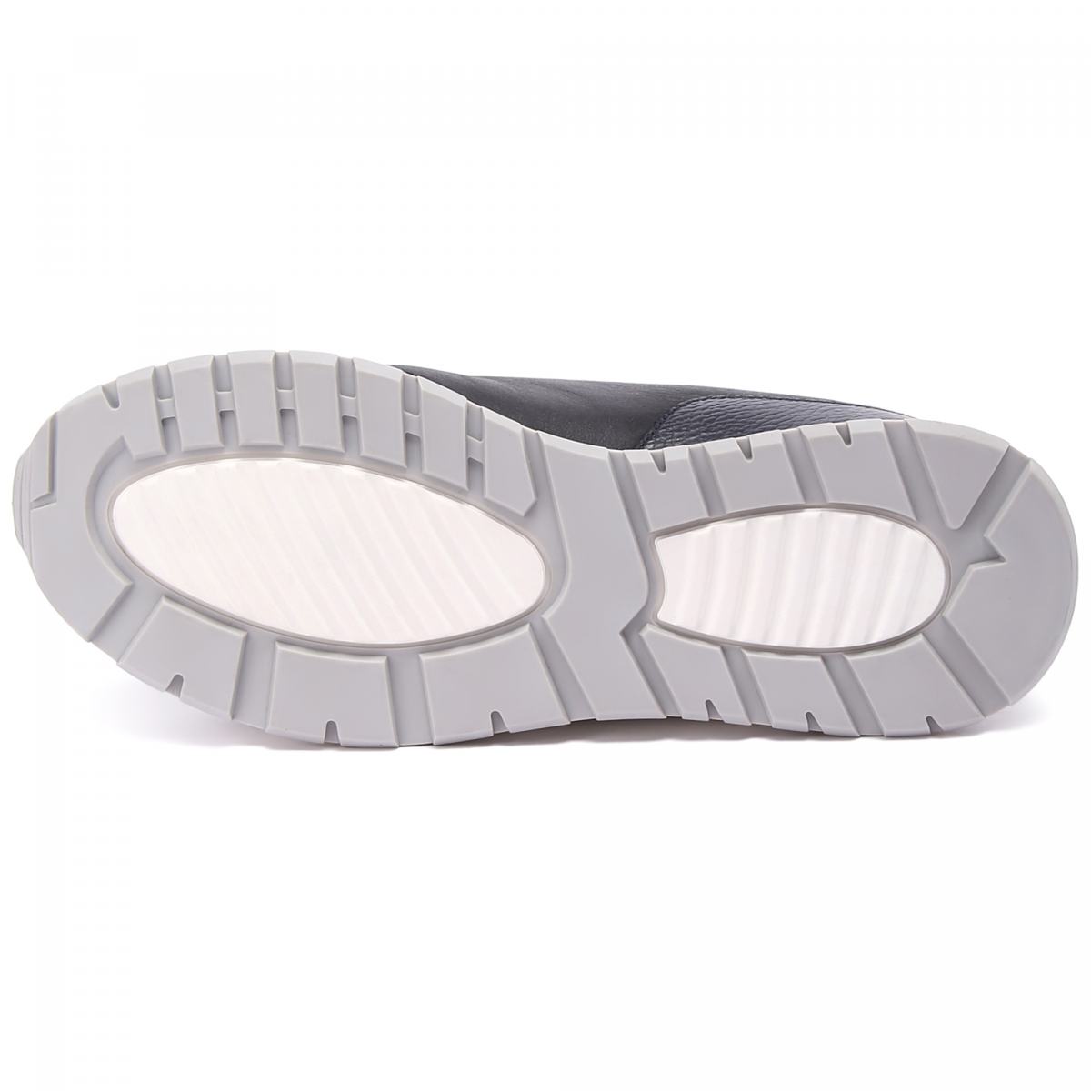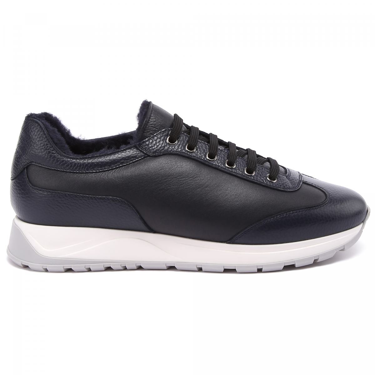 Кроссовки в тёмно-синем цвете от Aldo Brue. Пара в спортивном стиле выполнена из гладкой натуральной кожи. Высокая резиновая подошва дарит дополнительный комфорт в каждом шаге, а текстильная шнуровка в цвет позволяет подогнать обувь точно под вашу ногу. Внутри утеплённые подкладка и стелька из меха.