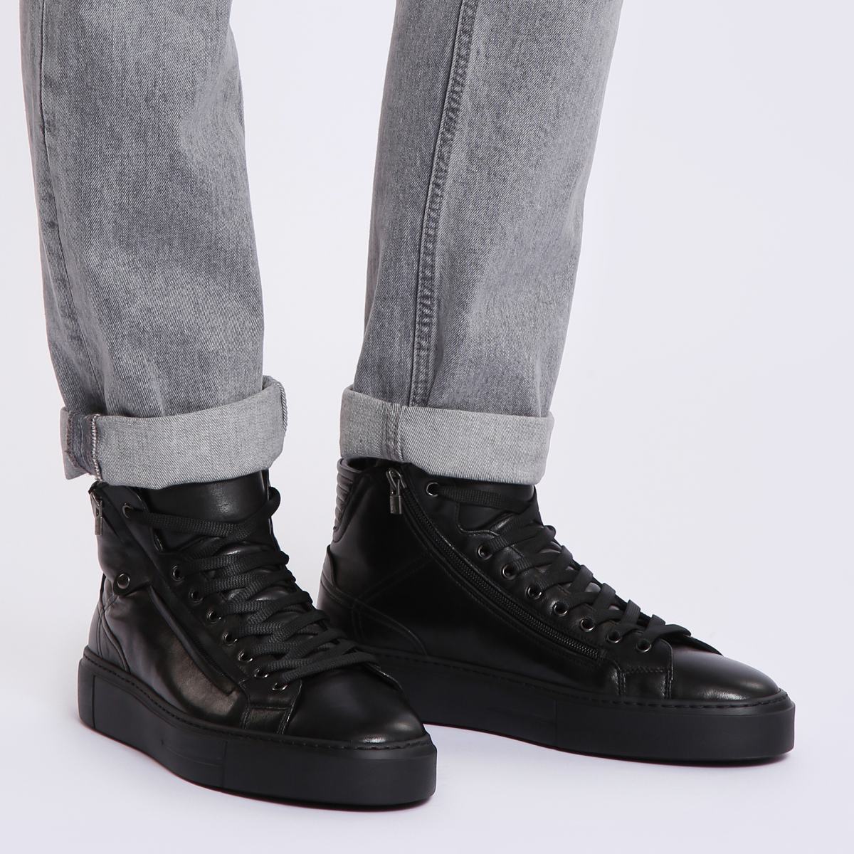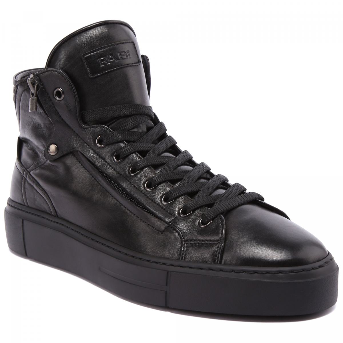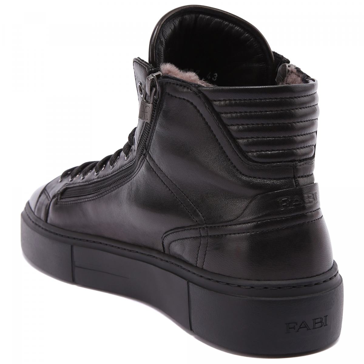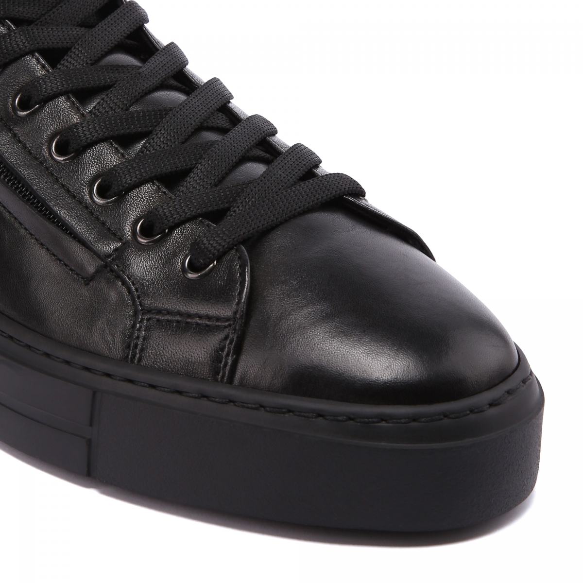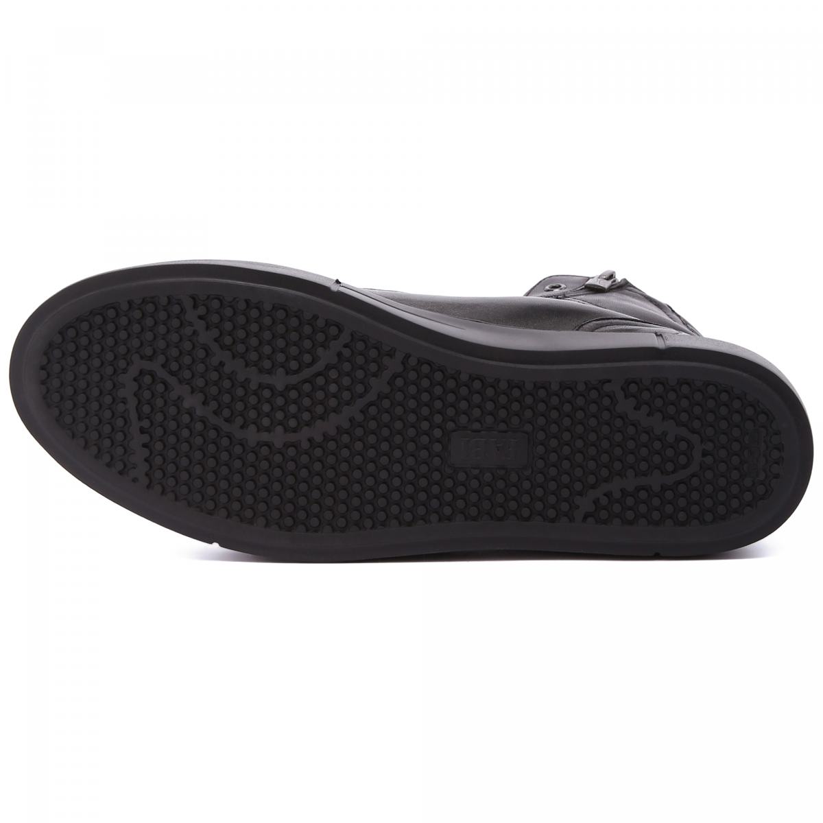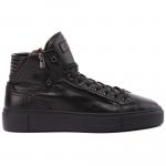 Высокие черные кроссовки в оригинальном дизайне помогут создать смелые образы. Модель выполнена из натуральной кожи, на резиновой подошве. Внутри подклад и стелька из натурального меха, поэтому такая пара может стать альтернативой ботинкам. Кроссовки застёгиваются на две молнии, расположенные по бокам. Прошитая пятка и логотип на язычке завершают дизайн. Кроссовки будут отлично смотреться как с прямыми, так и с зауженными брюками.