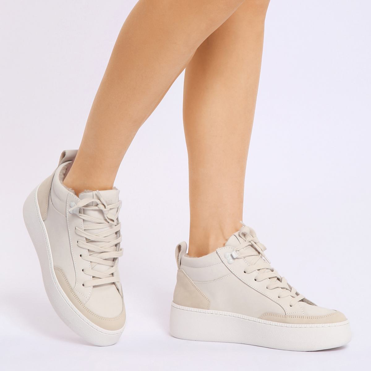 Кроссовки из натуральной кожи в бежевом цвете от Principe di Bologna. Стильная модель, подходящая для городских образов с джинсами или casual брюками. Кроссовки выполнены из гладкой кожи, на пятке вставка из натуральной замши. Высокая белая подошва выполнена из резины. Модель из зимней коллекции бренда, с утеплённой шерстяной подкладкой и стелькой.
