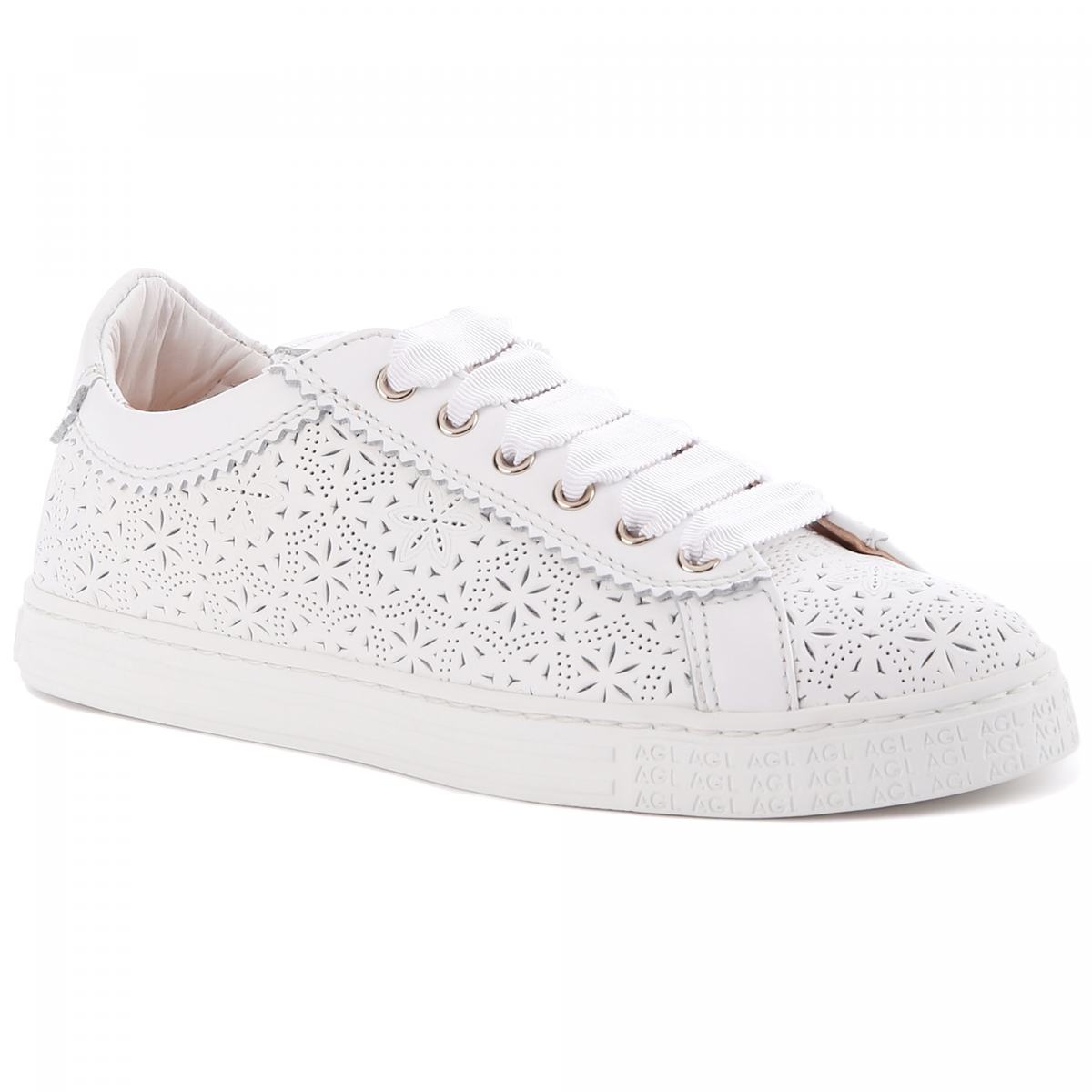 Белые кроссовки из натуральной кожи от AGL. Перфорированный цветочный узор на коже делает кроссовки SADE SPRING романтичным и женственным предложением. Это — passe partout весны, с их дерзким видом и широкой цветовой гаммой, в которой они предлагаются. Подошва выполнена из резины, подкладка и стелька - из натуральной кожи.