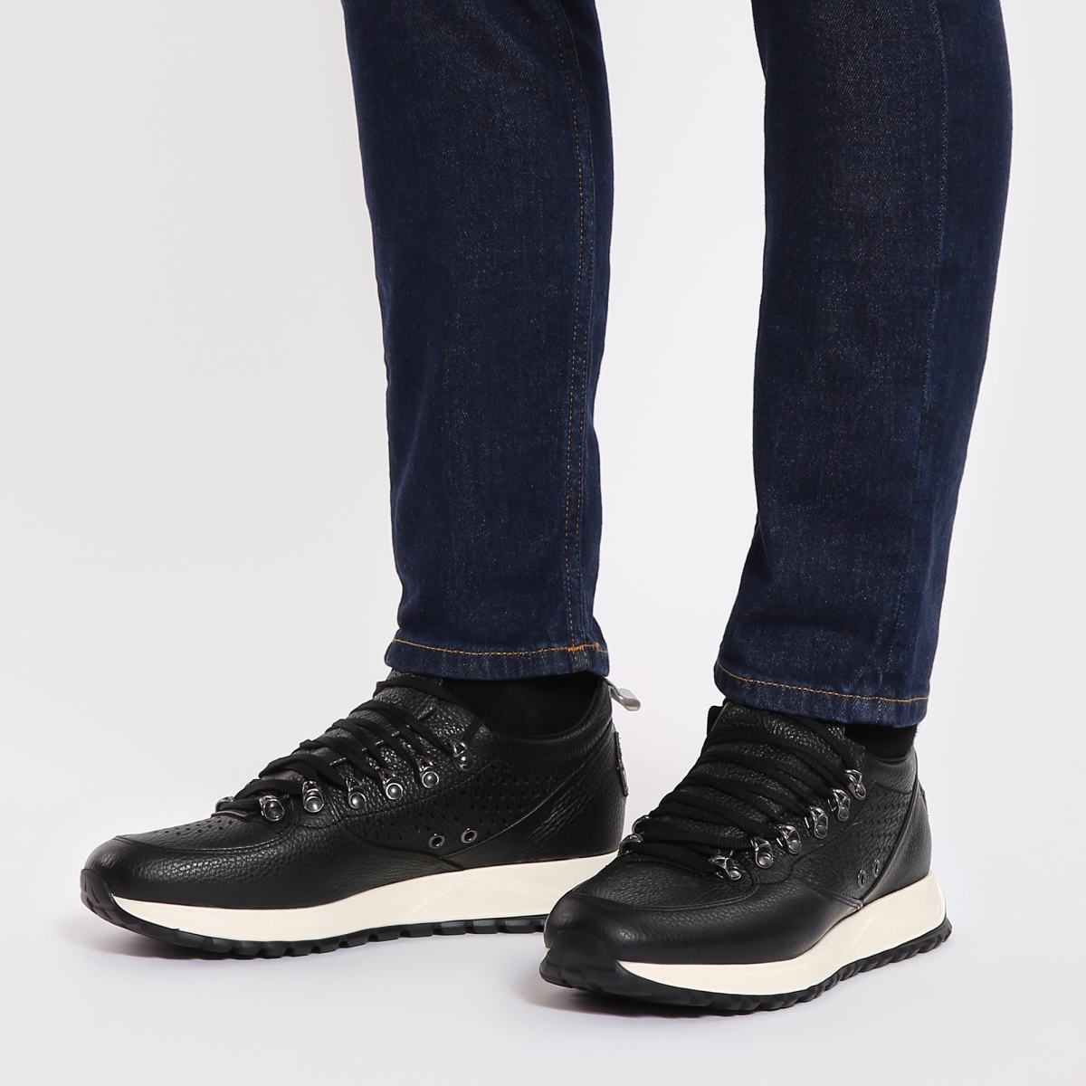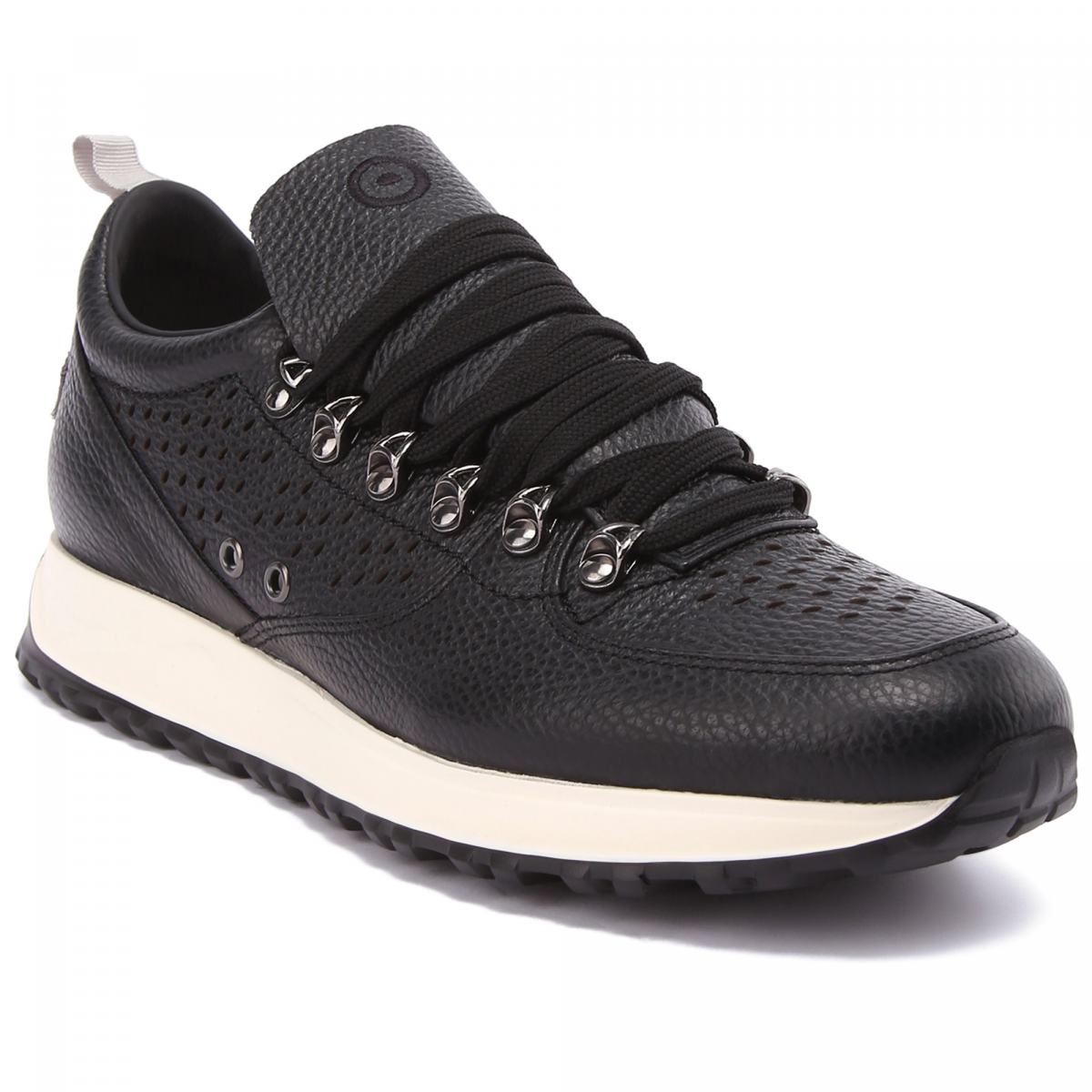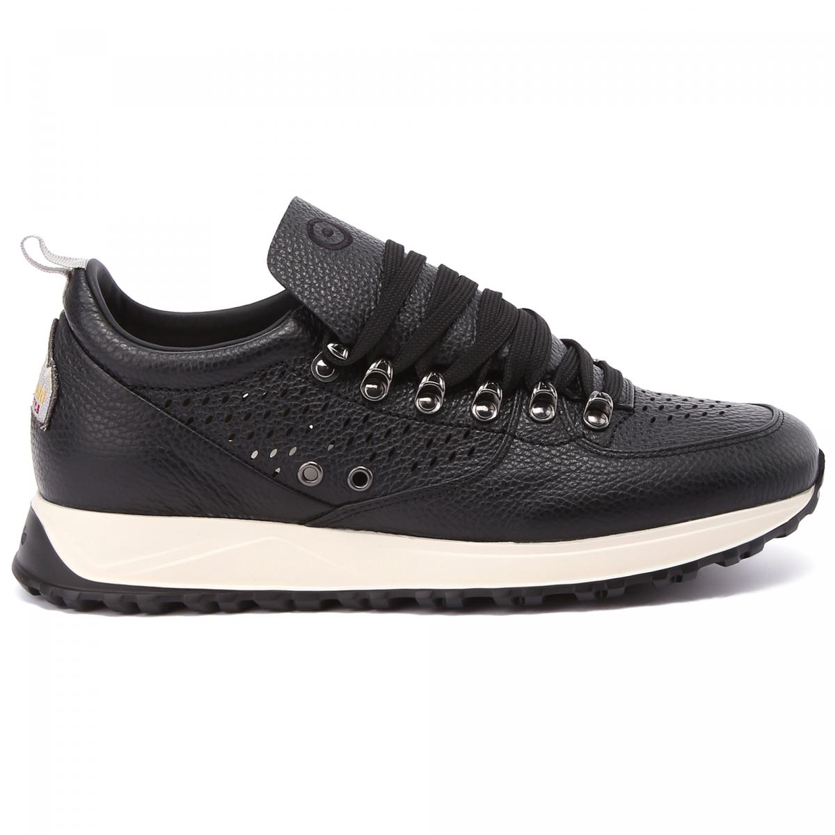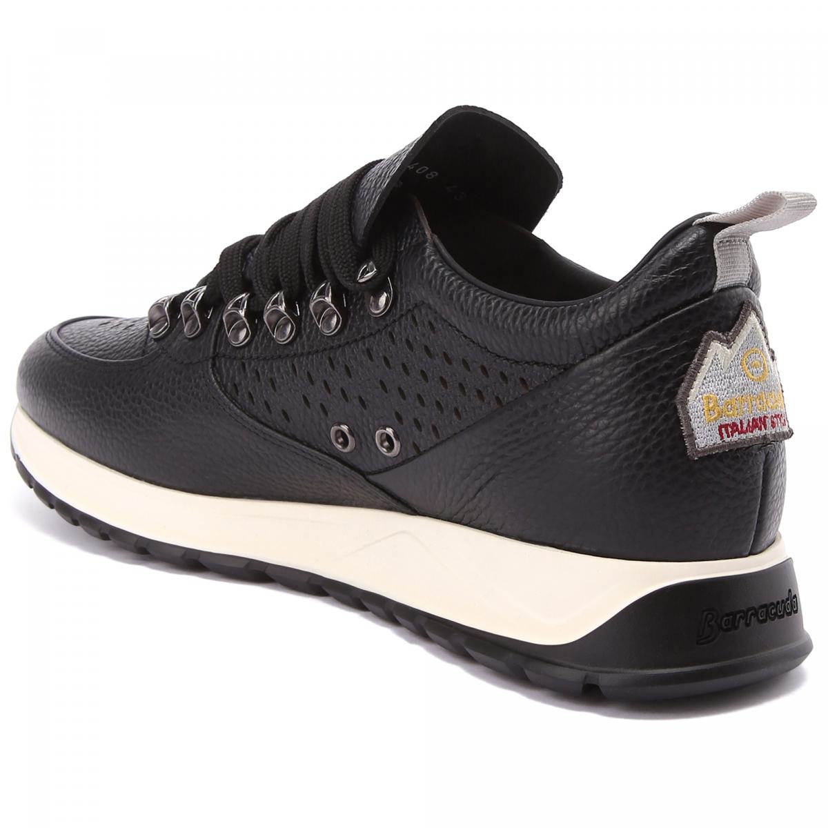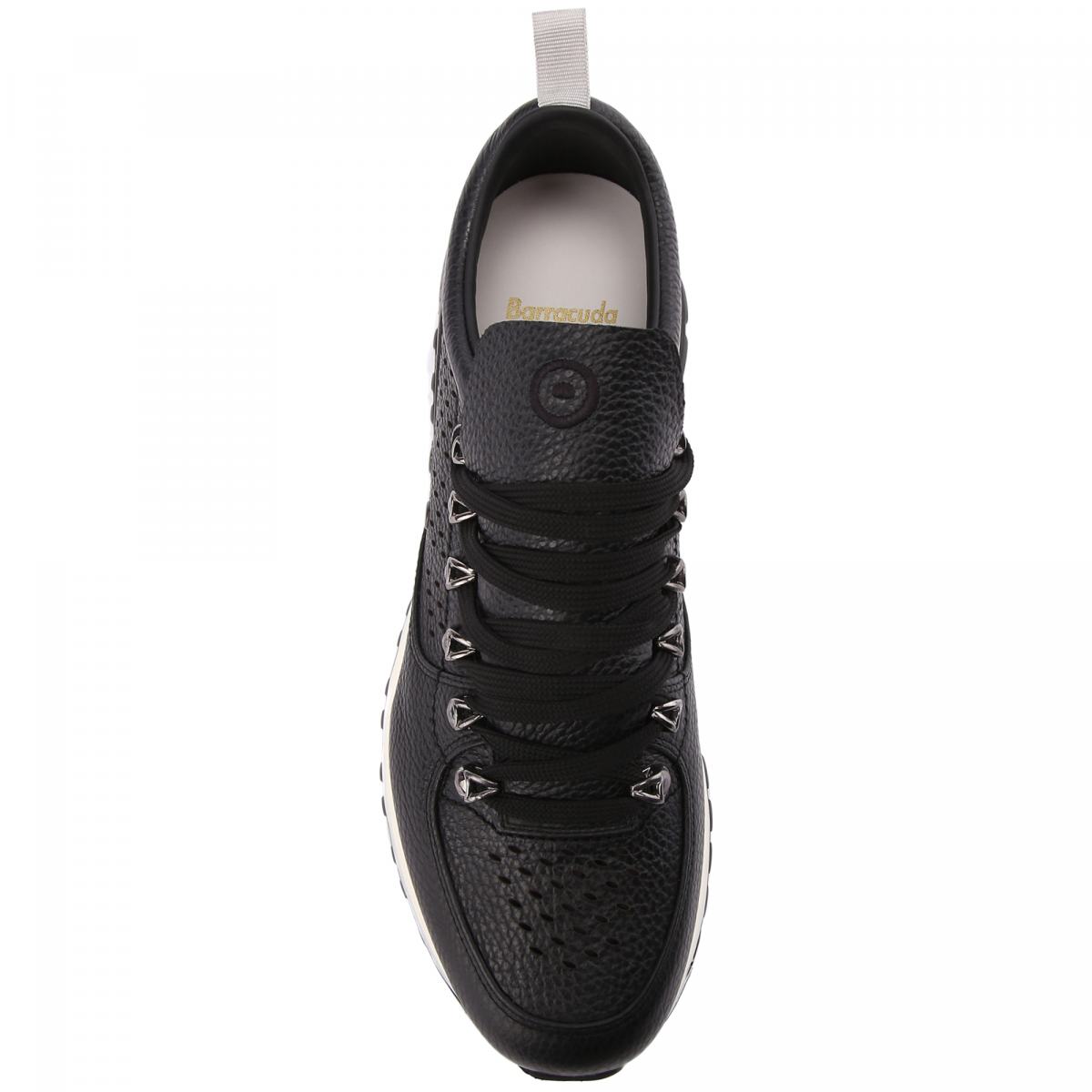 Городские кроссовки из чёрной кожи от Barracuda. Модель с объёмным язычком создана итальянскими дизайнерами с учётом современных модных тенденций. Кроссовки дополнены текстильной шнуровкой в цвет, перфорацией спереди и по бокам и комфортной подошвой из резины. Благодаря мягкой стельке из натуральной кожи и сквозной перфорации эти кроссовки прекрасно подойдут на роль повседневной обуви. О принадлежности к бренду сообщает вышитый фирменный логотип на пятке.