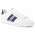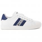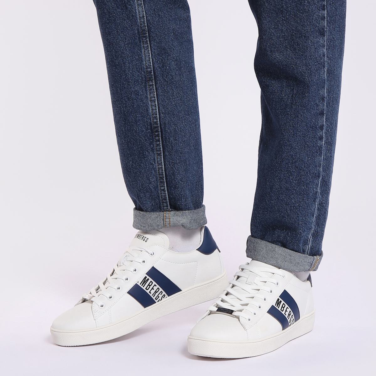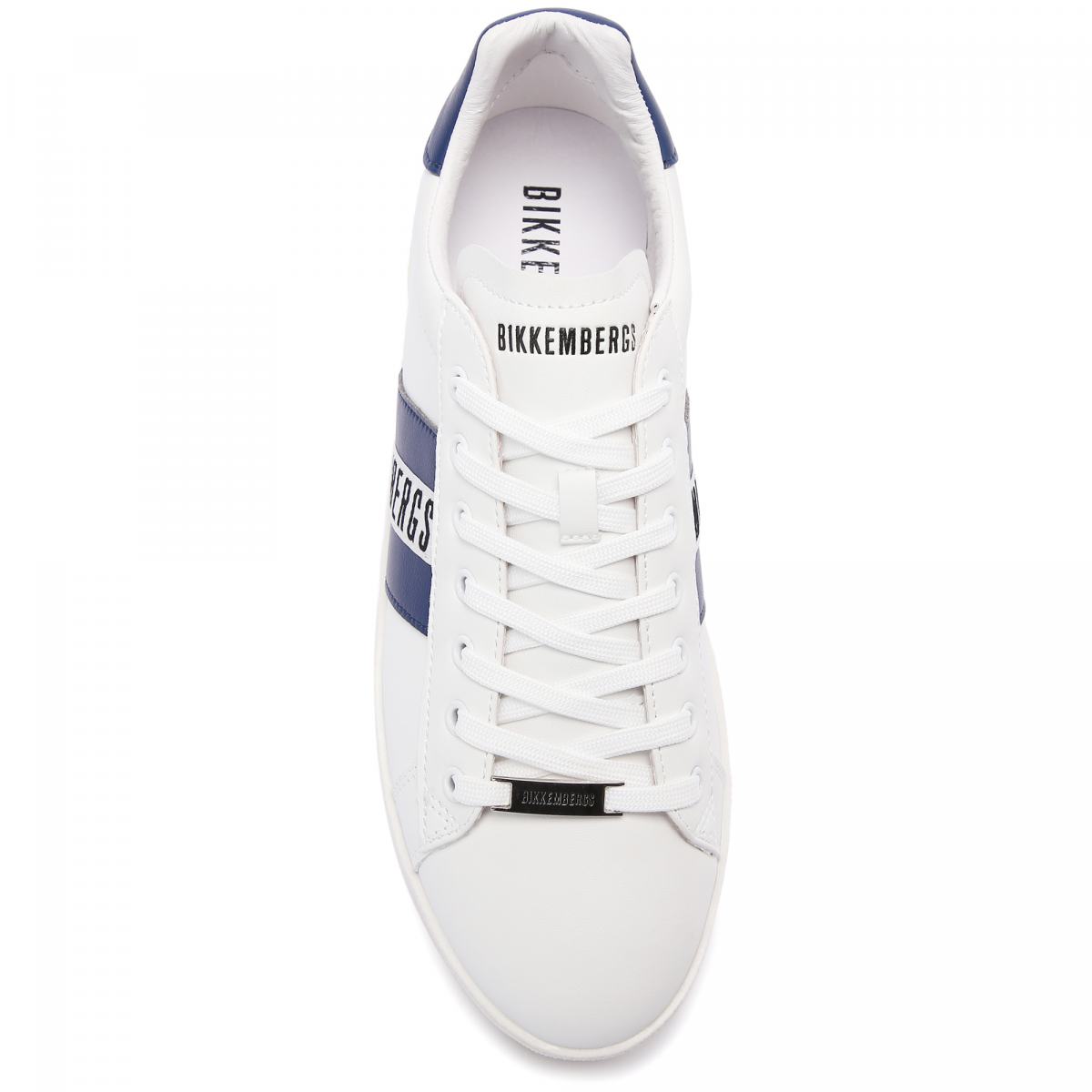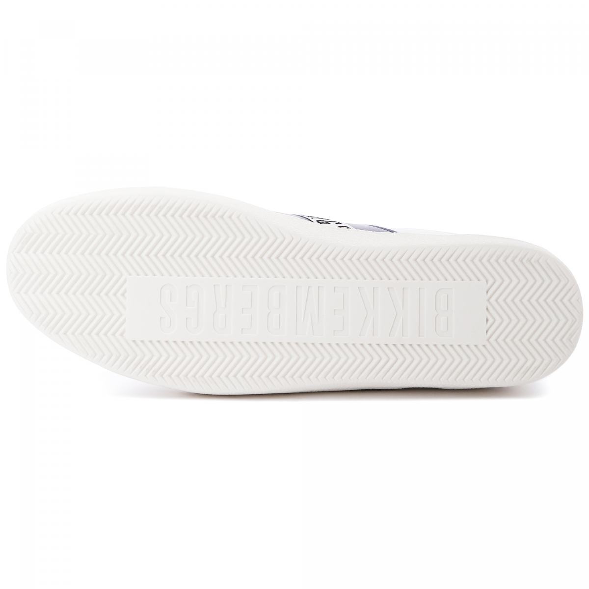 Белые кроссовки из искусственной кожи от Bikkembergs. Пара в стиле casual прекрасно подойдёт к образам с джинсами или шортами. Кроссовки выполнены из белой кожи с синими контрастными деталями: вставкой на заднике и полосками с фирменным логотипом сбоку. Дизайн завершает резиновая подошва и шнуровка белого цвета. Подкладка и стелька из натуральной кожи.