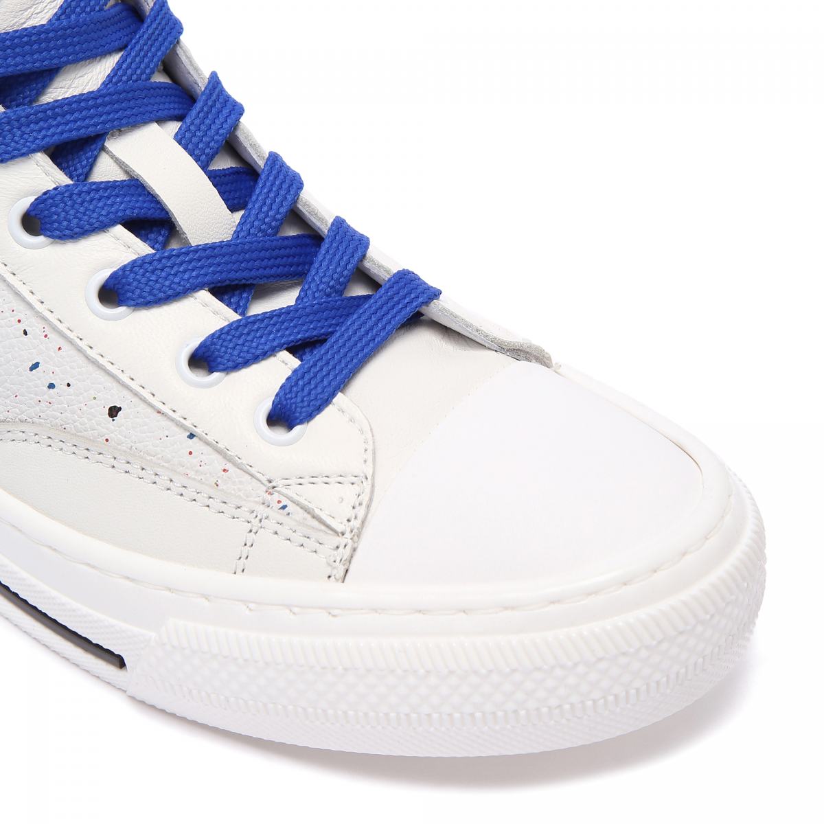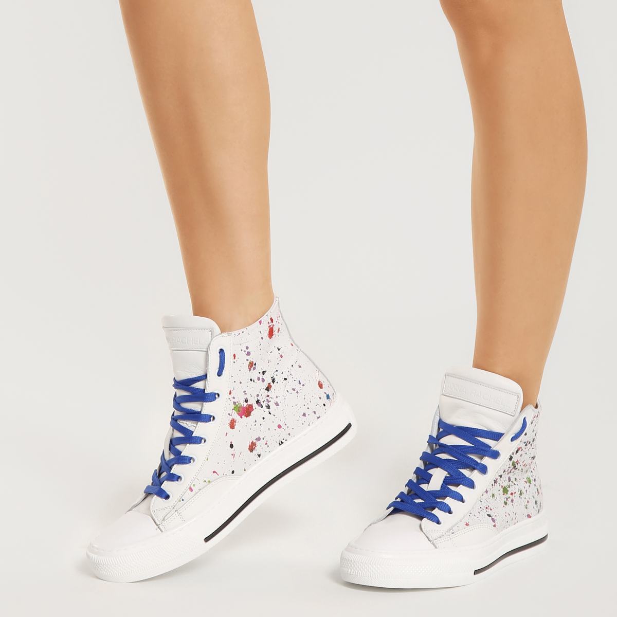 Высокие кеды из текстильной ткани от ANNA RACHELE. Белые кеды с текстильным верхом прекрасно подойдут для жаркого лета. Пара выполнена из плотной хлопковой ткани с рисунком в виде брызг красок, которой идеально сочетается с резиновой подошвой и мыском белого цвета. У пары текстильная шнуровка и вставки из гладкой белой кожи. Материал стельки- натуральная кожа.