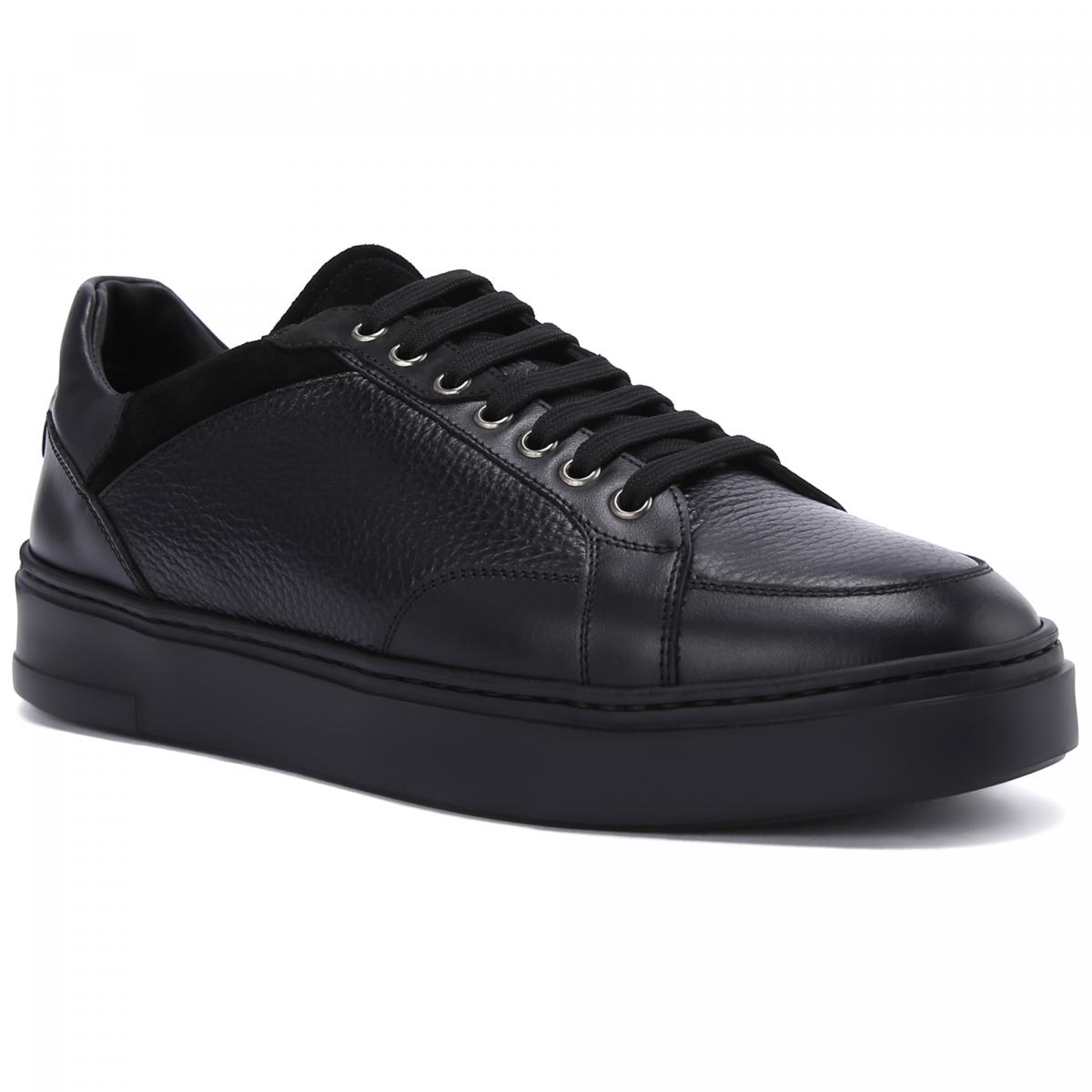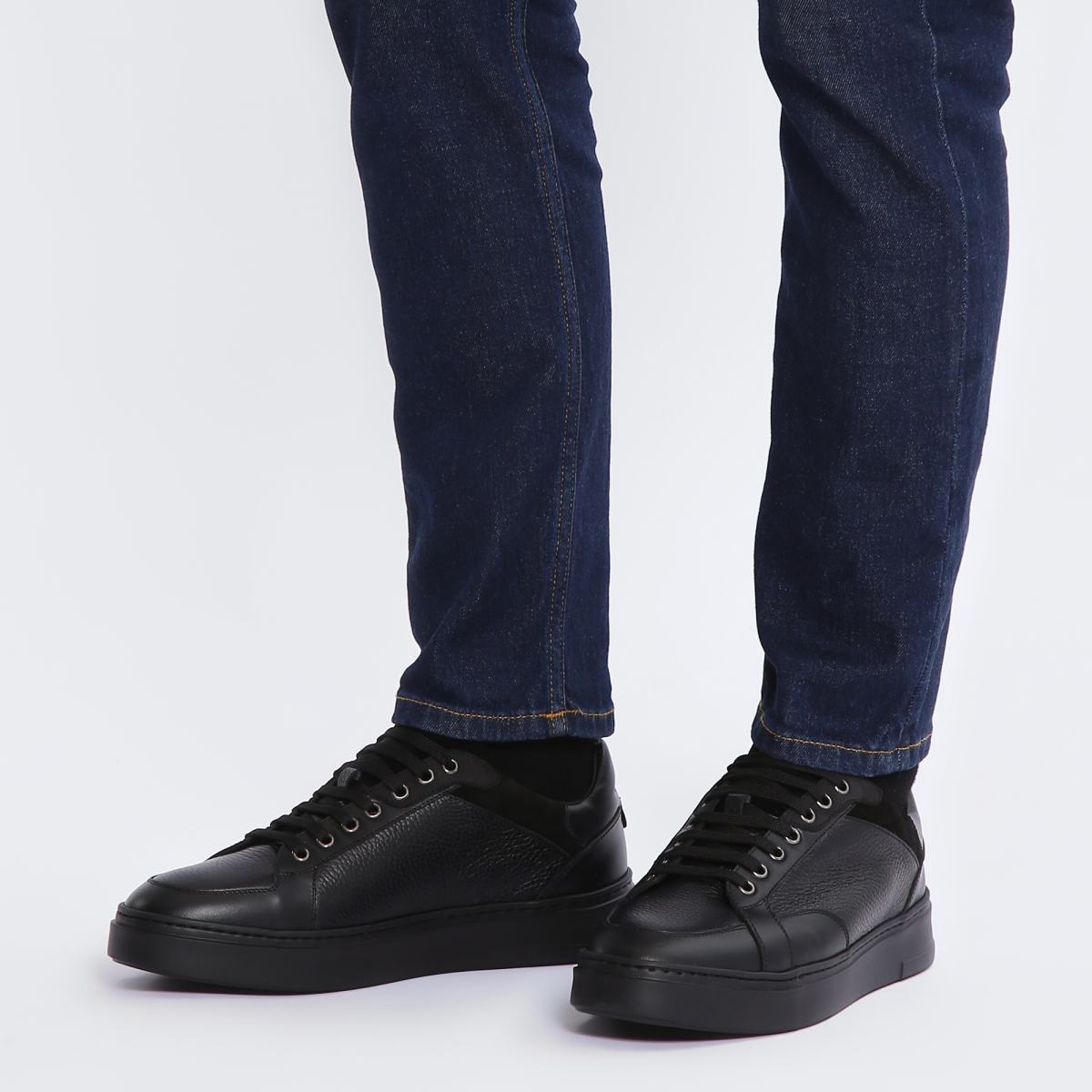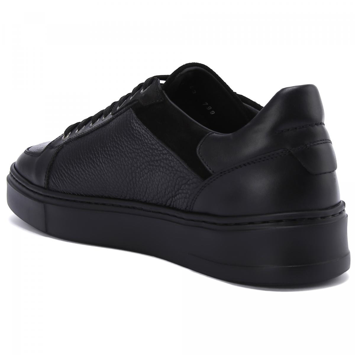 Кроссовки в чёрном цвете от Aldo Brue. Пара в спортивном стиле выполнена из натуральной кожи. Высокая резиновая подошва дарит дополнительный комфорт в каждом шаге, а текстильная шнуровка в цвет позволяет подогнать обувь точно под вашу ногу. Внутри утеплённые подкладка и стелька из меха.