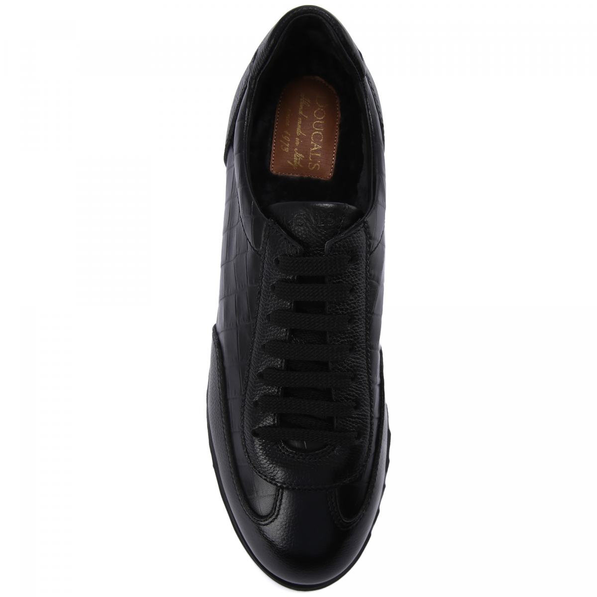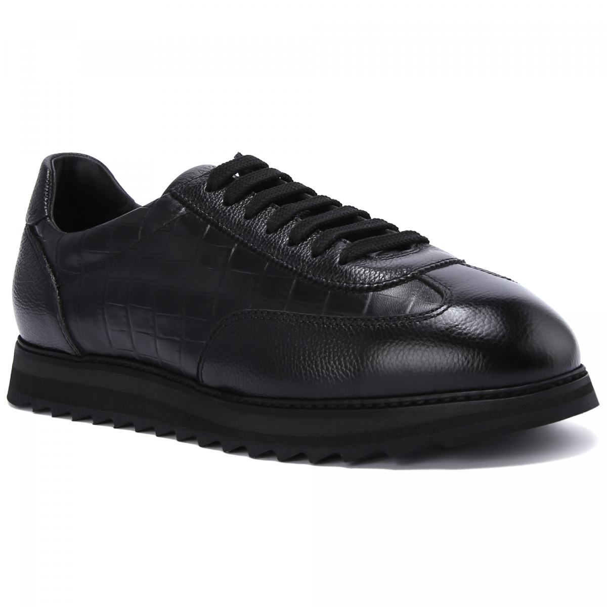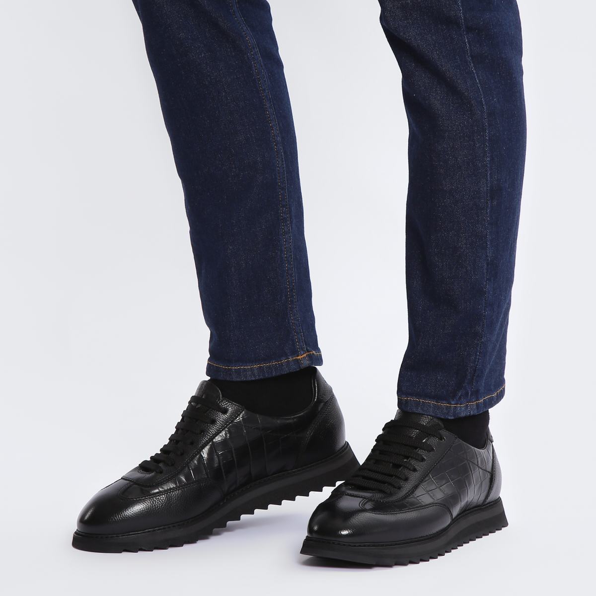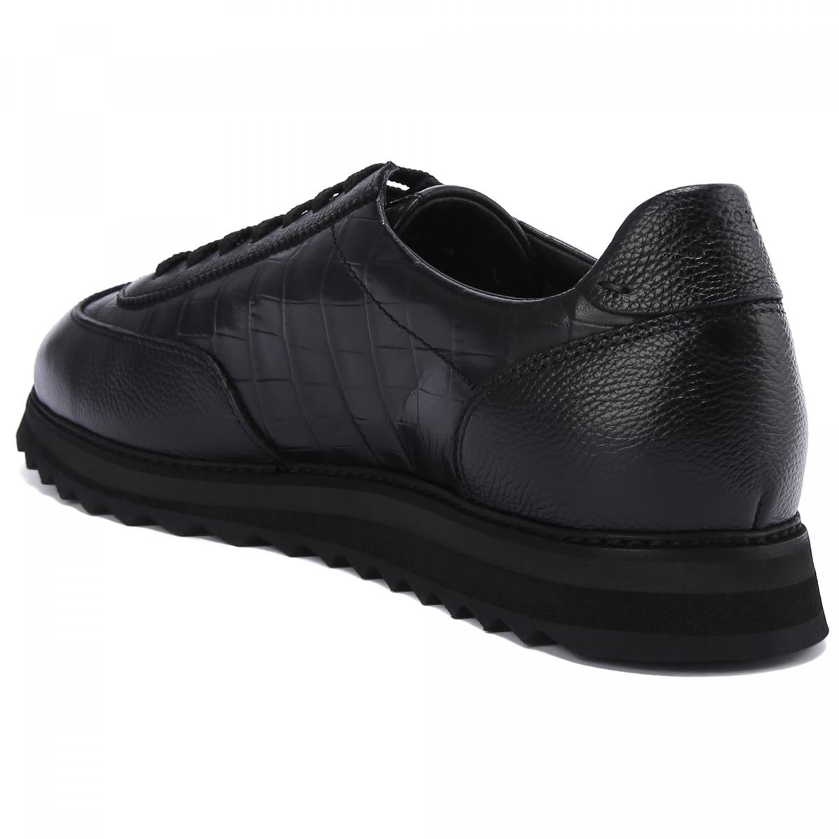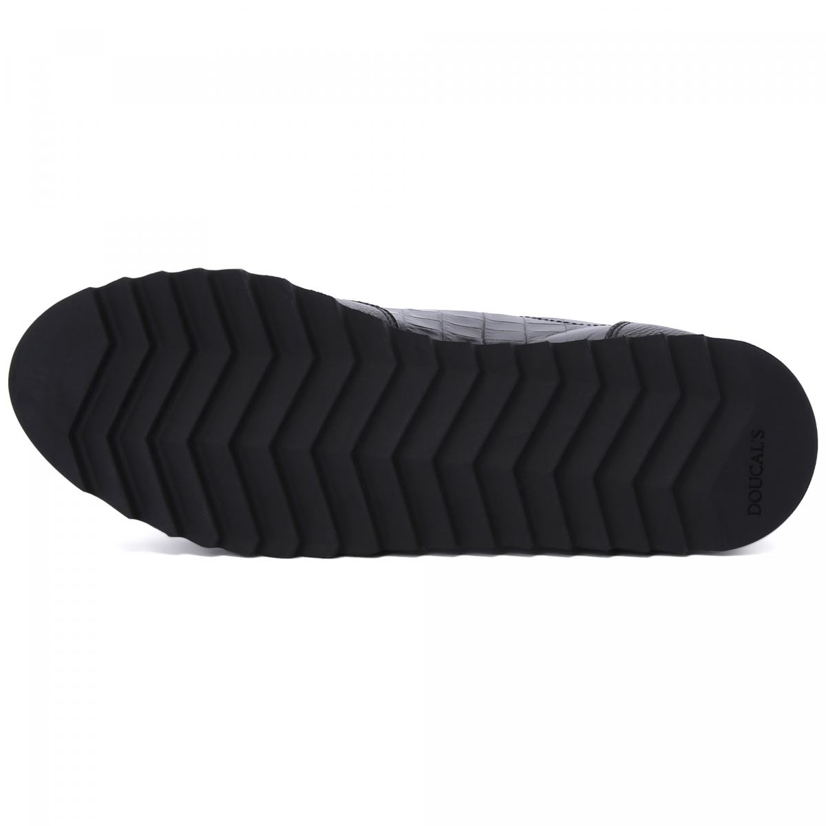 Кроссовки из натуральной кожи в чёрном цвете от Doucal’s. Стильные кроссовки из коллекции осень-зима дополнят городские образы. Верх выполнен из натуральной кожи с зернистой фактурой, а так же из кожи с тиснением под чешую. Внутри утеплённые шерстяная подкладка и стелька из натурального меха. Подошва с рифлёным протектором выполнена из резины.