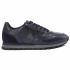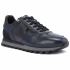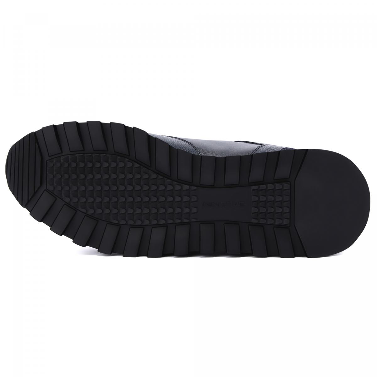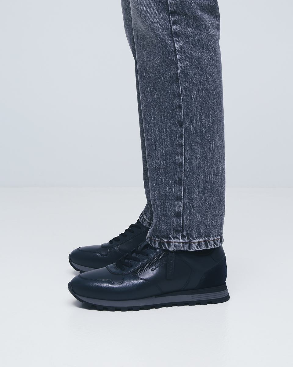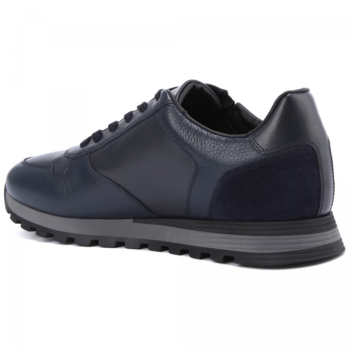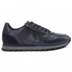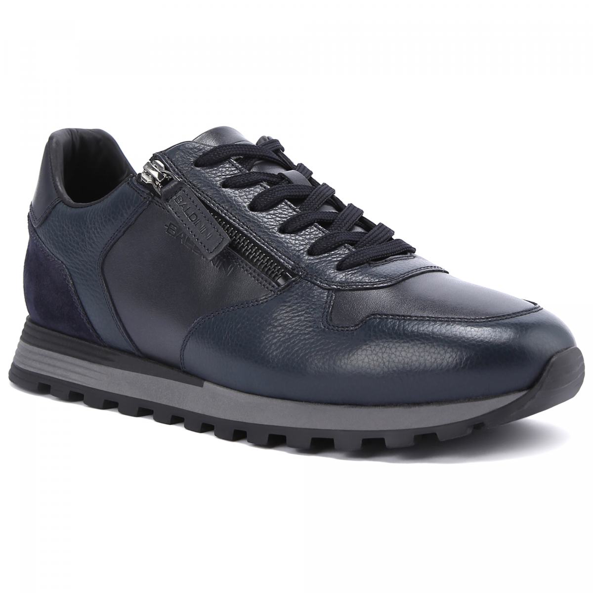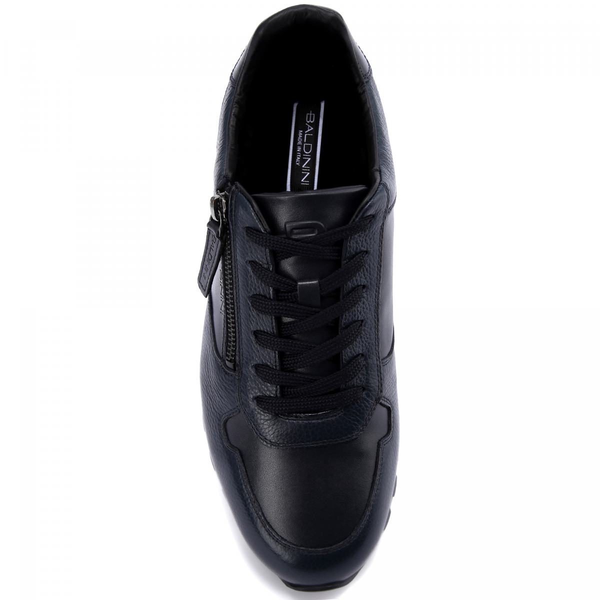 Кроссовки из натуральной кожи в тёмно-синем цвете от Baldinini Надежные кроссовки, сочетающие в себе удобство и стиль. Сочетание шероховатой и лакированной кожи черного цвета создает игру света и тени. Резиновая подошва, застежка-молния и фирменный логотип сбоку завершают образ. Подкладка и стелька выполнены из натурального меха.