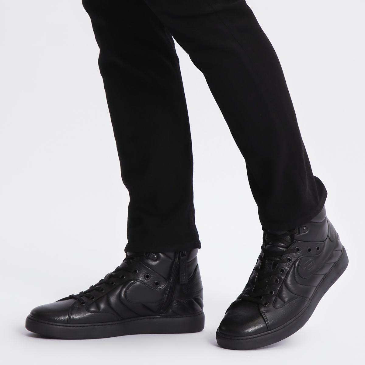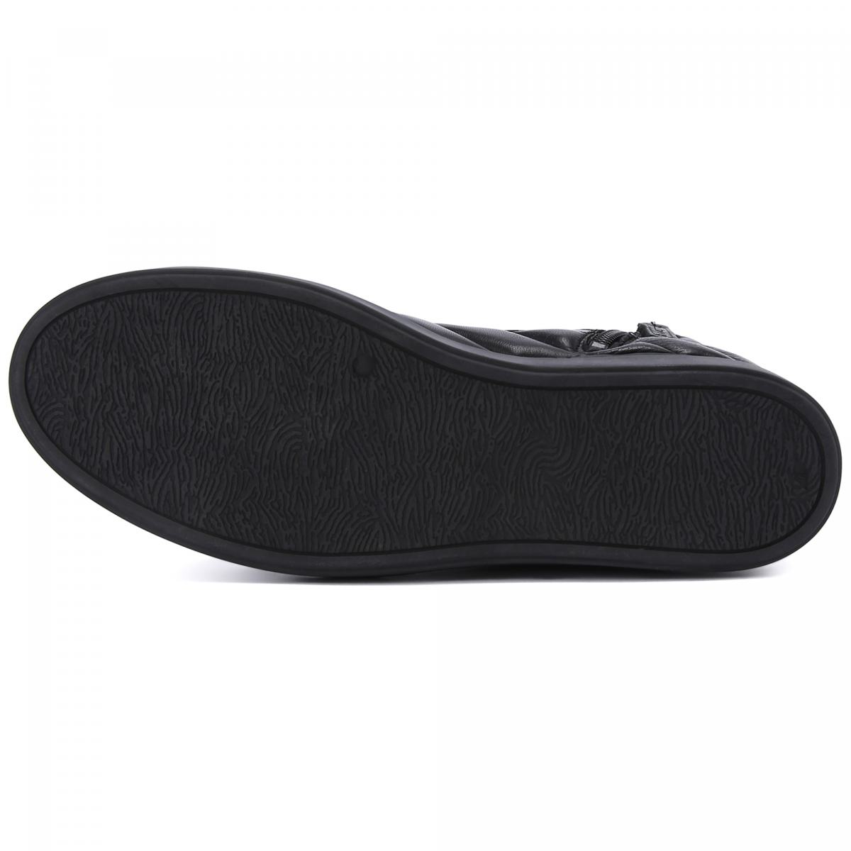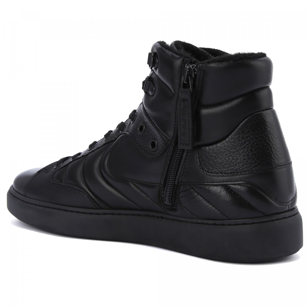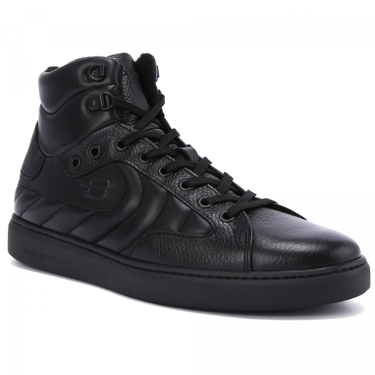 Высокие кроссовки в чёрном цвете от Baldinini отлично впишутся в стиль casual и дополнят джинсы в любом оттенке. Модель выполнена из гладкой и зернистой натуральной кожи и украшены строчкой. Внутри шерстяной подклад и стелька из натуральной кожи, подошва — из резины. Сбоку пара дополнена вышивкой с буквой B, что не только сообщает о принадлежности к бренду, но и разбавляет дизайн. Практичная молния сбоку позволит удобно снимать и надевать пару.