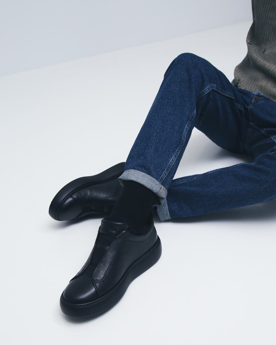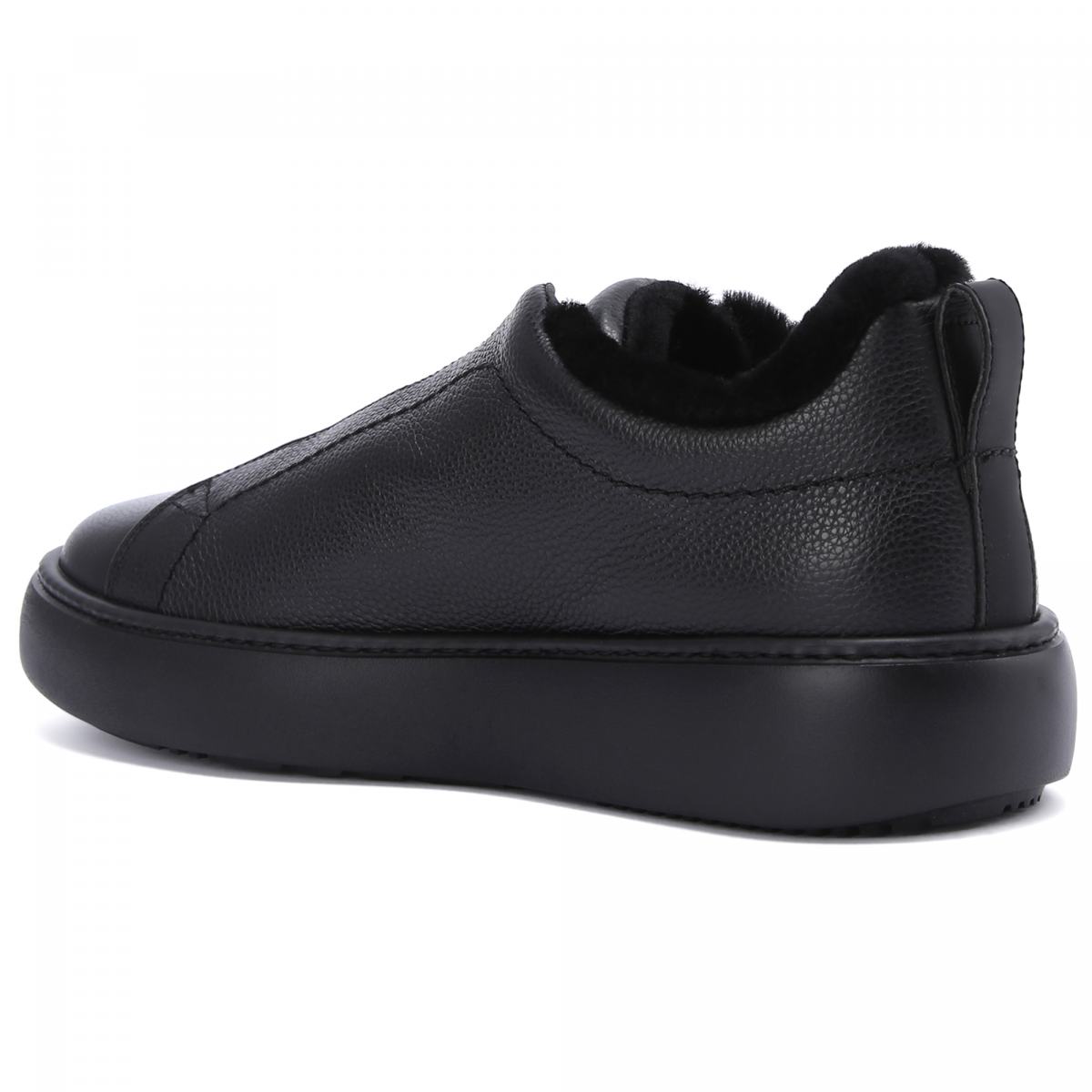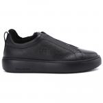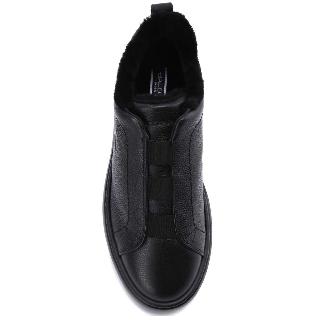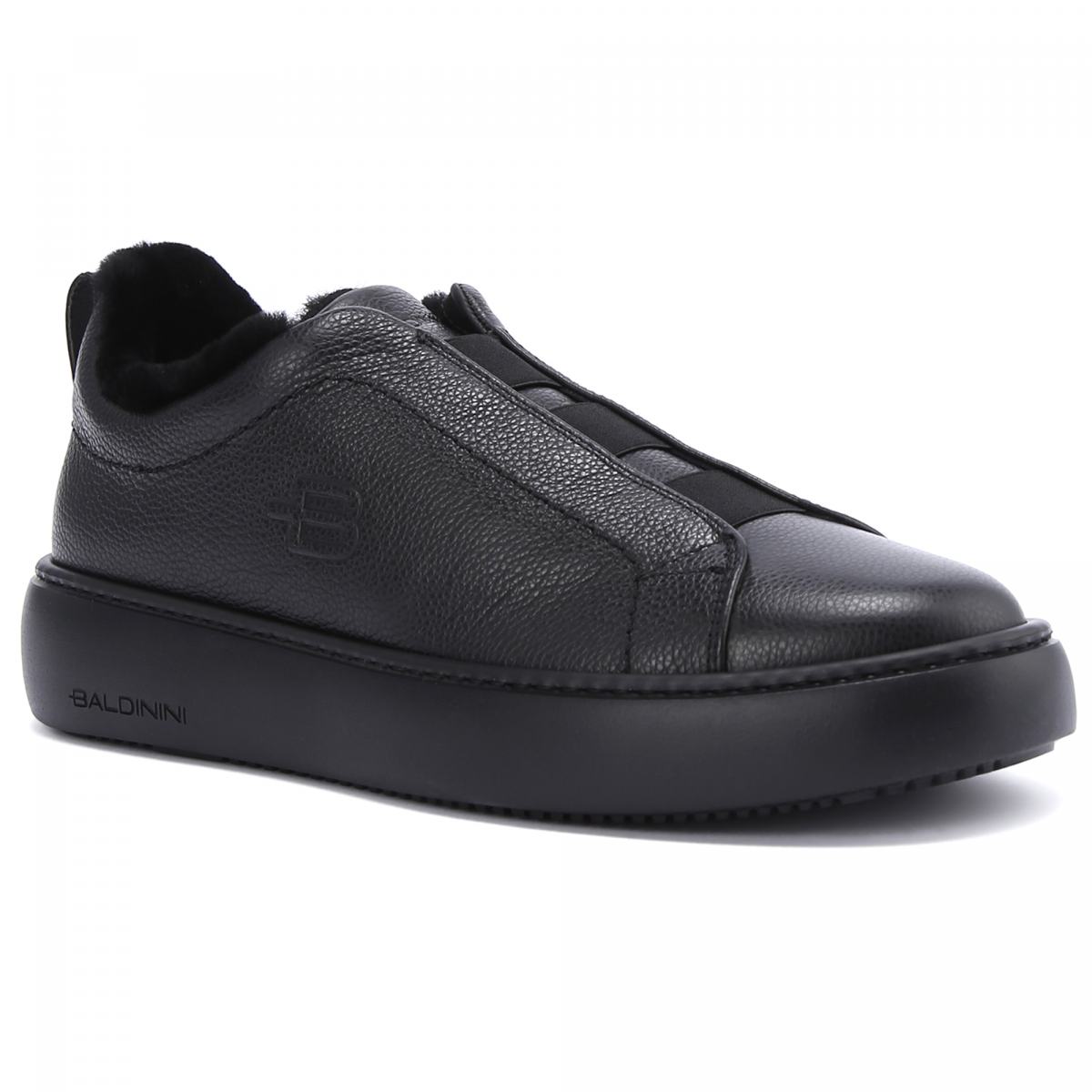 Чёрные кроссовки из кожи от Baldinini. В отличие от обычных теннисных кроссовок, эта модель представлена с эластичными резинками вместо шнурков. Толстая резиновая подошва с фирменным логотипом завершает образ. Внутри тёплые подкладка и стелька из натурального меха.