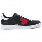Кеды из чёрной кожи от DSQUARED2. Пара в городским стиле удачно сочетается с джинсами и куртками. Верх выполнен из натуральной чёрной кожи с контрастными элементами дизайна: белым задником и крупным кленовым листом красного цвета сбоку. Подошва выполнена из резины, подкладка - из текстильной ткани, а стелька - из натуральной кожи.