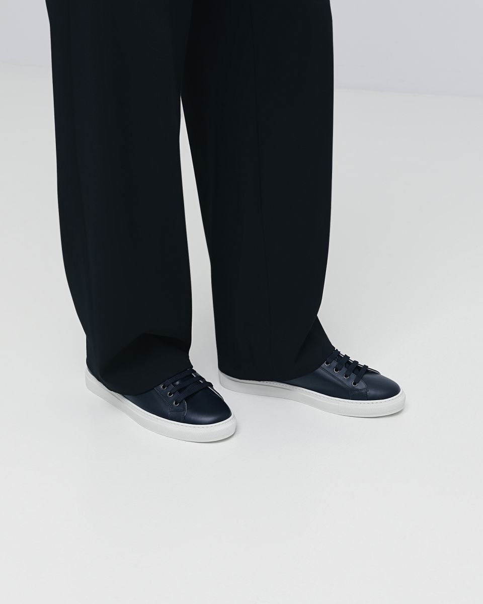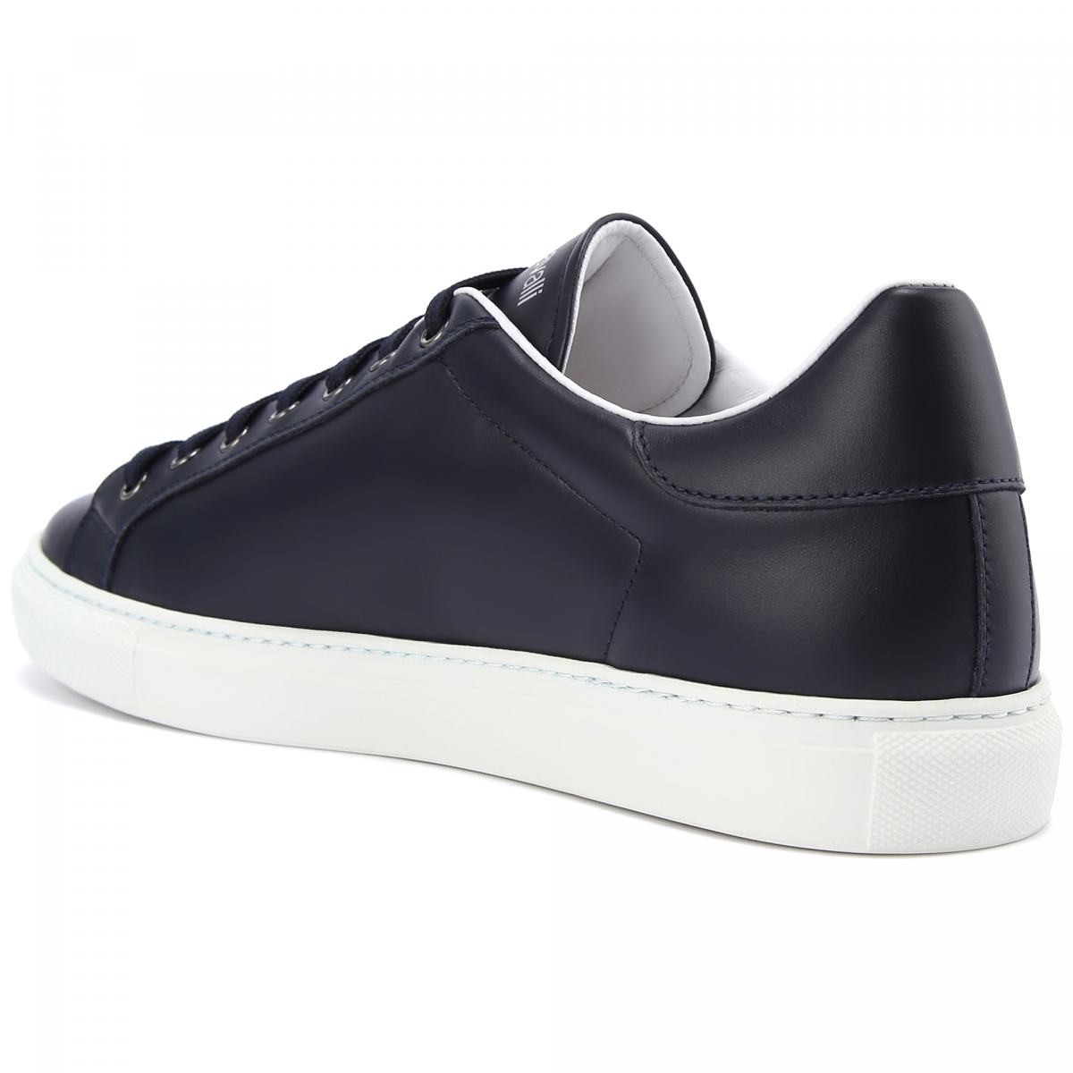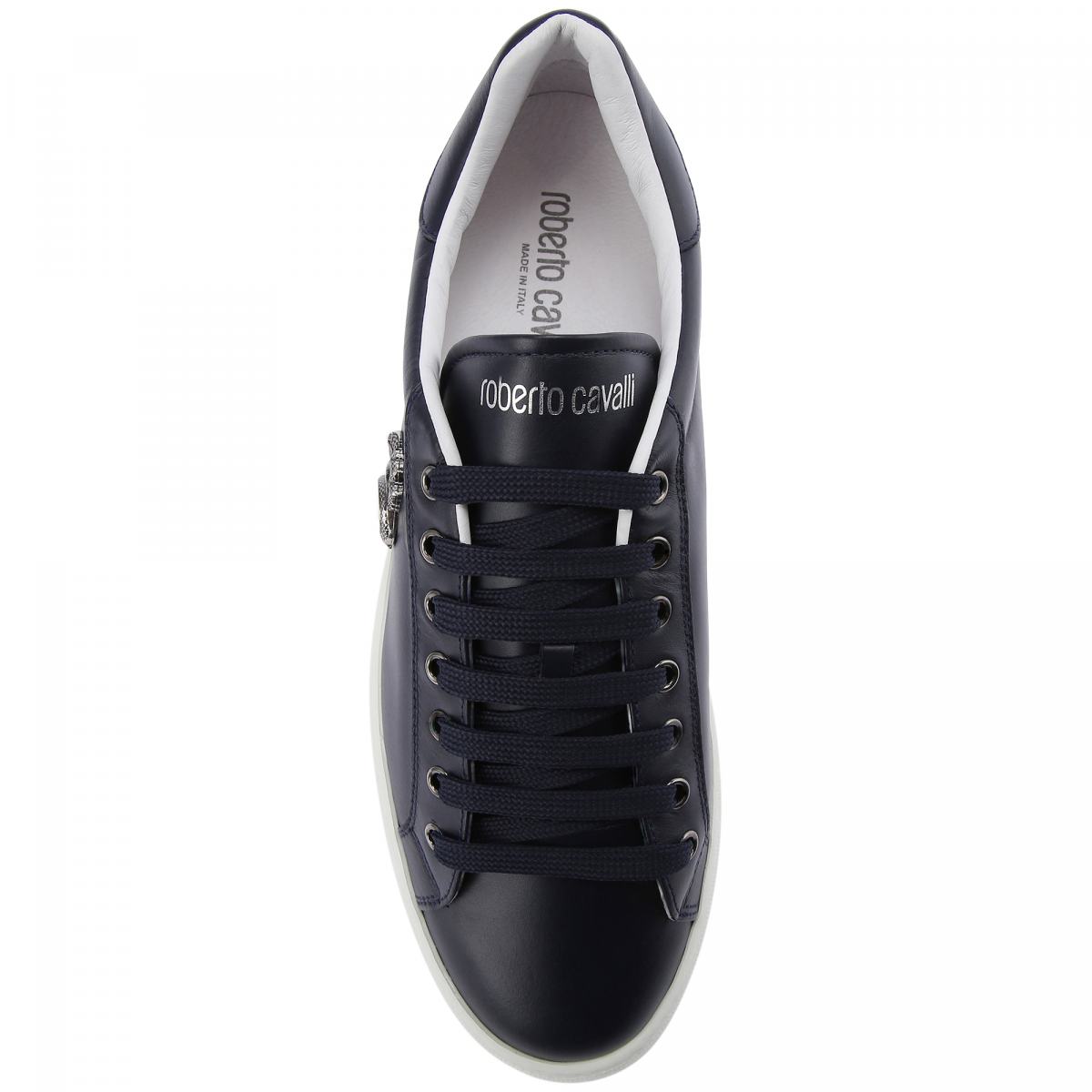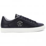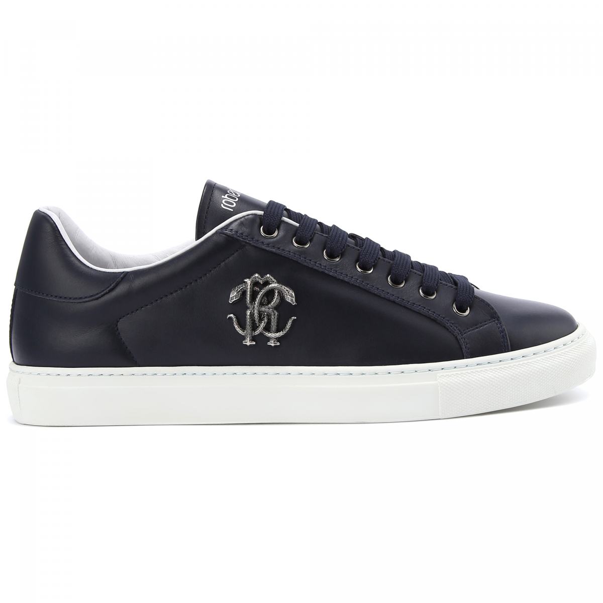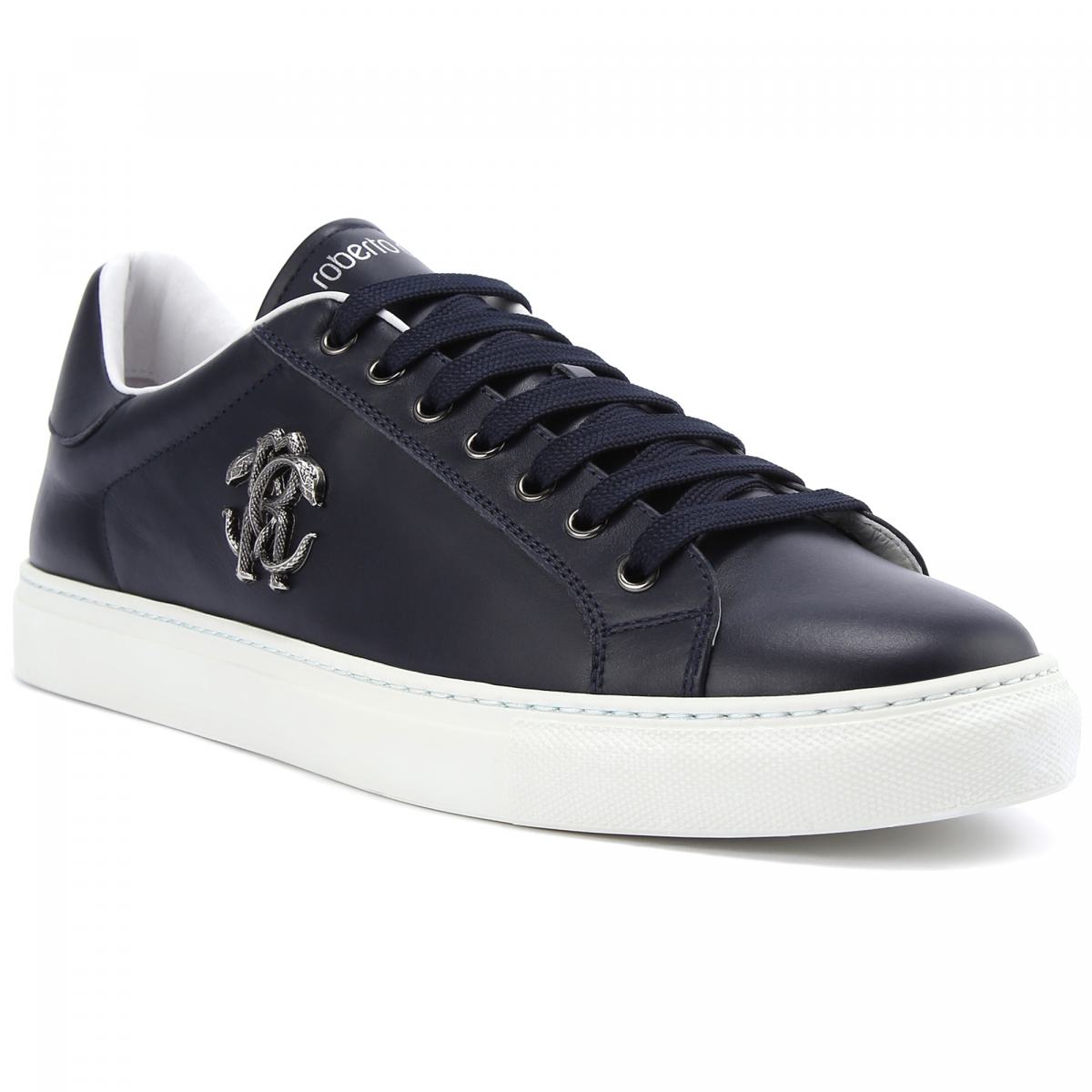 Кеды в тёмно-синем цвете из кожи от Roberto Cavalli. Пара в сдержанном дизайне подойдёт к любому образу. Кеды дополняют фирменные элементы: металлическая монограмма сбоку и лейбл на язычке. Высокая белая подошва из резины и текстильная шнуровка в цвет завершают образ.