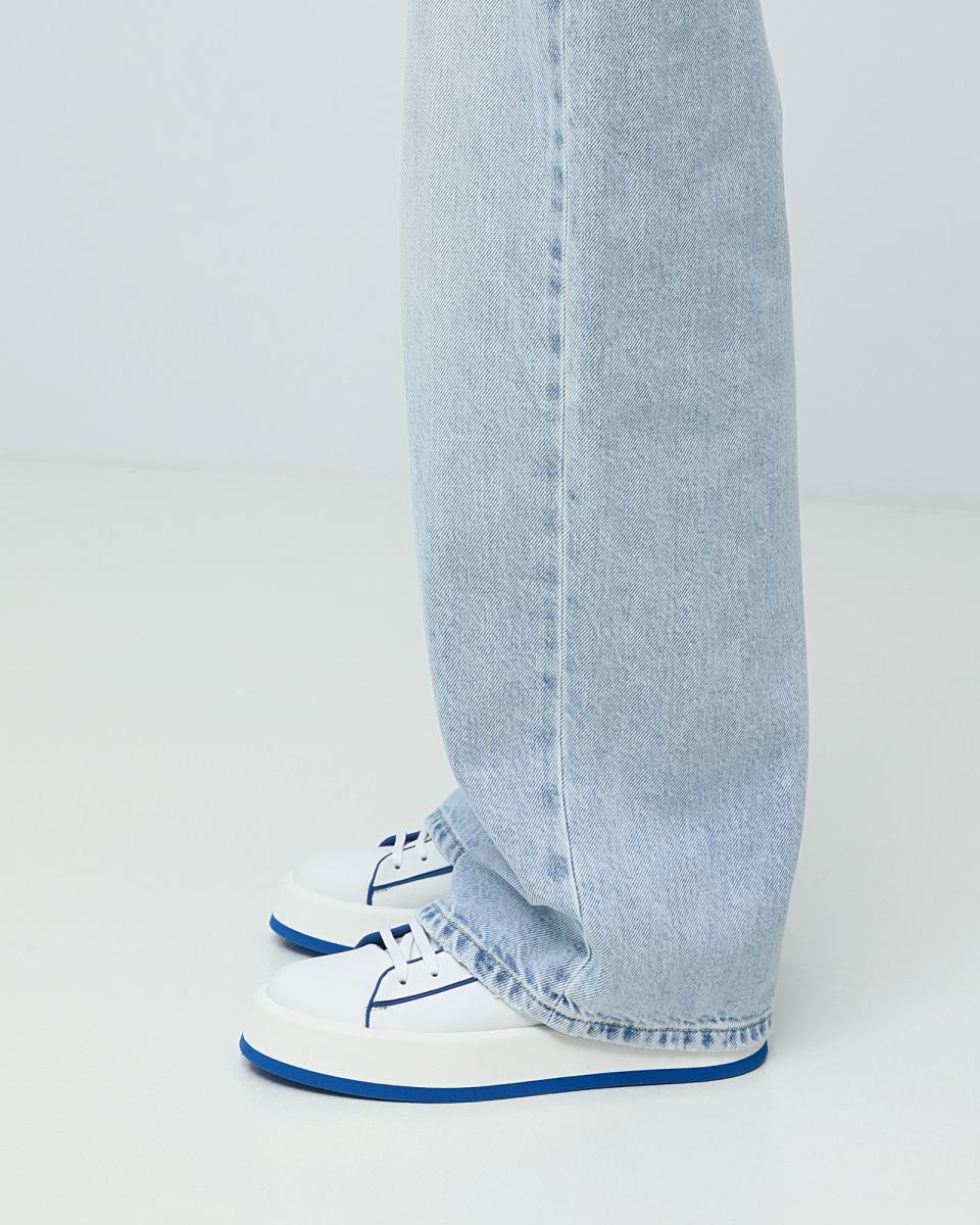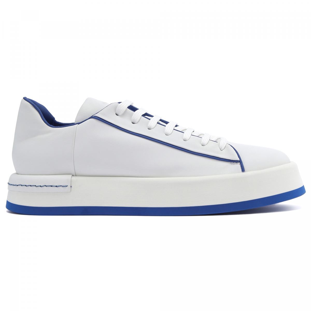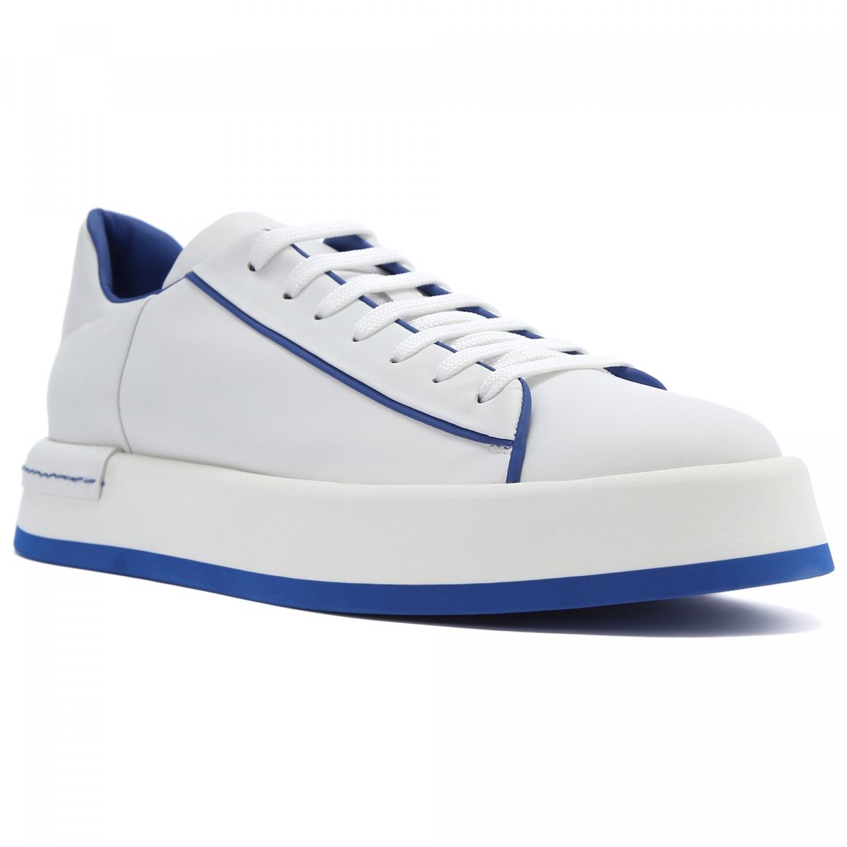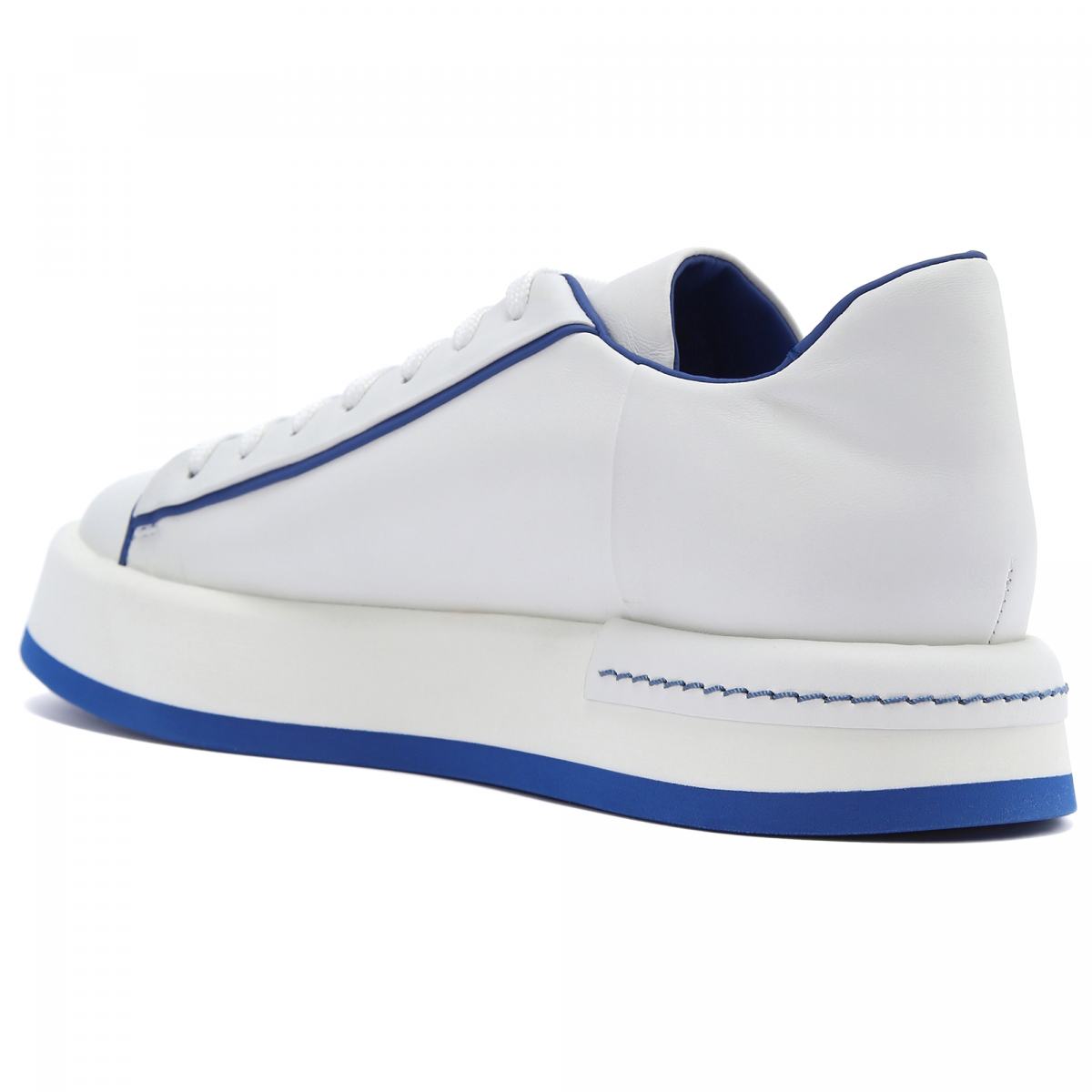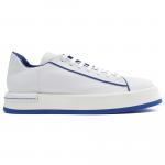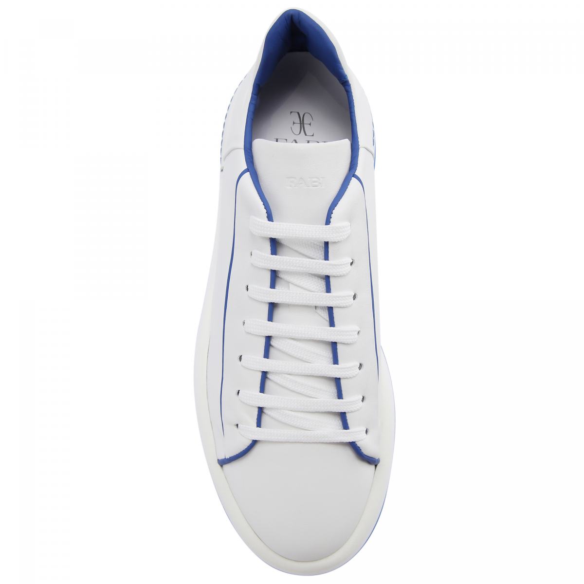 Кроссовки из натуральной белой кожи от Fabi. Пара в стиле casual подойдёт в роли повседневной обуви для прогулок, которую можно носить как с джинсами, так и с платьями. Верх из белой кожи дополнен контрастными вставками синего цвета и лёгкой резиновой подошвой. Внутри кожаные подкладка и стелька.