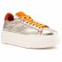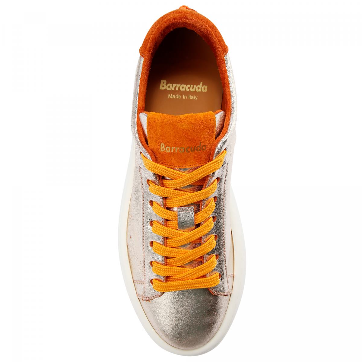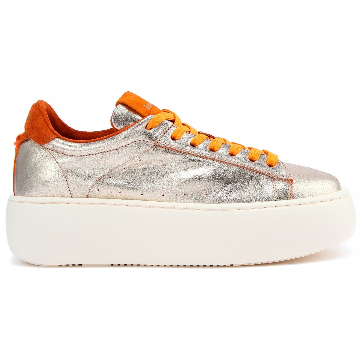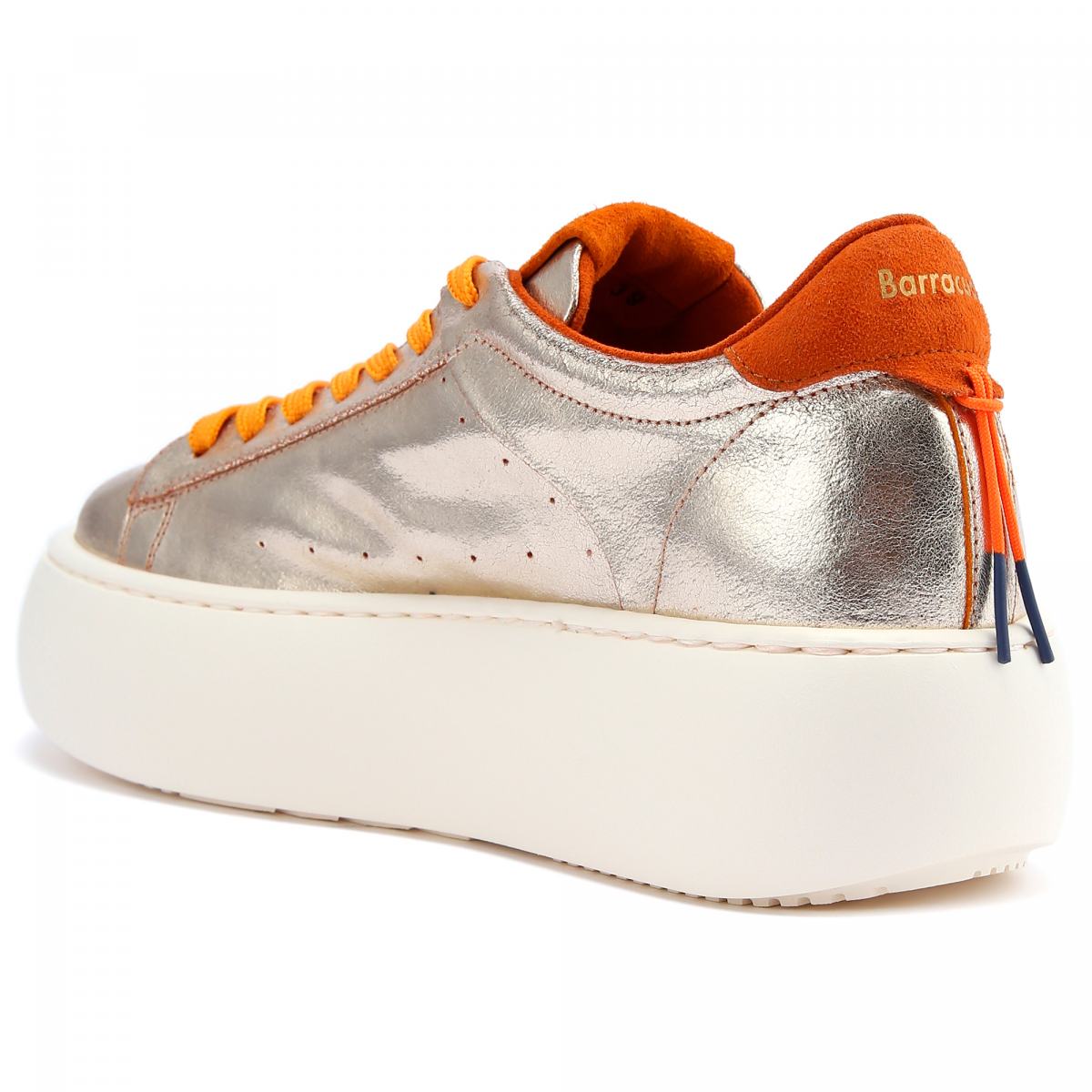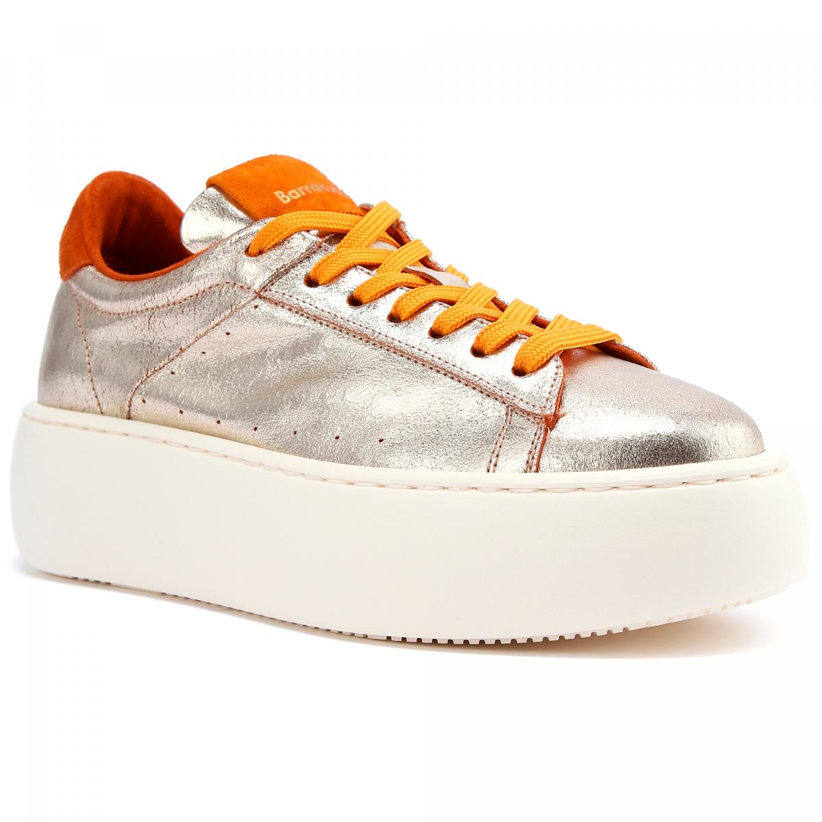 Кроссовки в золотом цвете из кожи от Barracuda. Новинка этого сезона — кроссовки Bolla для тех, кто любит высоту и стиль оверсайз. Блестящий верх выполнен из ультрамягкой тонкой кожи наппа, а высокая подошва белого цвета - из резины. Дизайн дополняет яркие оранжевые вставки из замши сзади и на язычке, а так же текстильная шнуровка оранжевого цвета. Модель с текстильной подкладкой и кожаной стелькой.